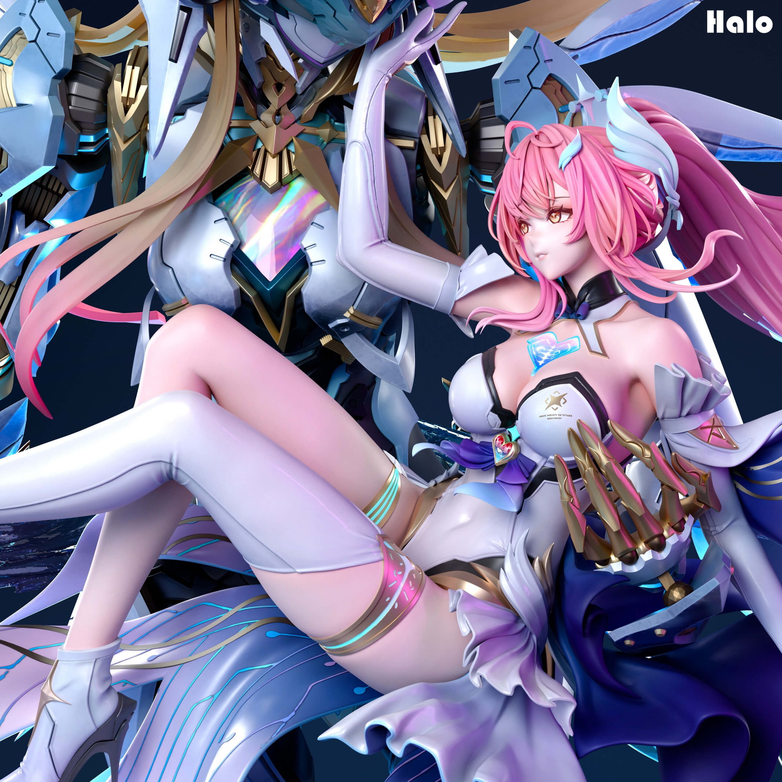 - Towering mech companion rising behind her, wings fully deployed in an explosive spread