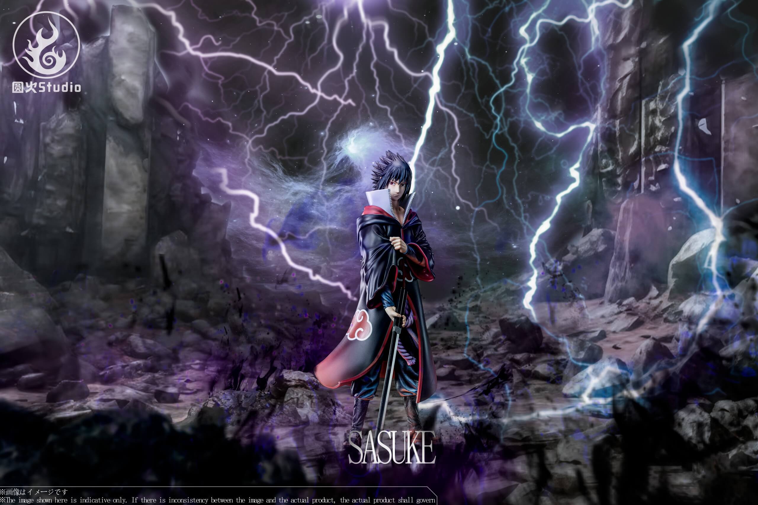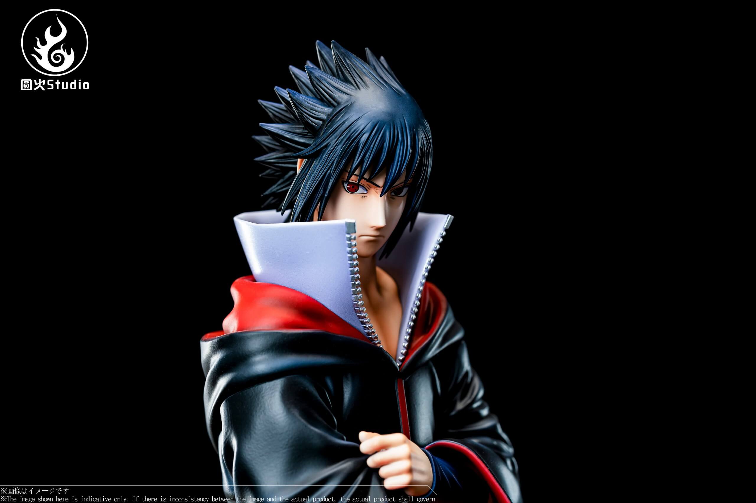 - Features Sasuke Uchiha in a museum-style pose, dressed in his signature Akatsuki cloak and grasping his chokutō sword.