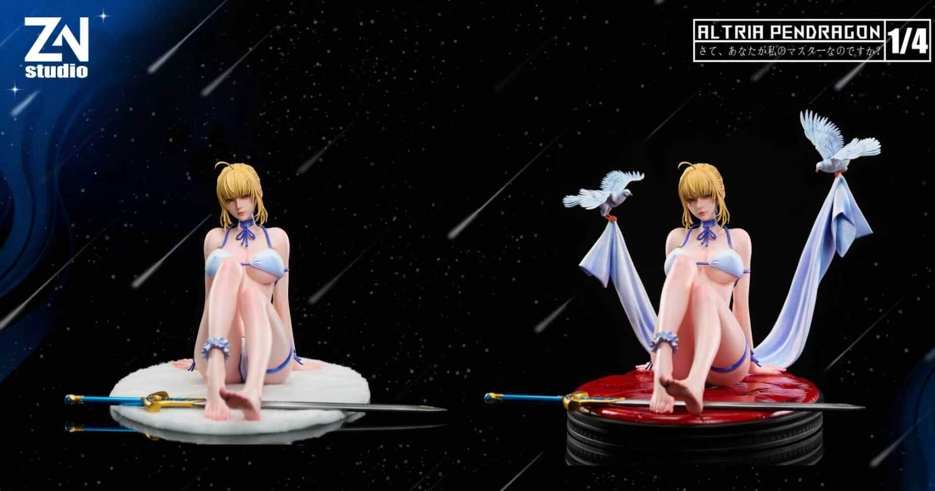 - Excalibur — resting beside her on the base, gold-and-blue detailing intact