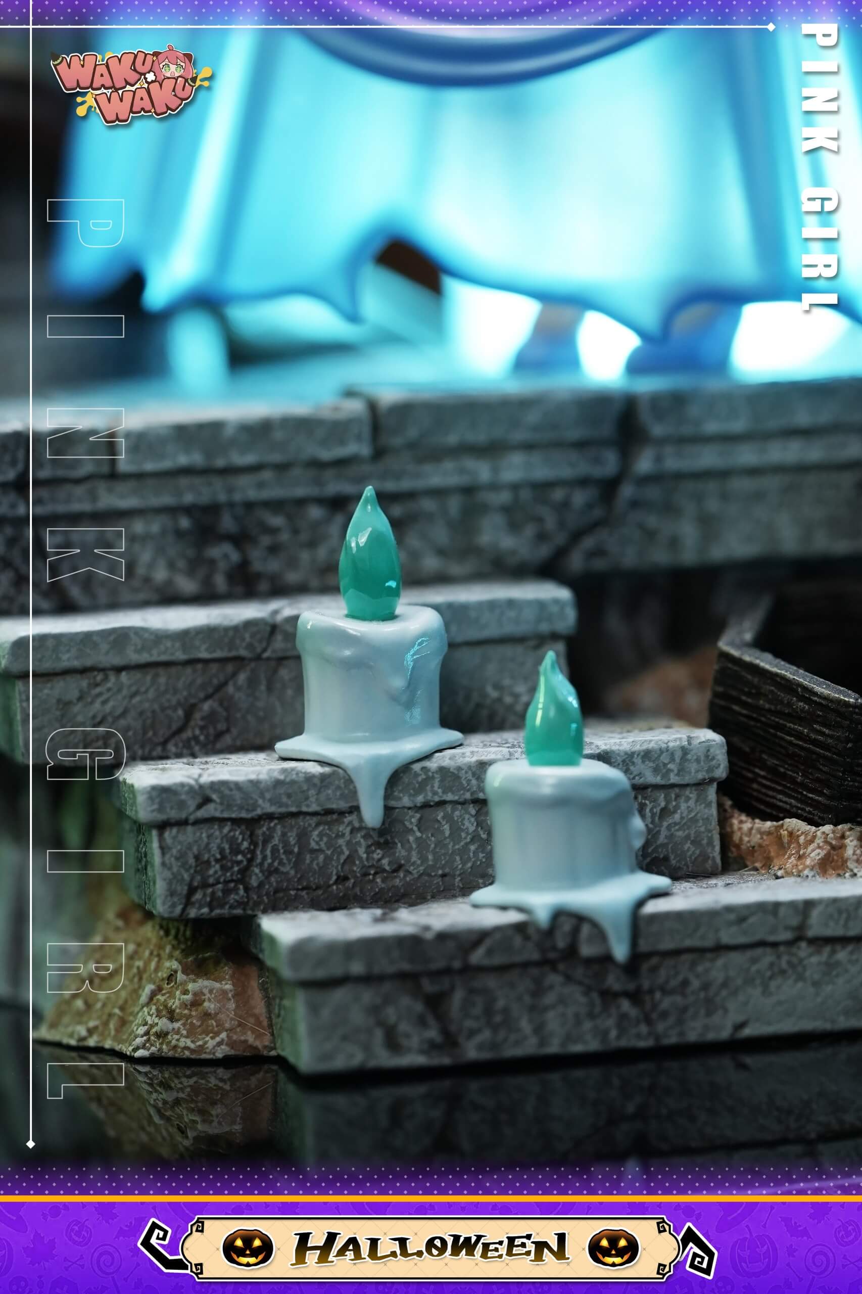 - Main figure in a ghostly evening gown with veil, cat-ear headband and floral tiara