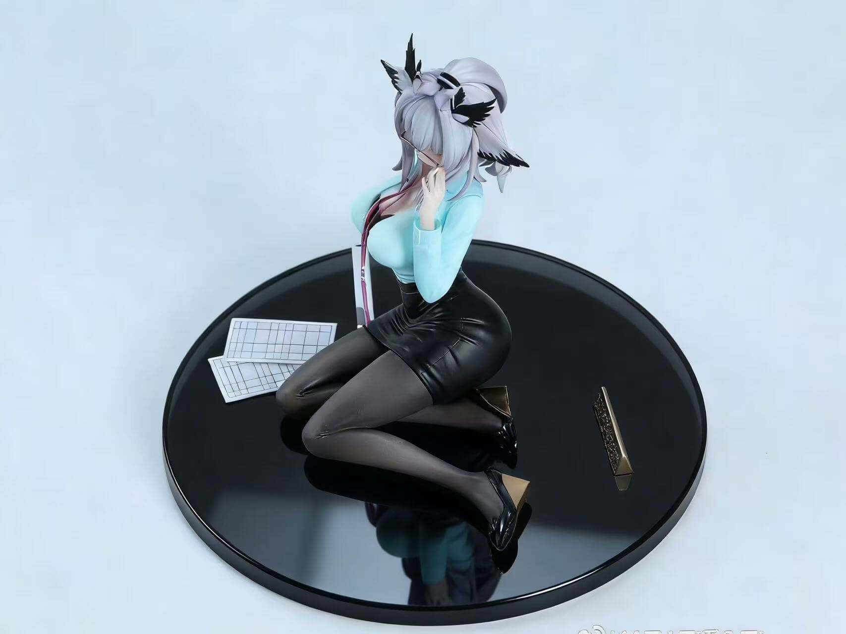 DY Studio’s OL Ver. Ptilopsis captures Arknights’ composed owl medic in an unexpectedly grounded office setting — seated at a desk’s edge, adjusting her glasses with trademark detachment. At 1/7 scale in eco-friendly resin and imported PU, the piece pairs delicate paint work on her silvery-lavender hair and translucent frames with a mirror-black base that reflects every angle. A quiet, character-driven display piece for collectors who appreciate personality over spectacle.