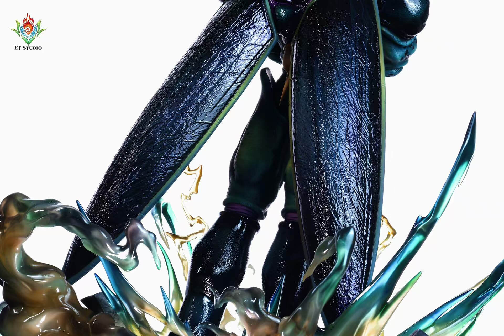 - Dynamic energy base with jagged green and gold ki discharge effects erupting from cracked stone terrain