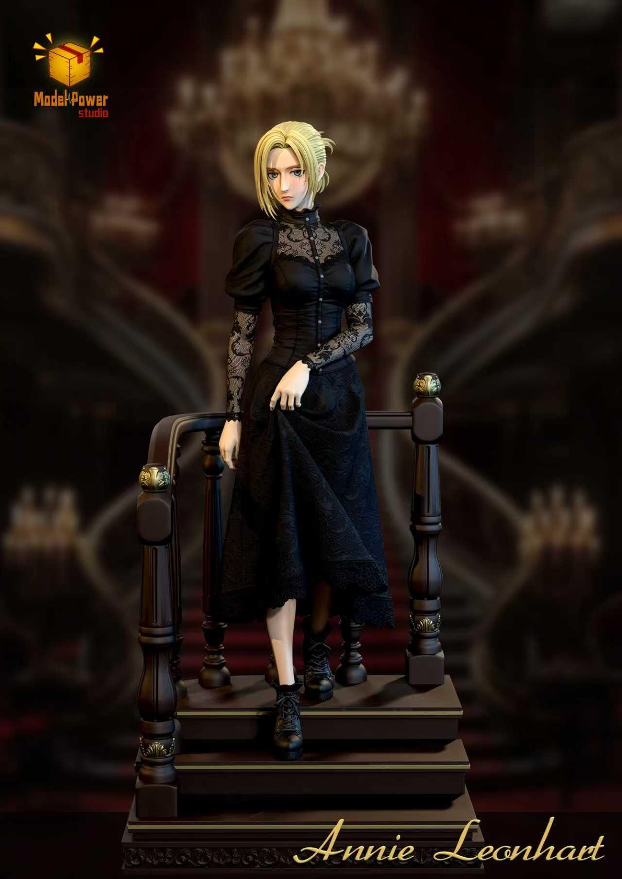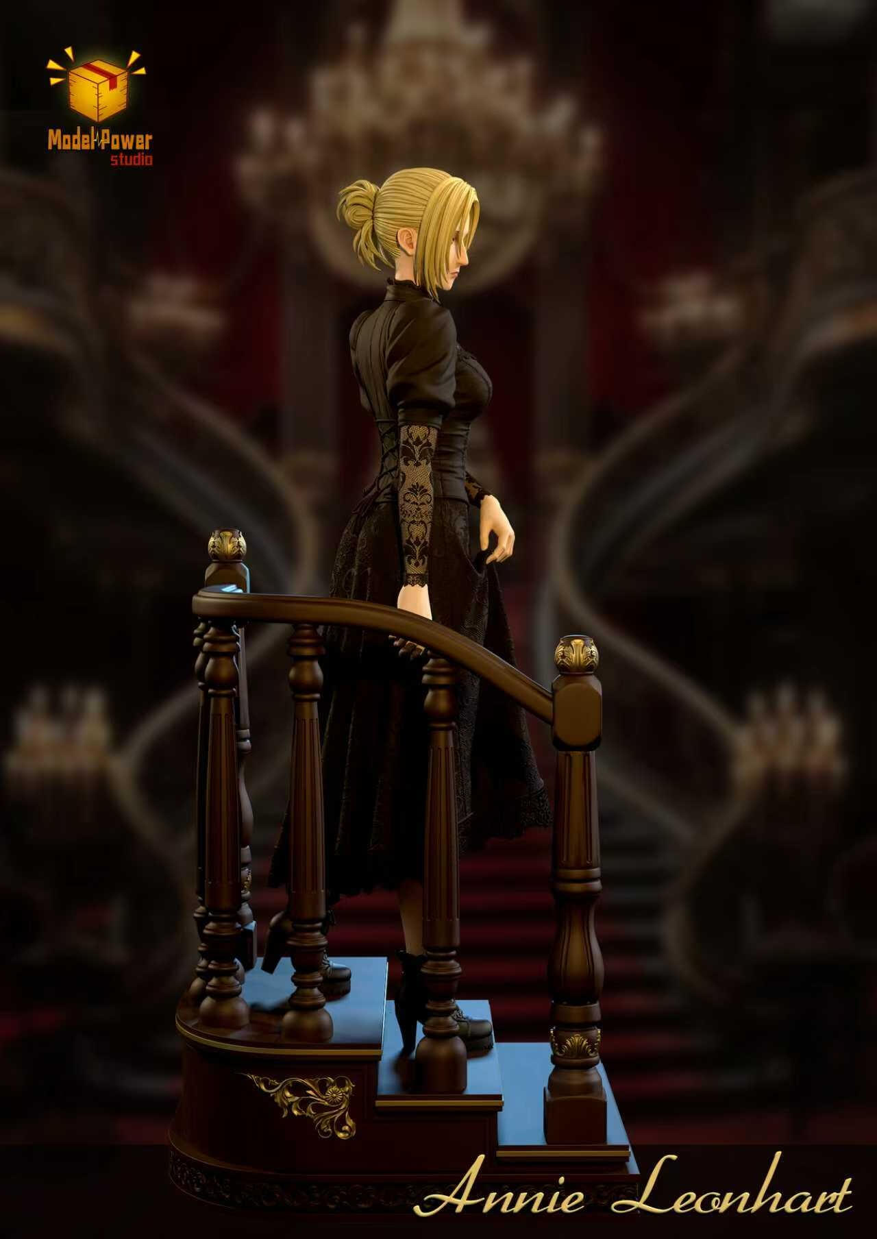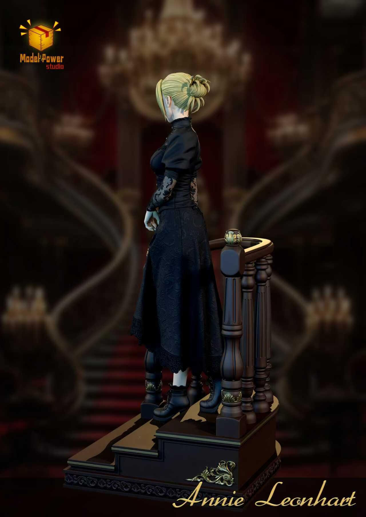 - Annie Leonhart figure in Victorian-gothic evening gown with intricate lace paneling and corset-laced bodice