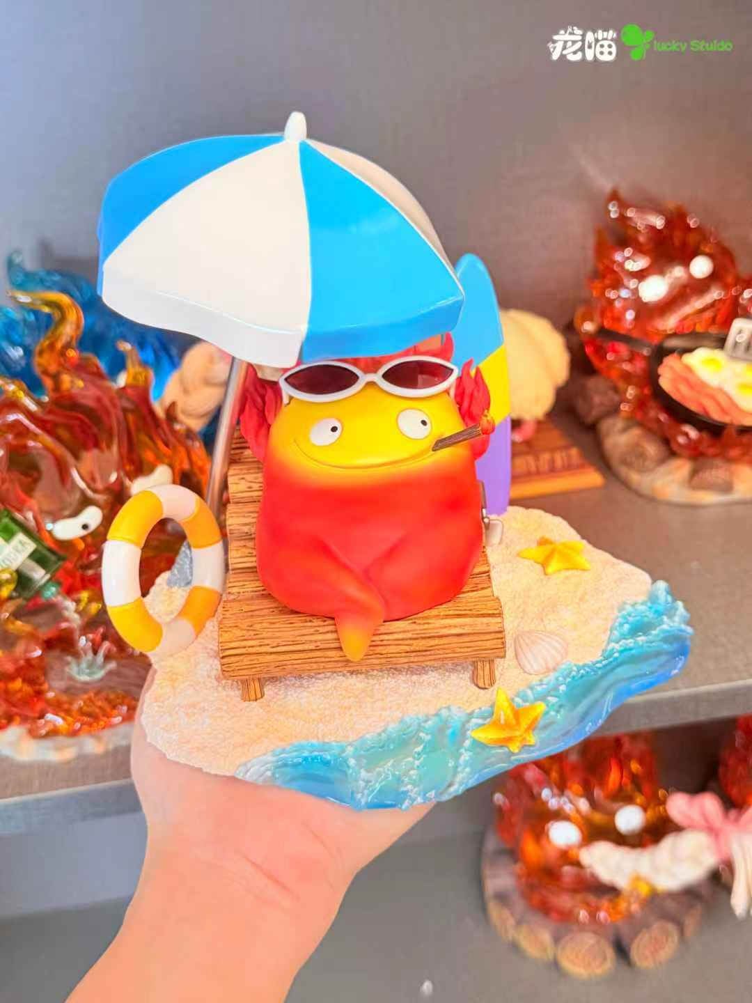 What the Transparent Version adds: the translucent Calcifer body transforms the piece under direct light, shifting from a solid character figure into something that genuinely feels lit from within — a meaningful distinction for display collectors who work with shelf lighting.