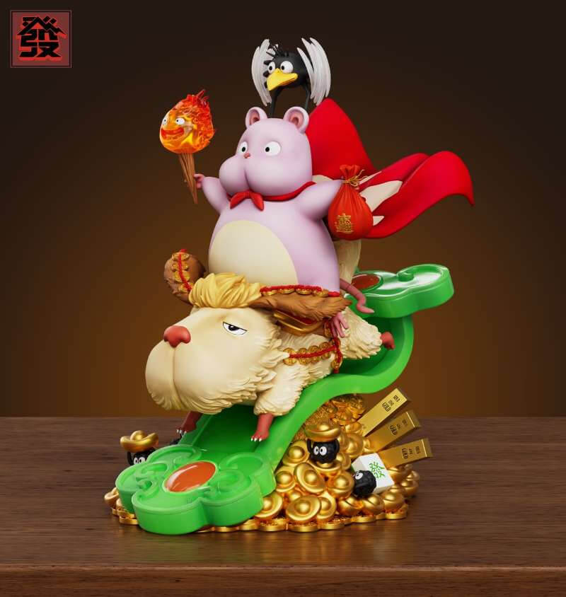 - Boh sculpt โ reimagined as a plump, red-caped fortune deity clutching a lucky money bag, riding atop Heen with unmistakable self-satisfaction