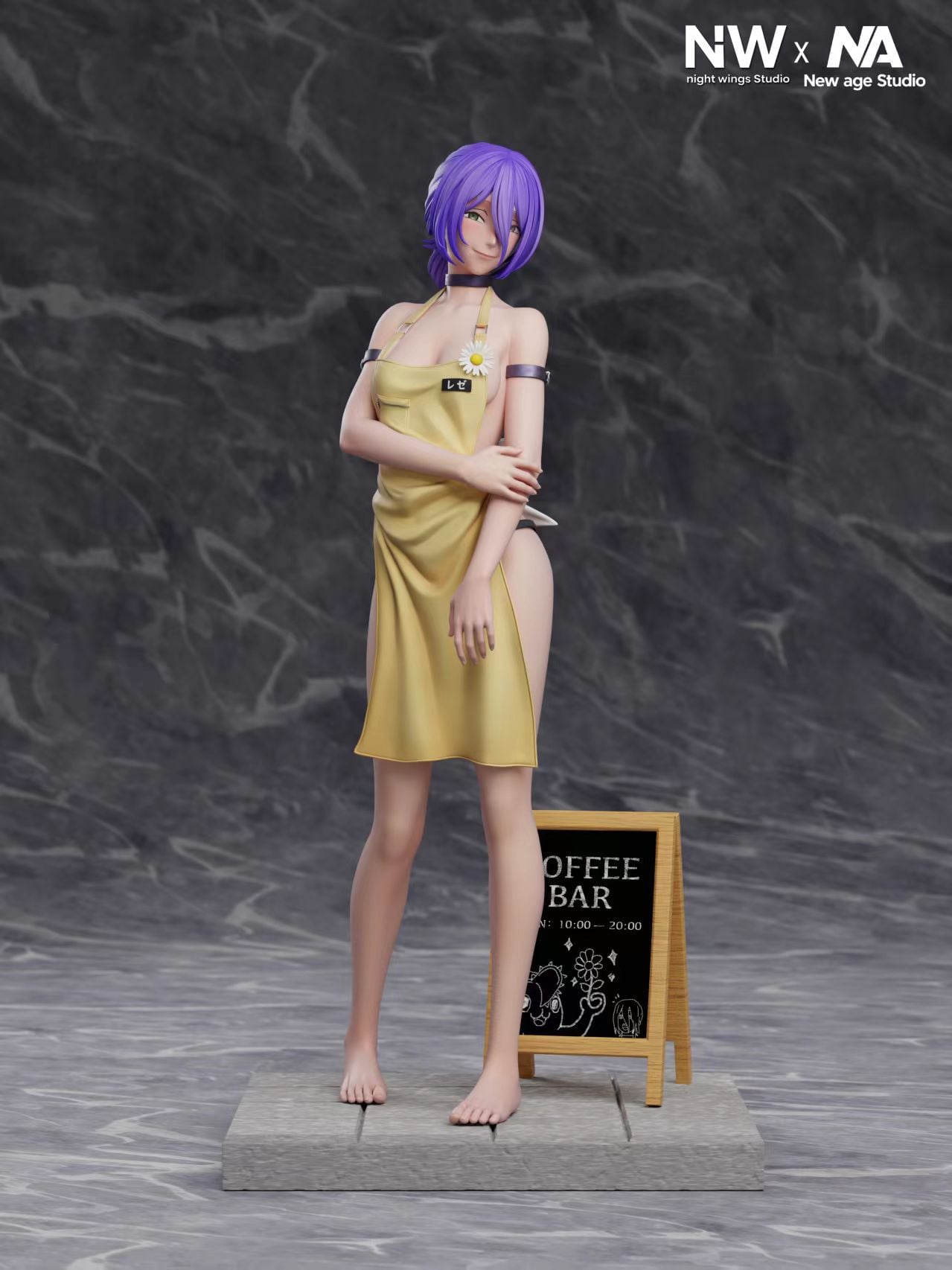 - Apron Version: Reze in a yellow café apron with name tag and bare feet, holding a daisy, displayed on the shared pavement base with coffee bar signboard.