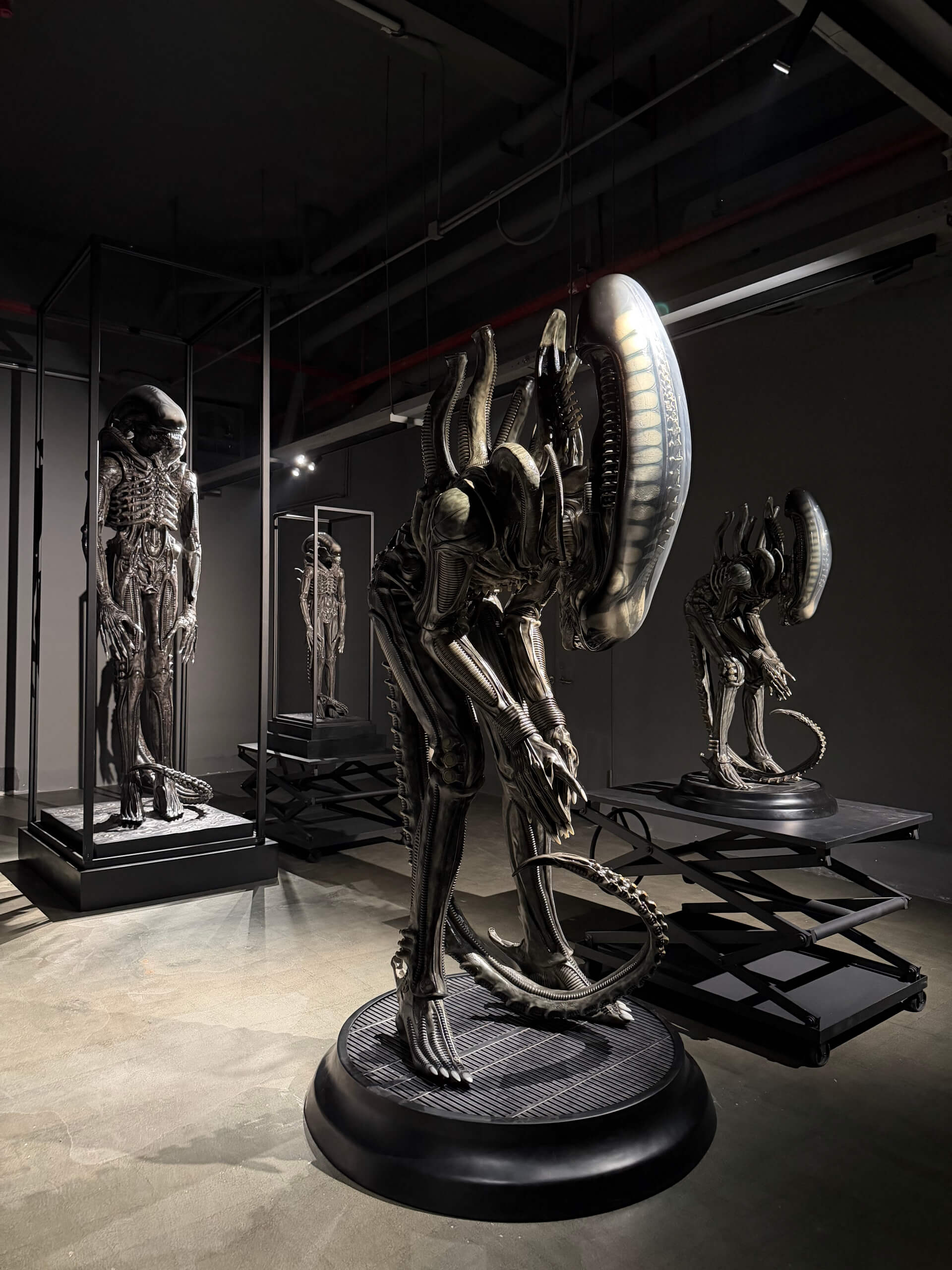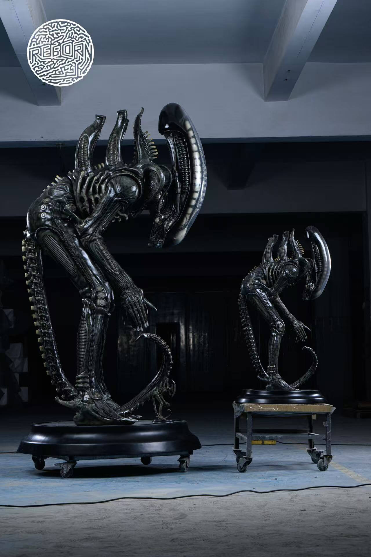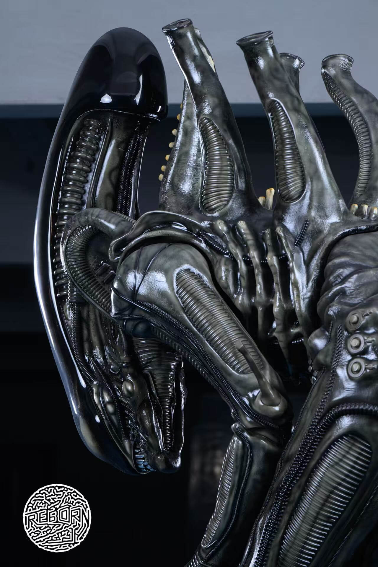 - Single pose — the Xenomorph captured in a deep forward bow, elongated skull inclined toward the ground in a posture that reads as equal parts reverence and coiled menace