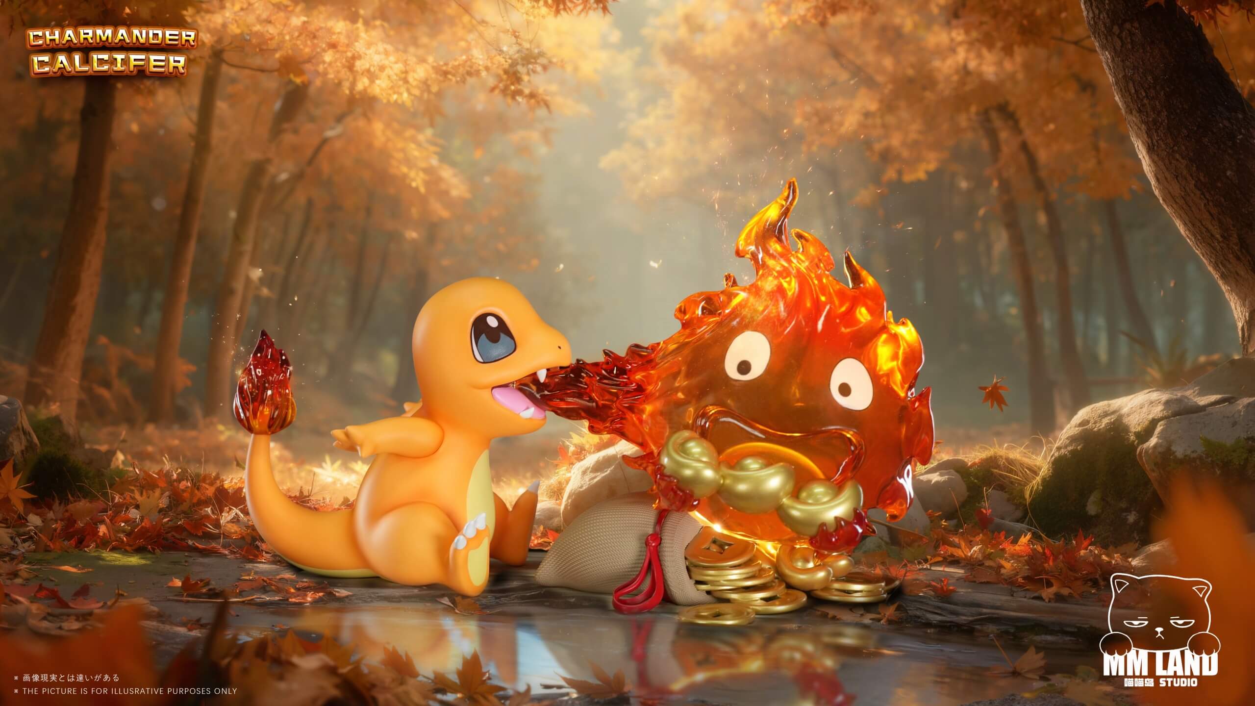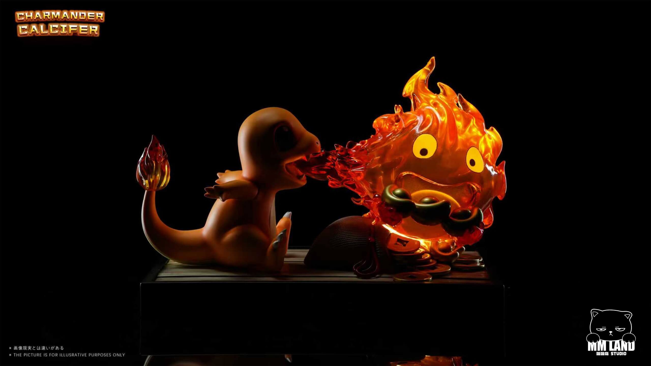 - Features a chibi-style Charmander sharing its flame with the fire demon Calcifer.
