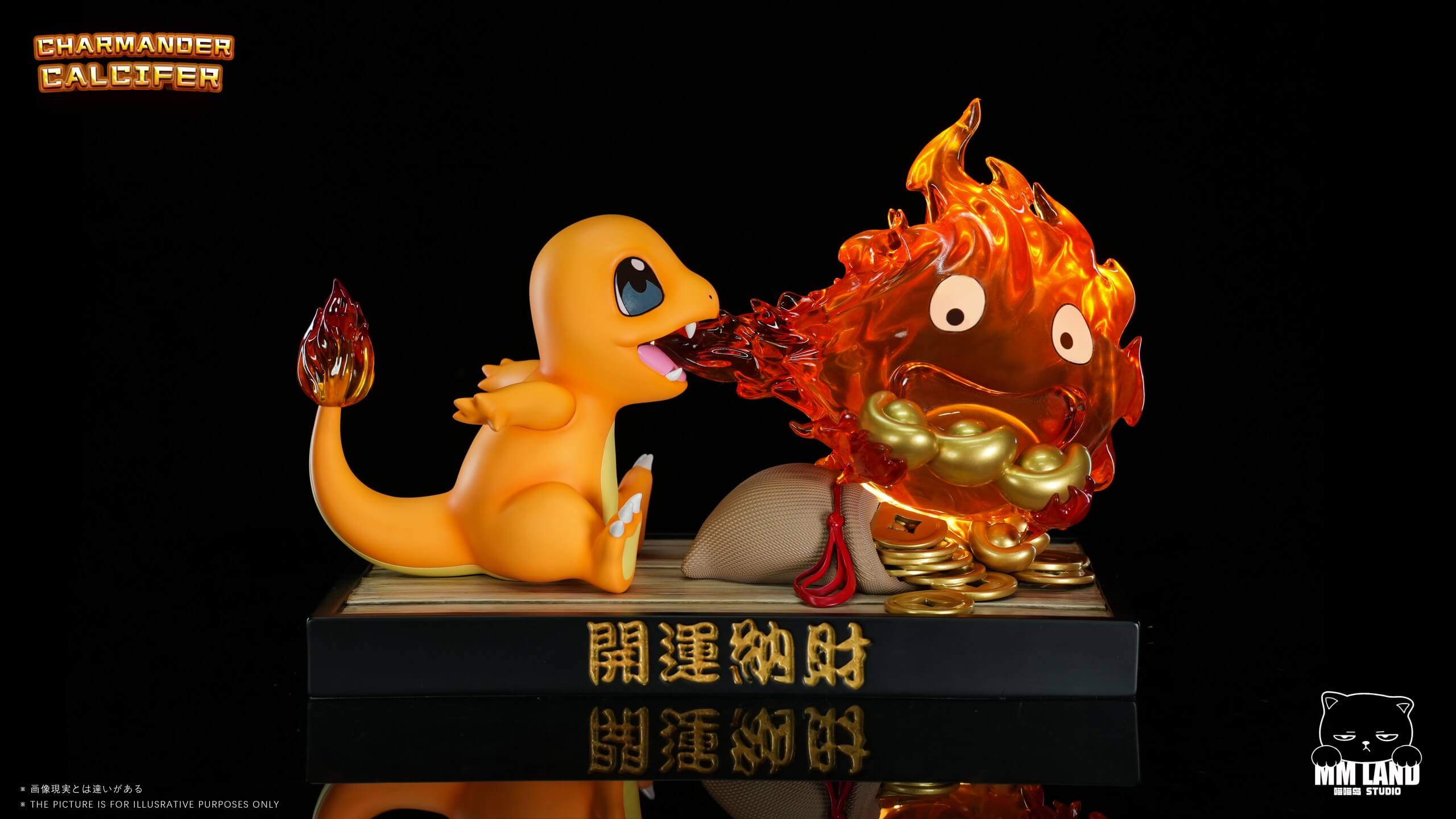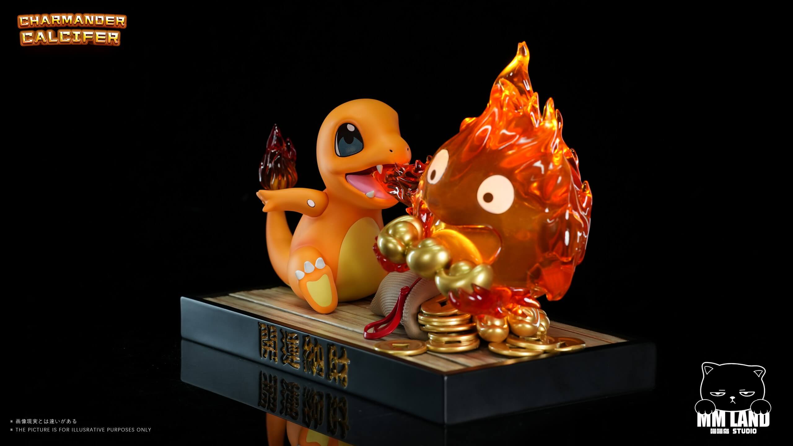 - Large translucent Calcifer flame sculpt with expressive eyes, cradling a ring of gold coins.