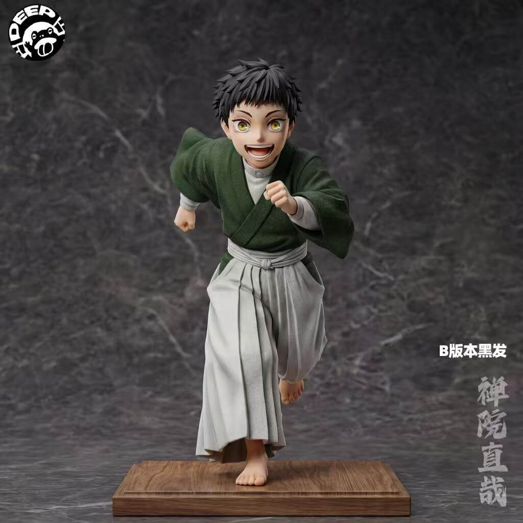 - Version A — Blonde hair sculpt; golden-yellow haori with white hakama; barefoot mid-stride pose on wood-grain rectangular base