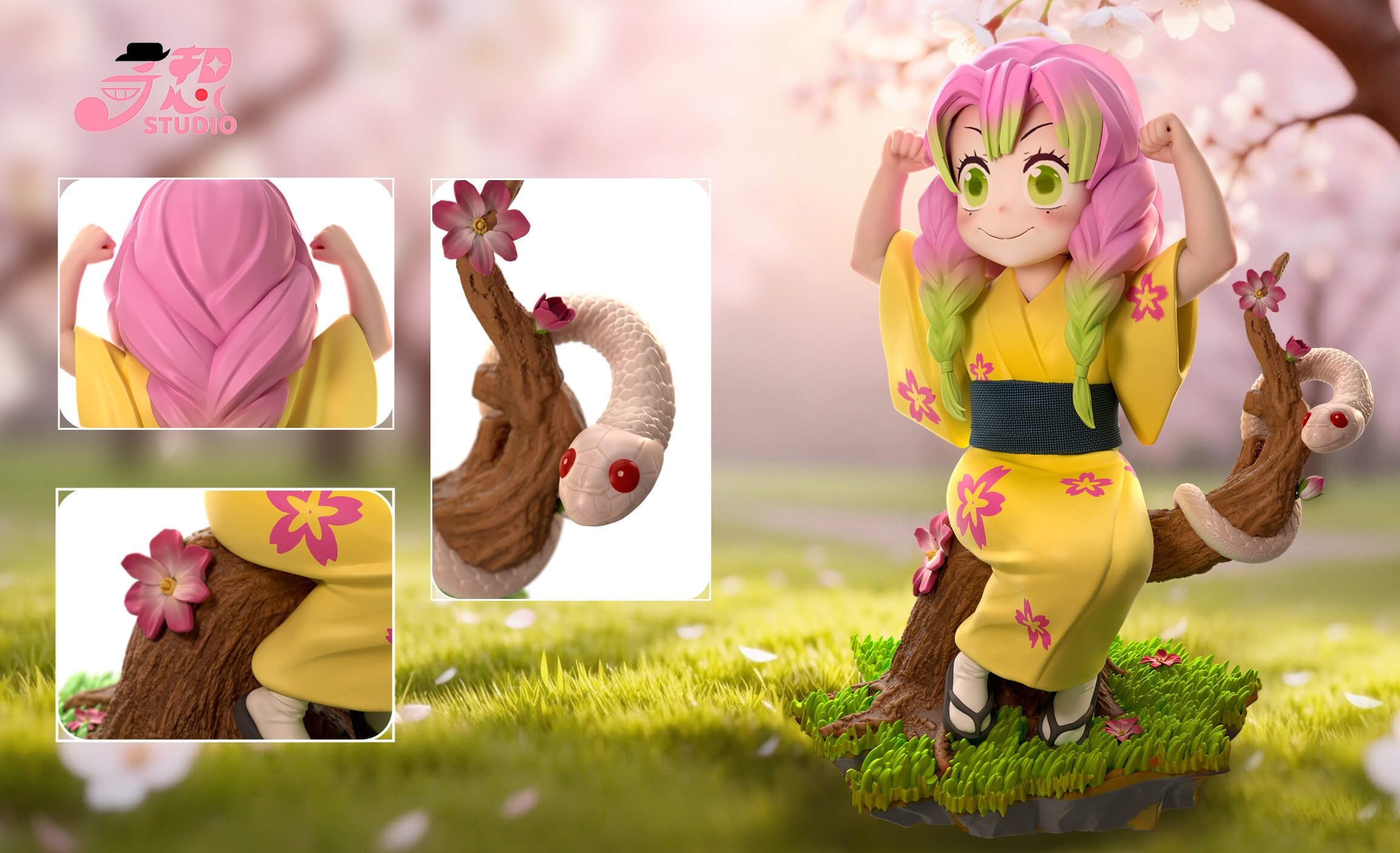- Young Mitsuri figure in a yellow floral kimono, seated on a tree stump.