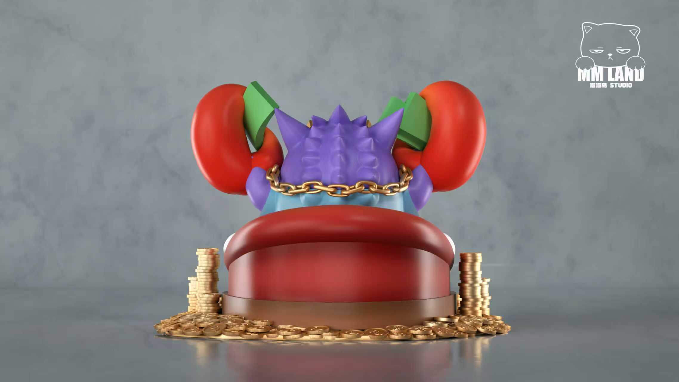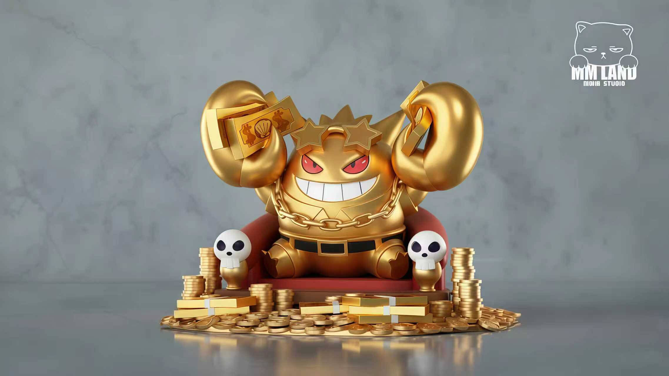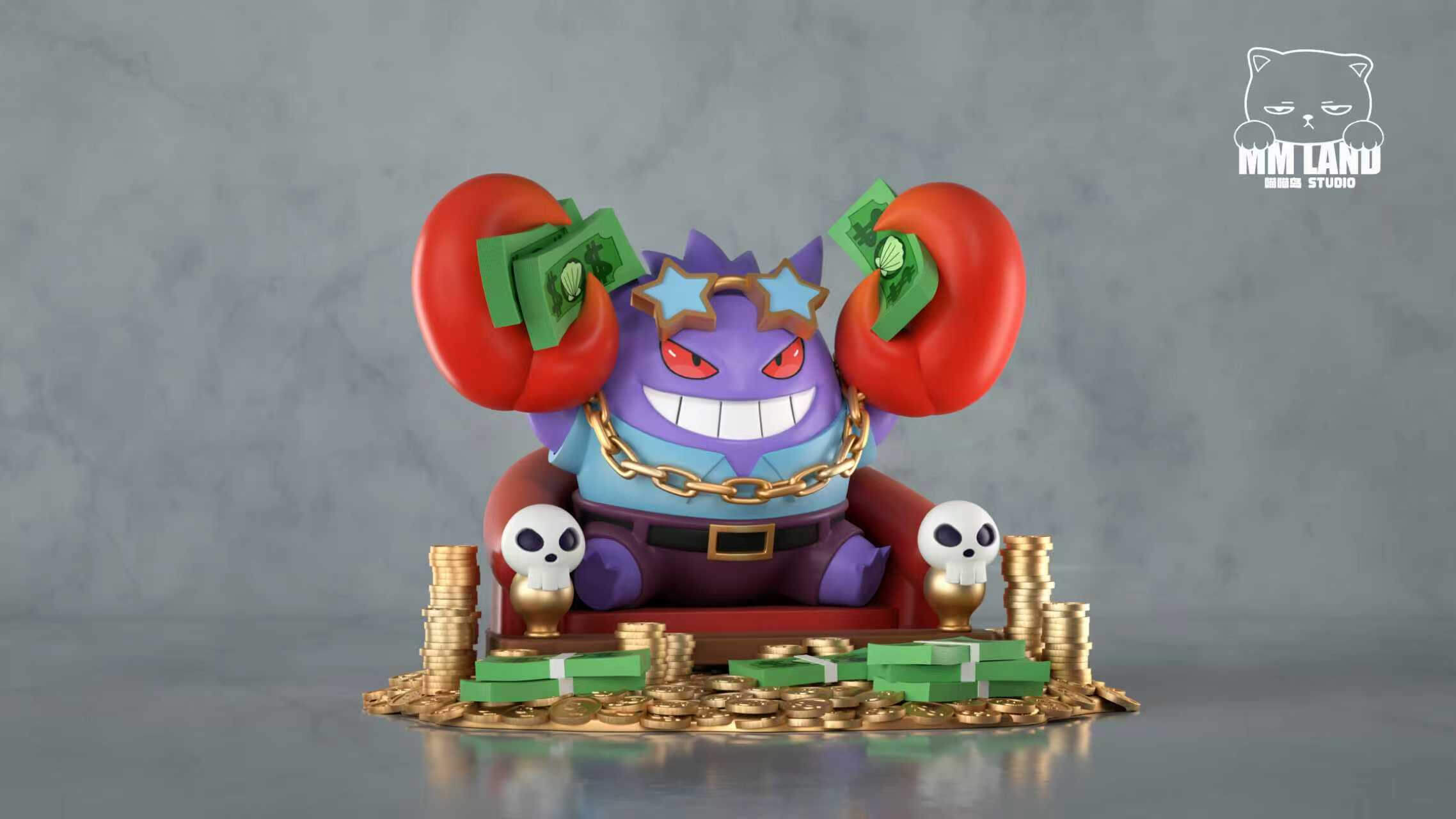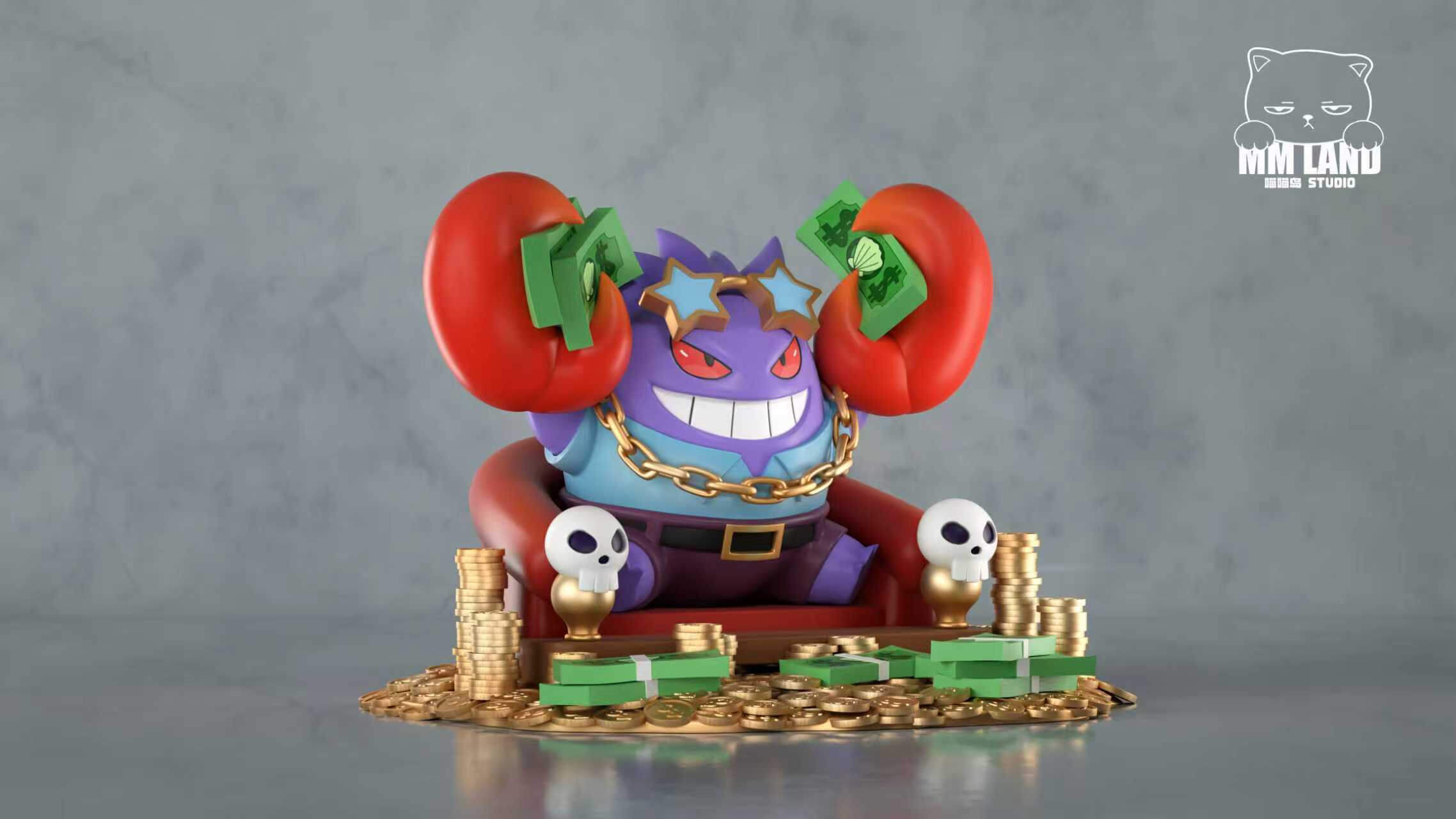 - Gengar sculpted seated on a plush red throne, claws raised and fanned with currency bills