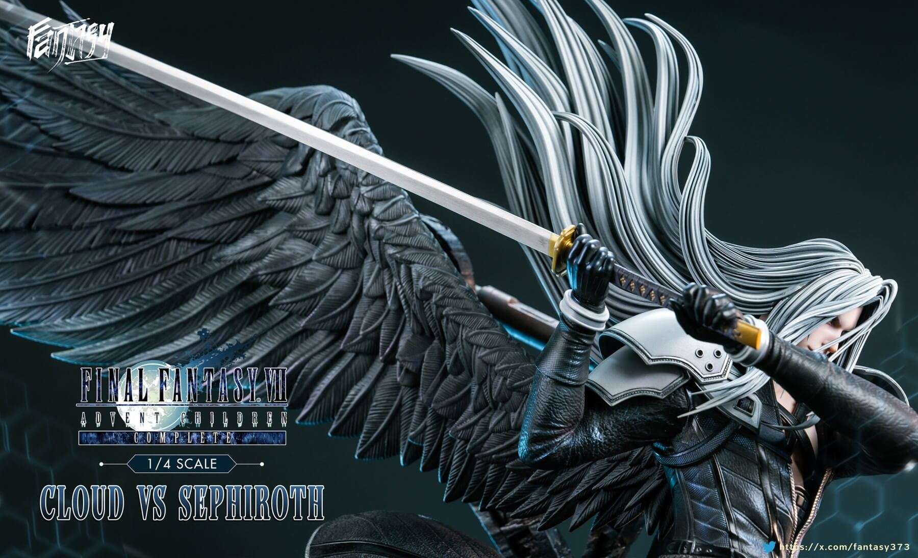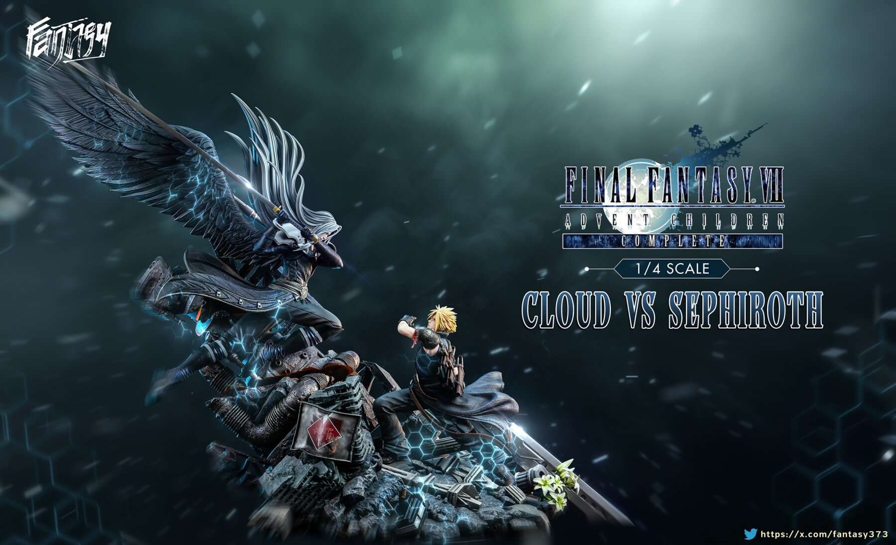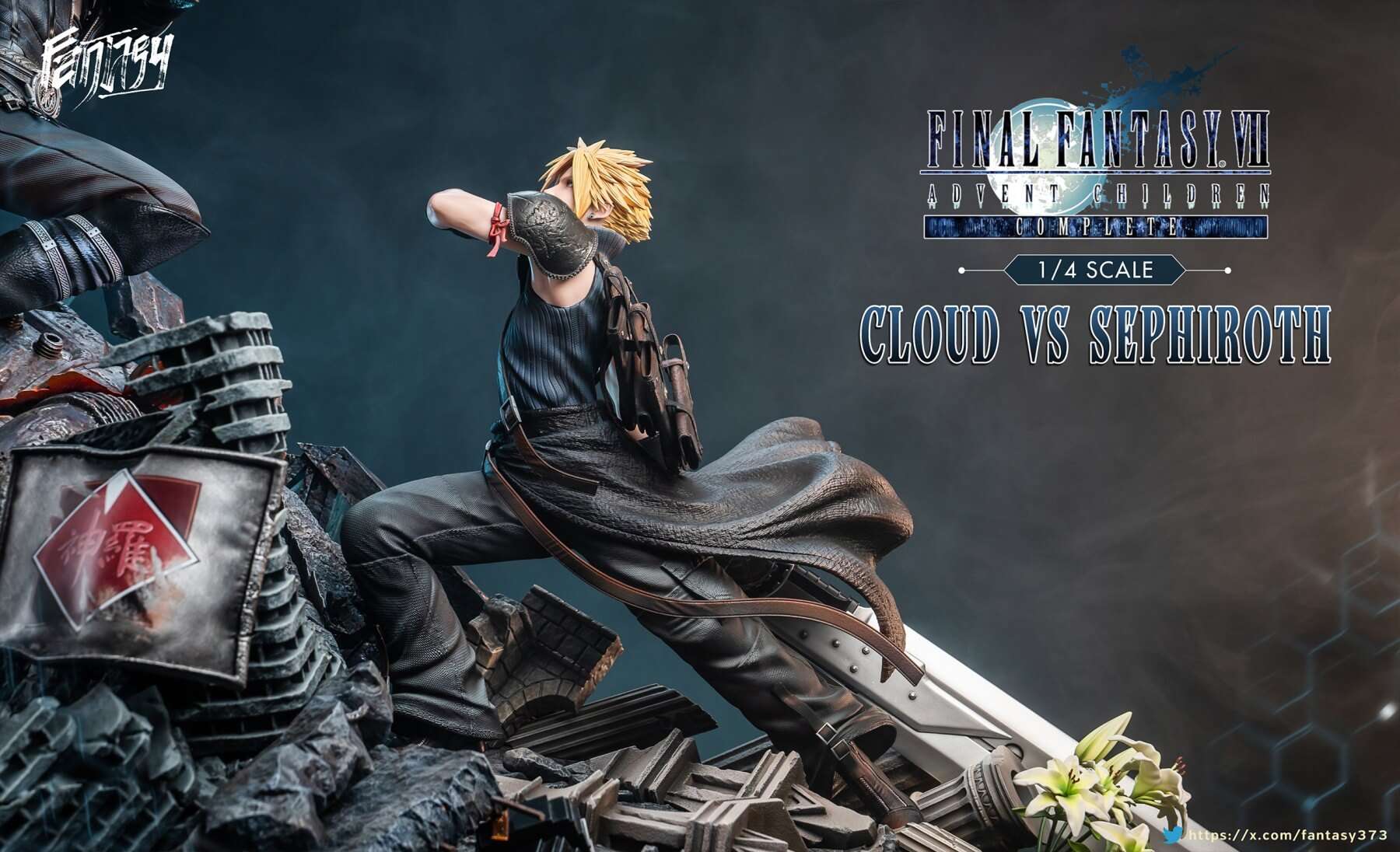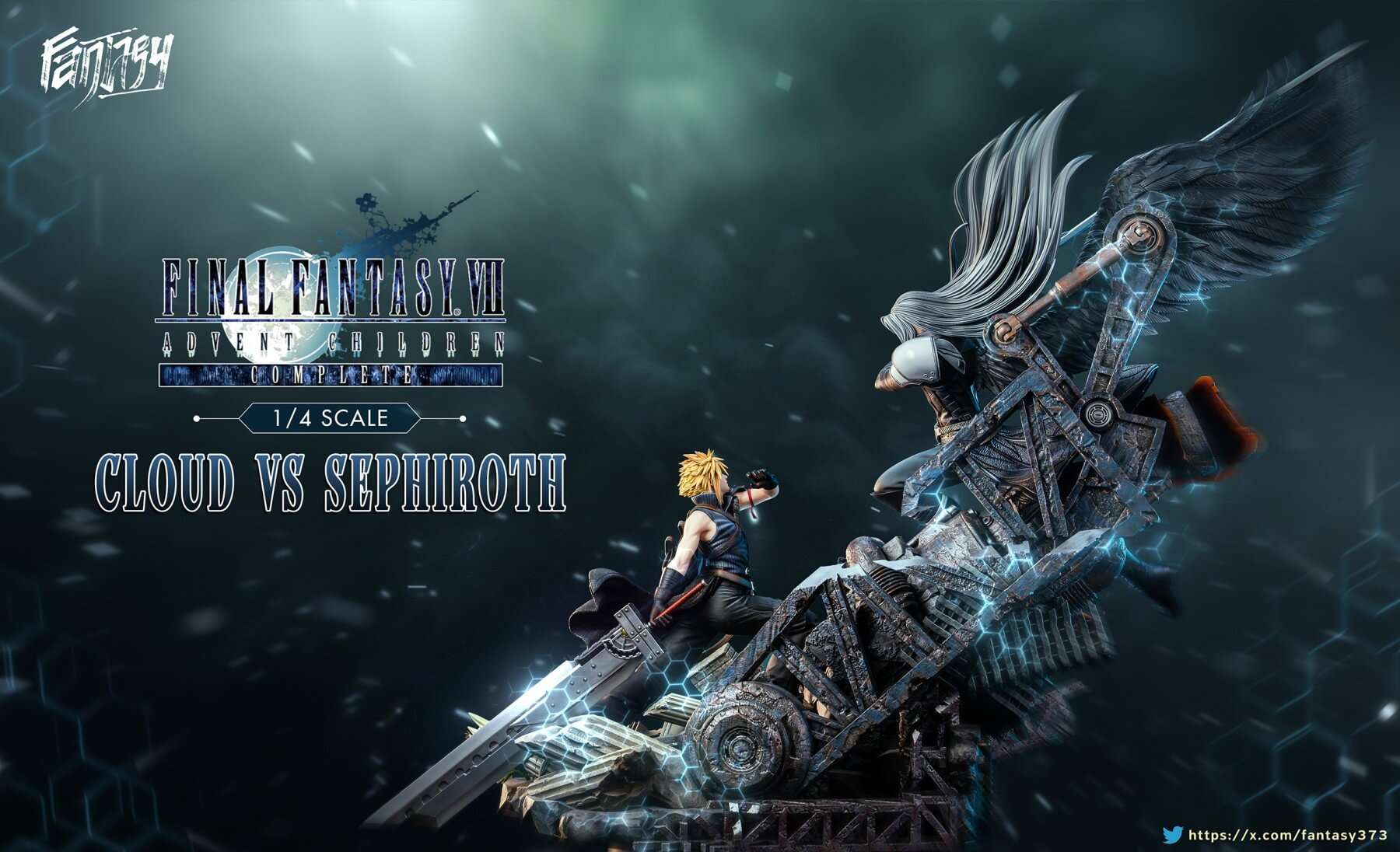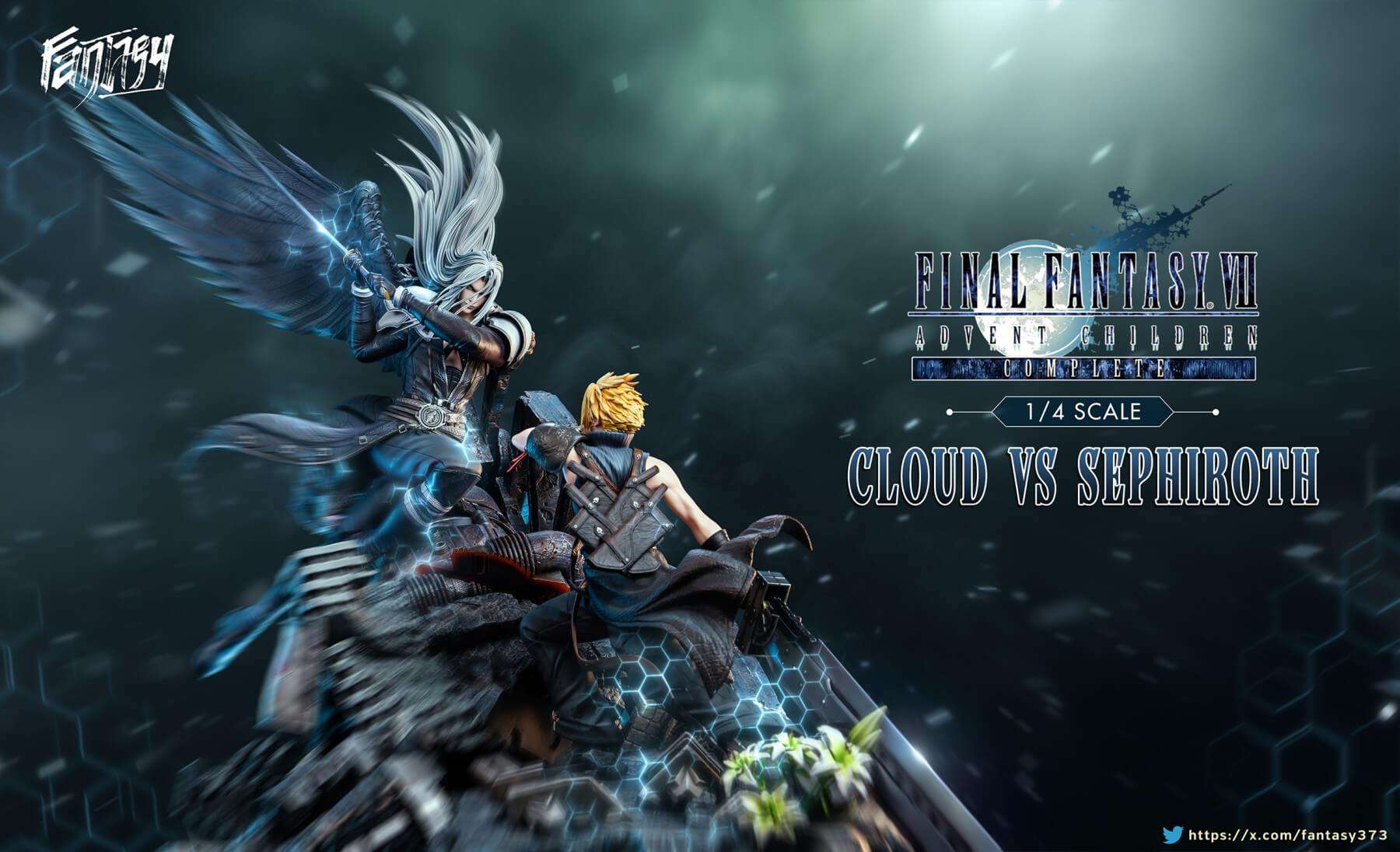 - Dynamic twin-figure composition featuring Cloud Strife and Sephiroth in their iconic rooftop duel