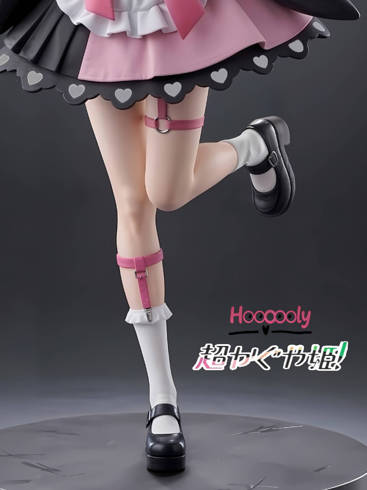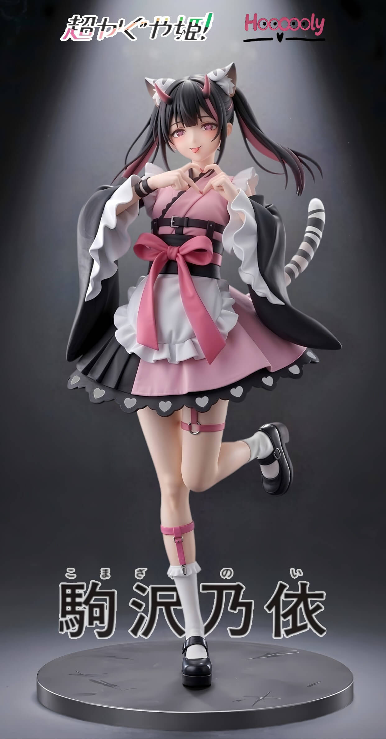 - Full figure in signature cat-girl maid ensemble โ black outer kimono-style coat with wide frilled sleeves, layered pink-and-white skirt with heart-cutout hem trim