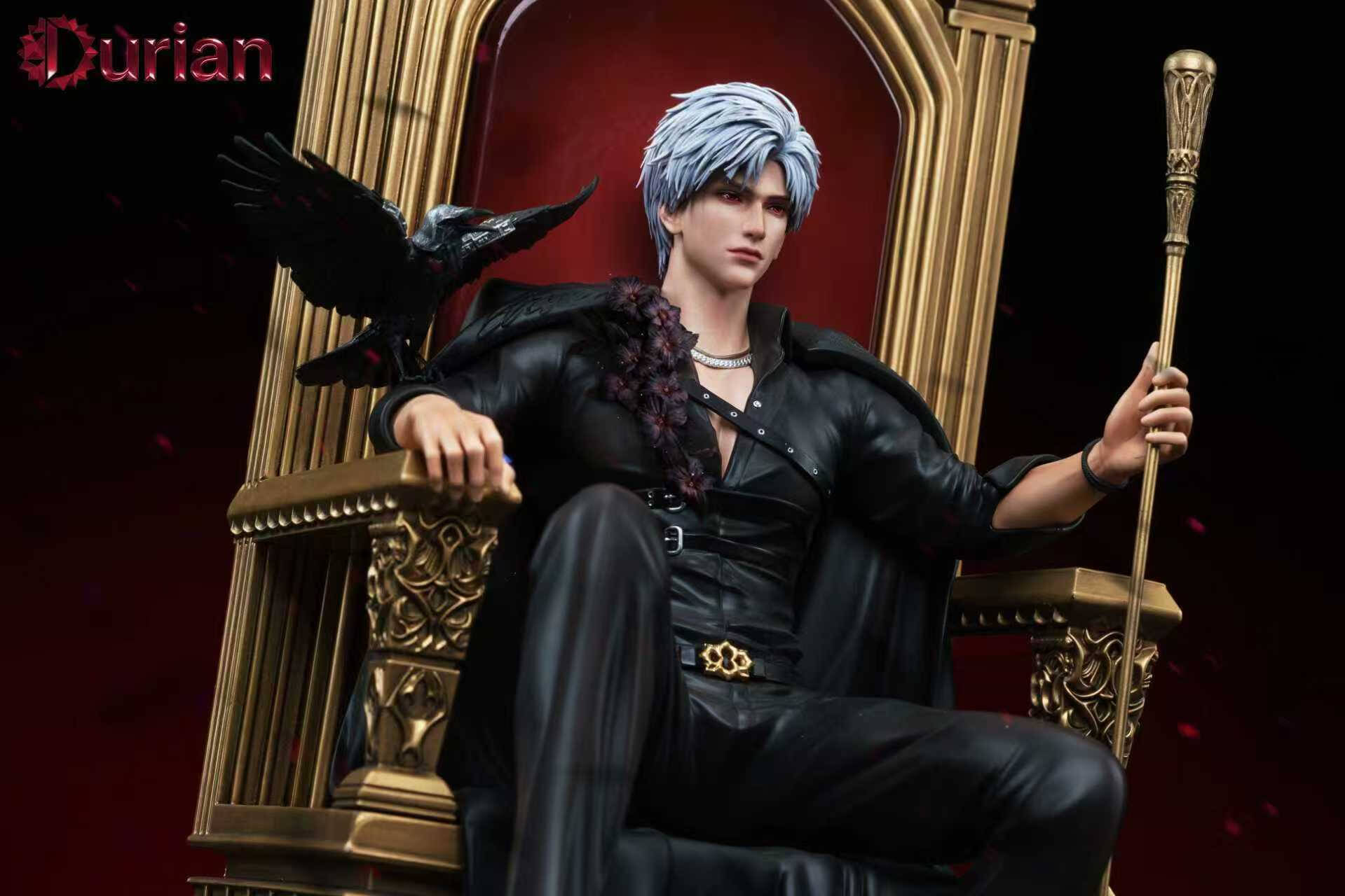 - Sylus seated on an ornate gold throne with crimson velvet backrest โ one hand resting on the armrest, the other gripping a gold scepter