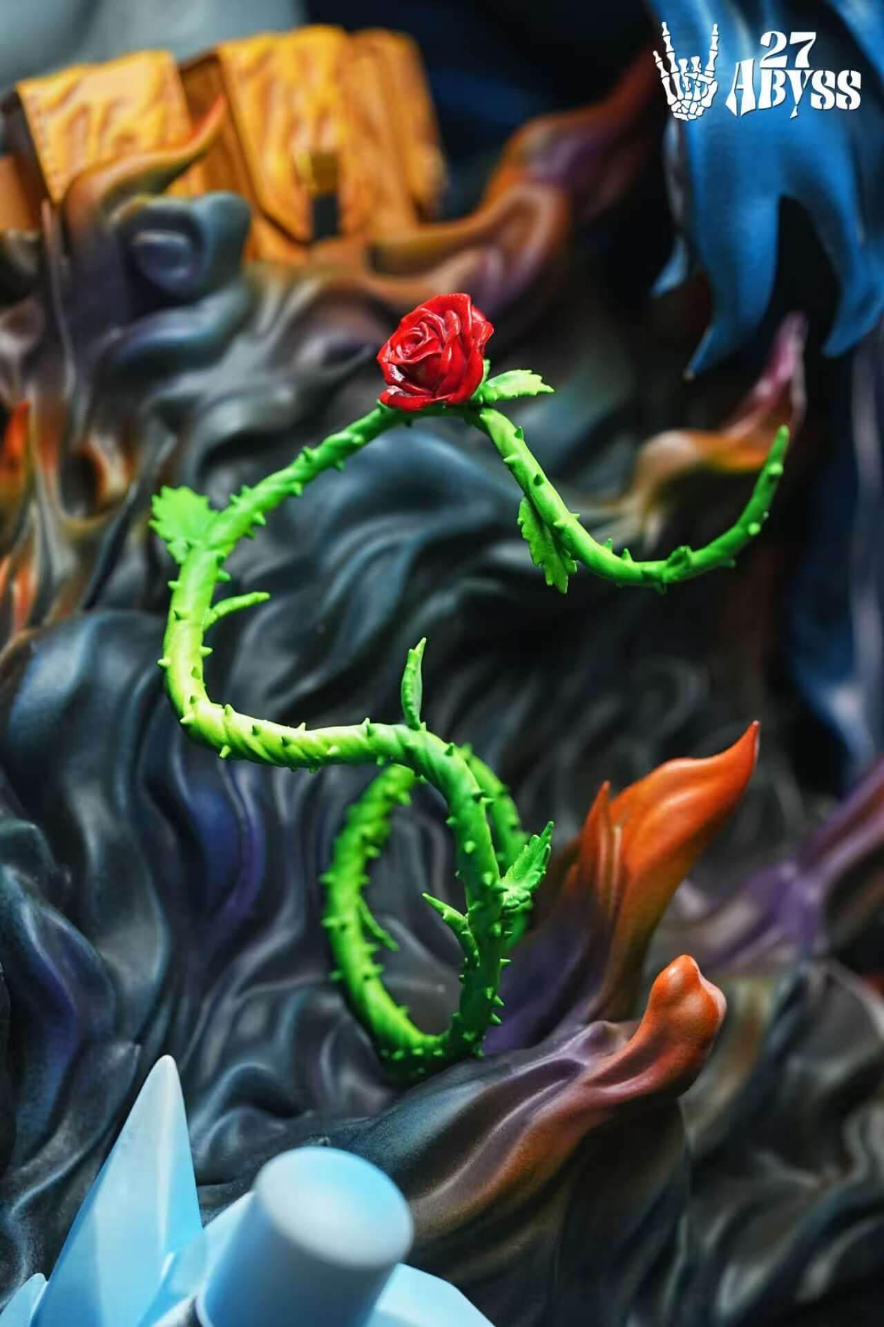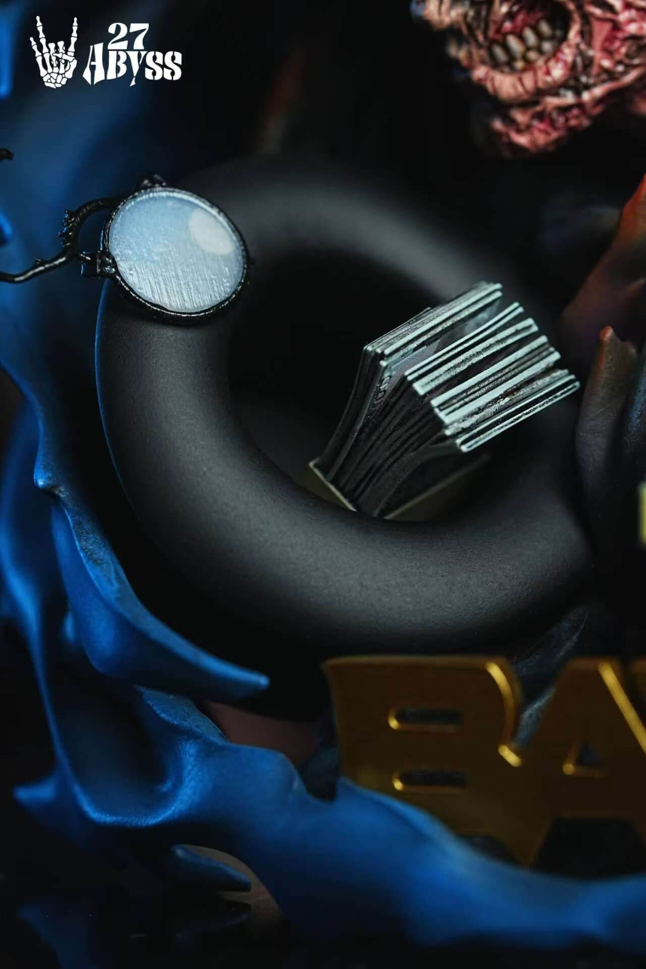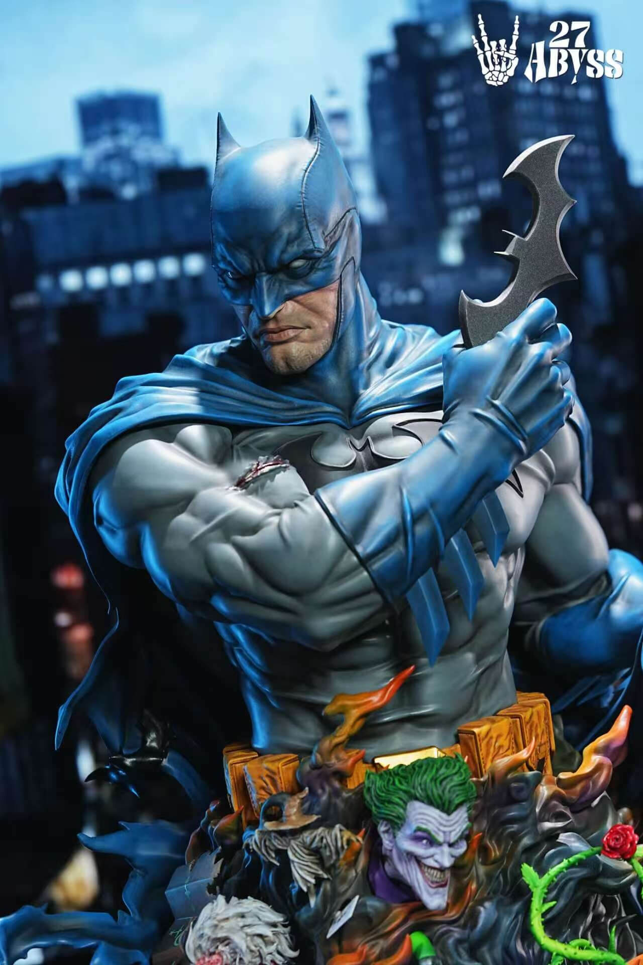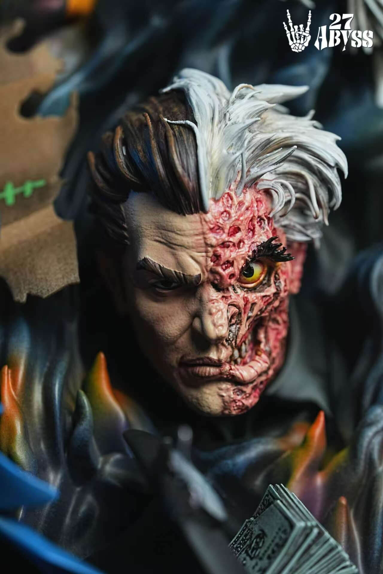 - Villain gallery base section featuring sculpted portraits of Joker, Two-Face, Penguin, and Poison Ivy vine elements woven through flames