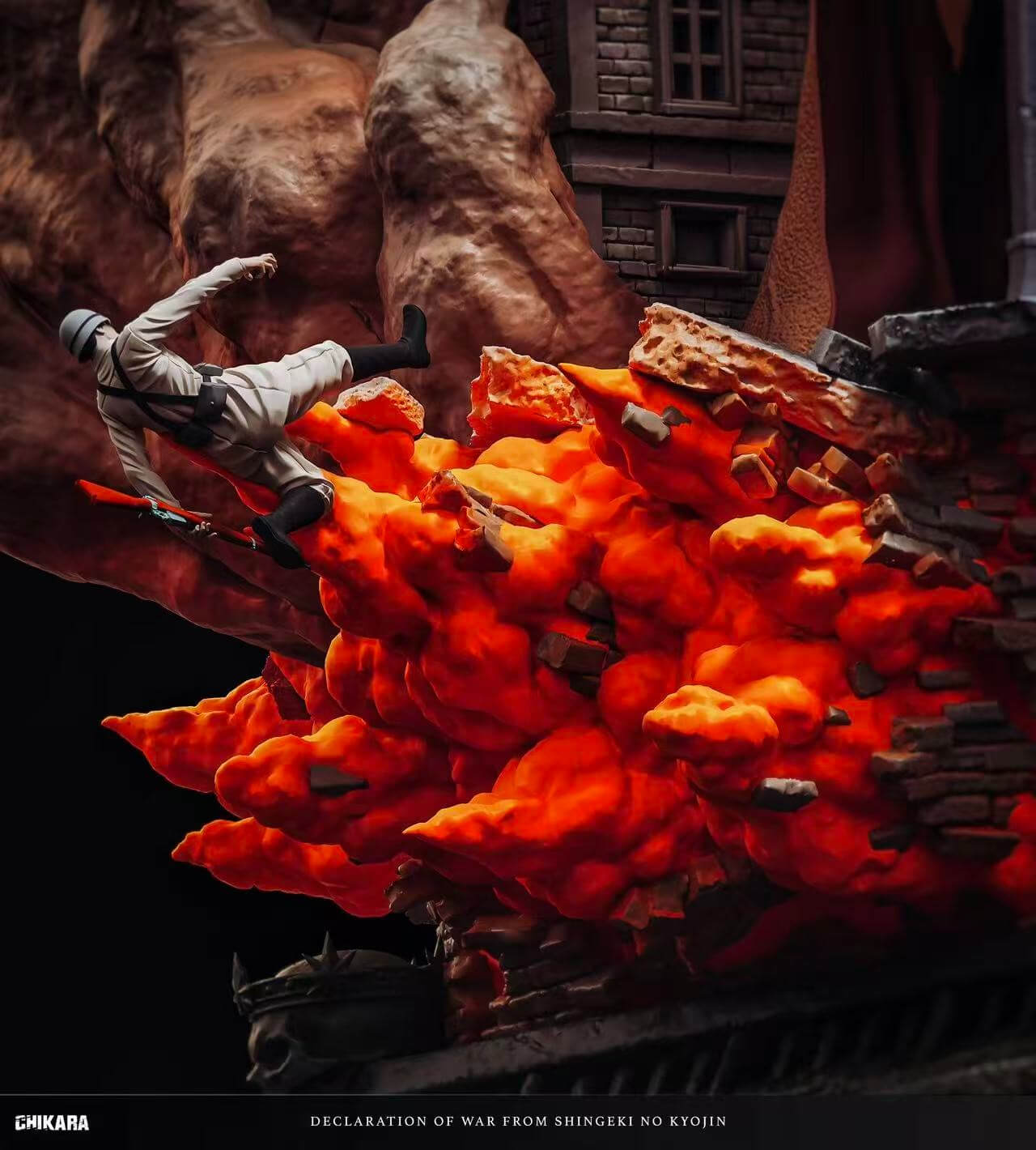- Eren’s Attack Titan in full mid-emergence pose, erupting through the Liberio stage building with War Hammer Titan figure caught in his grasp