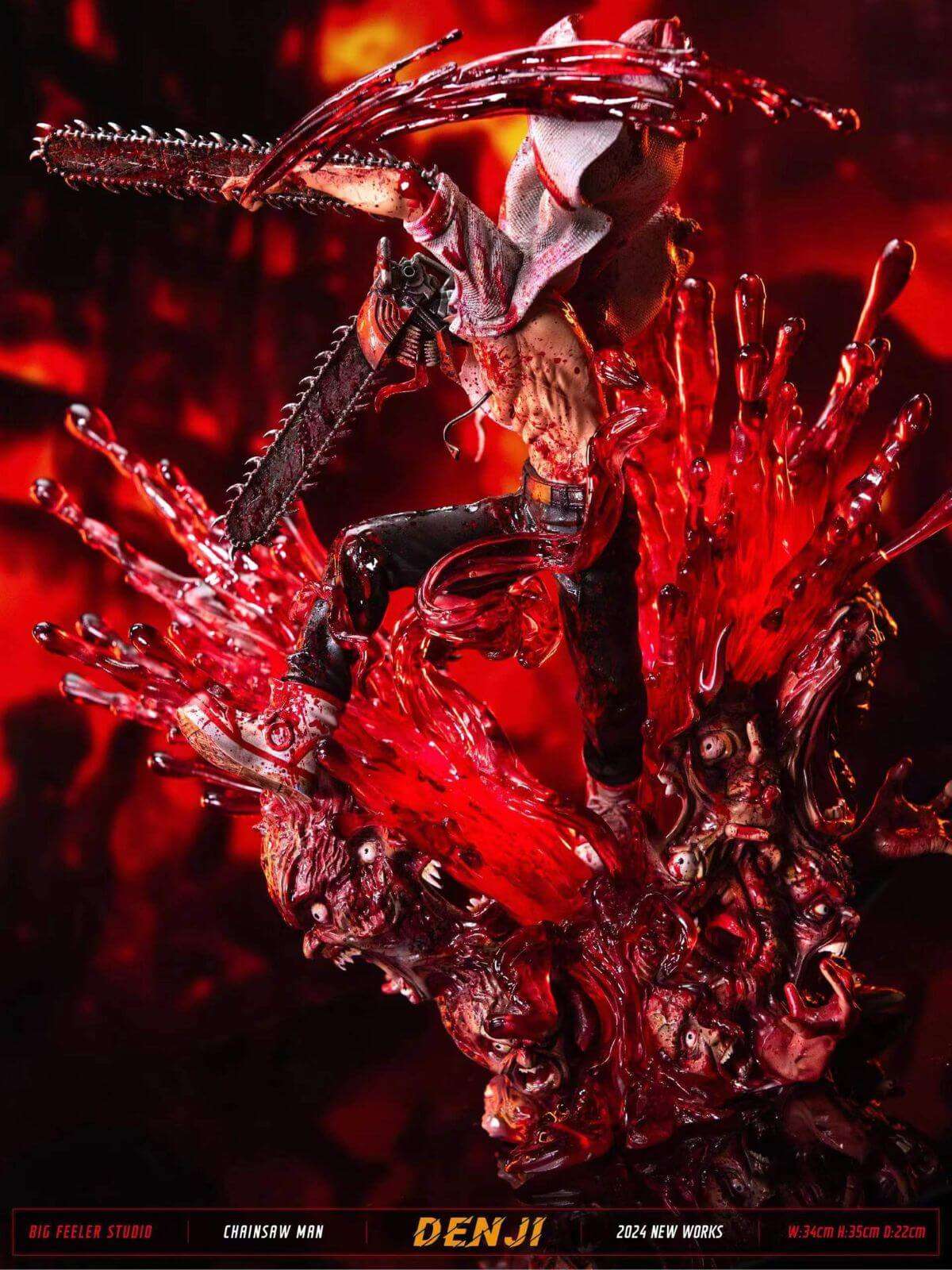 - Denji depicted mid-slash with a shredded shirt and gore-covered chainsaw arms
