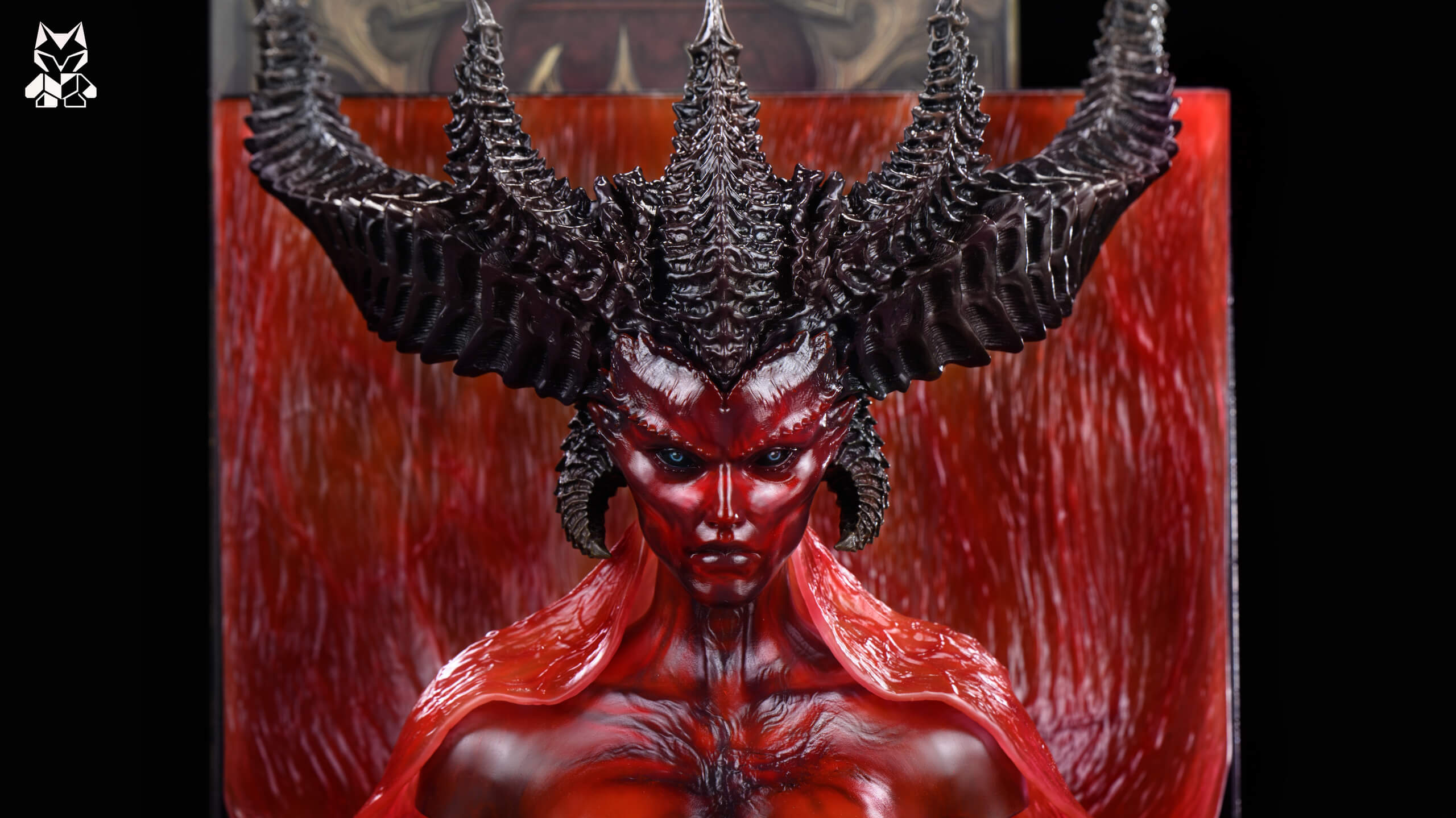 - Lilith bust with integrated bookend base — crimson skin flowing into a dramatic translucent red cape effect