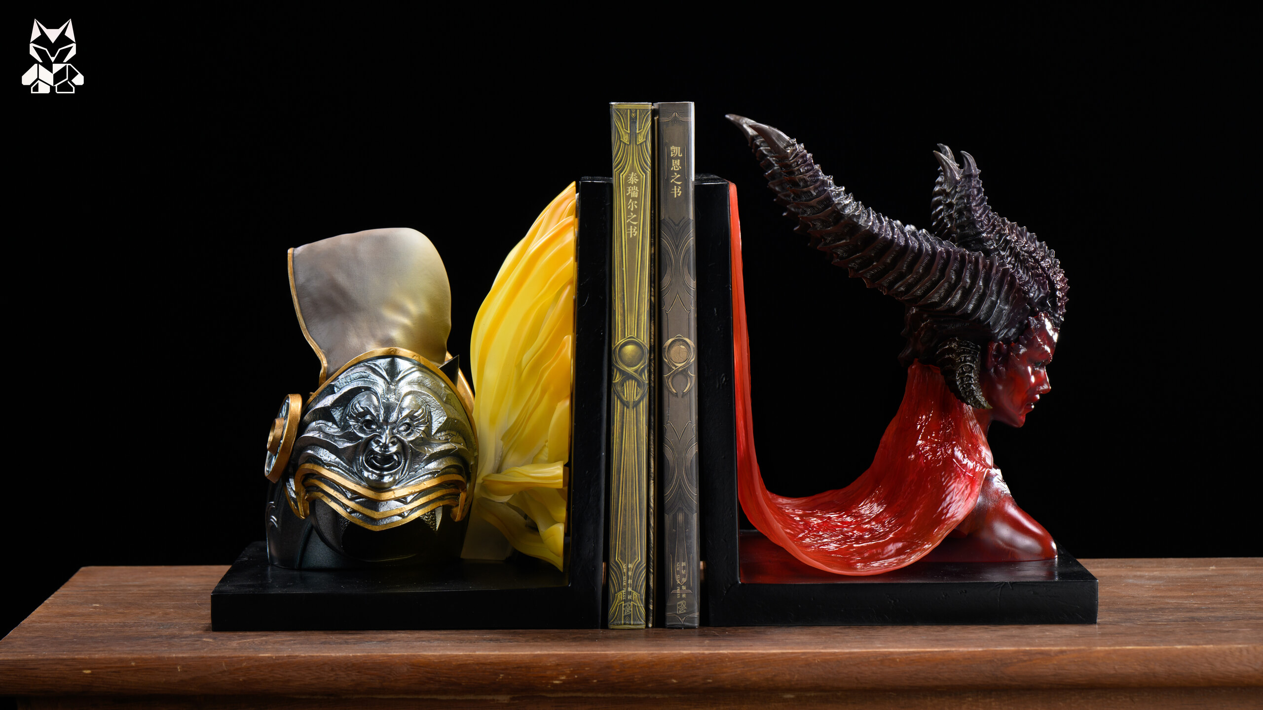 - Inarius bust with integrated bookend base — angelic armor rendered in weathered silver and gold, translucent amber wings catching light