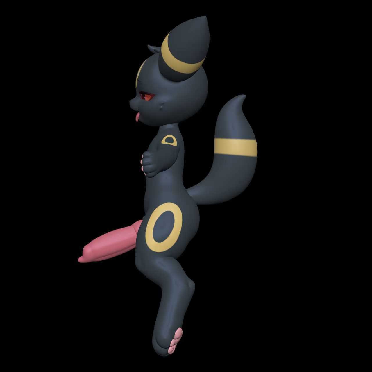 - Anthropomorphic redesign of Umbreon with sleek, upright stance โ playful yet mischievous expression featuring narrowed red eyes, tongue out, and dynamic leaping/jumping pose that emphasizes fluid motion