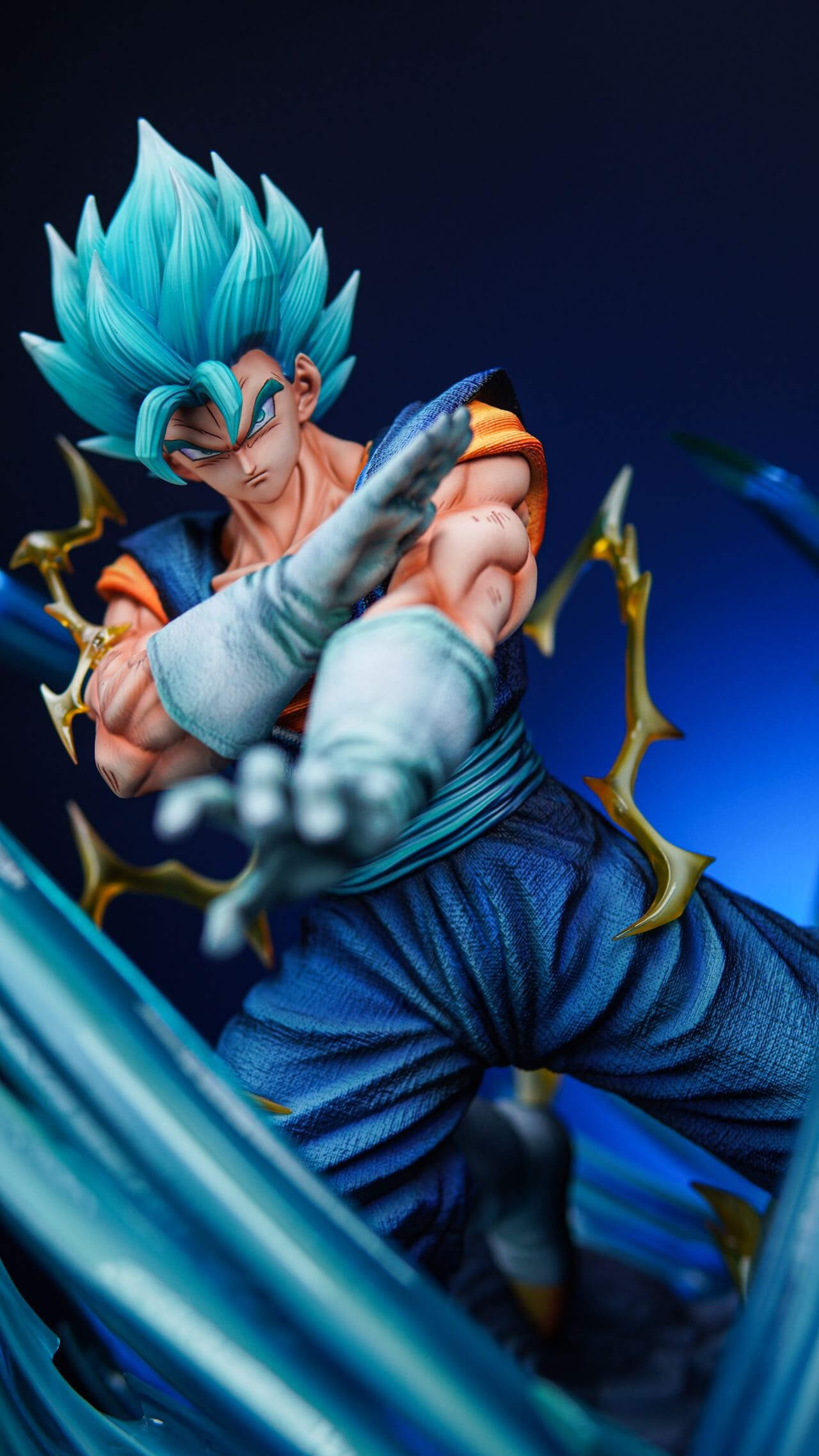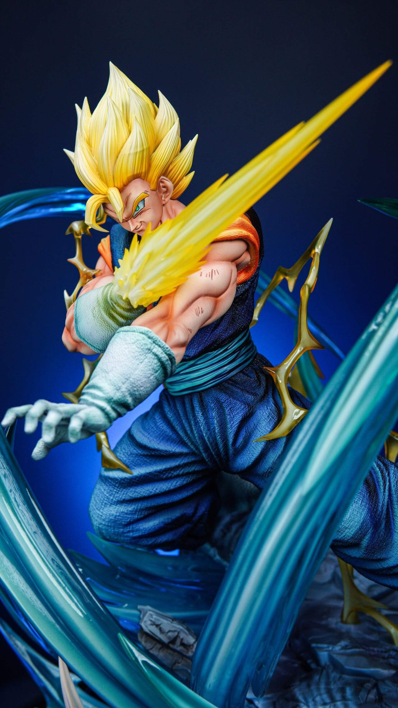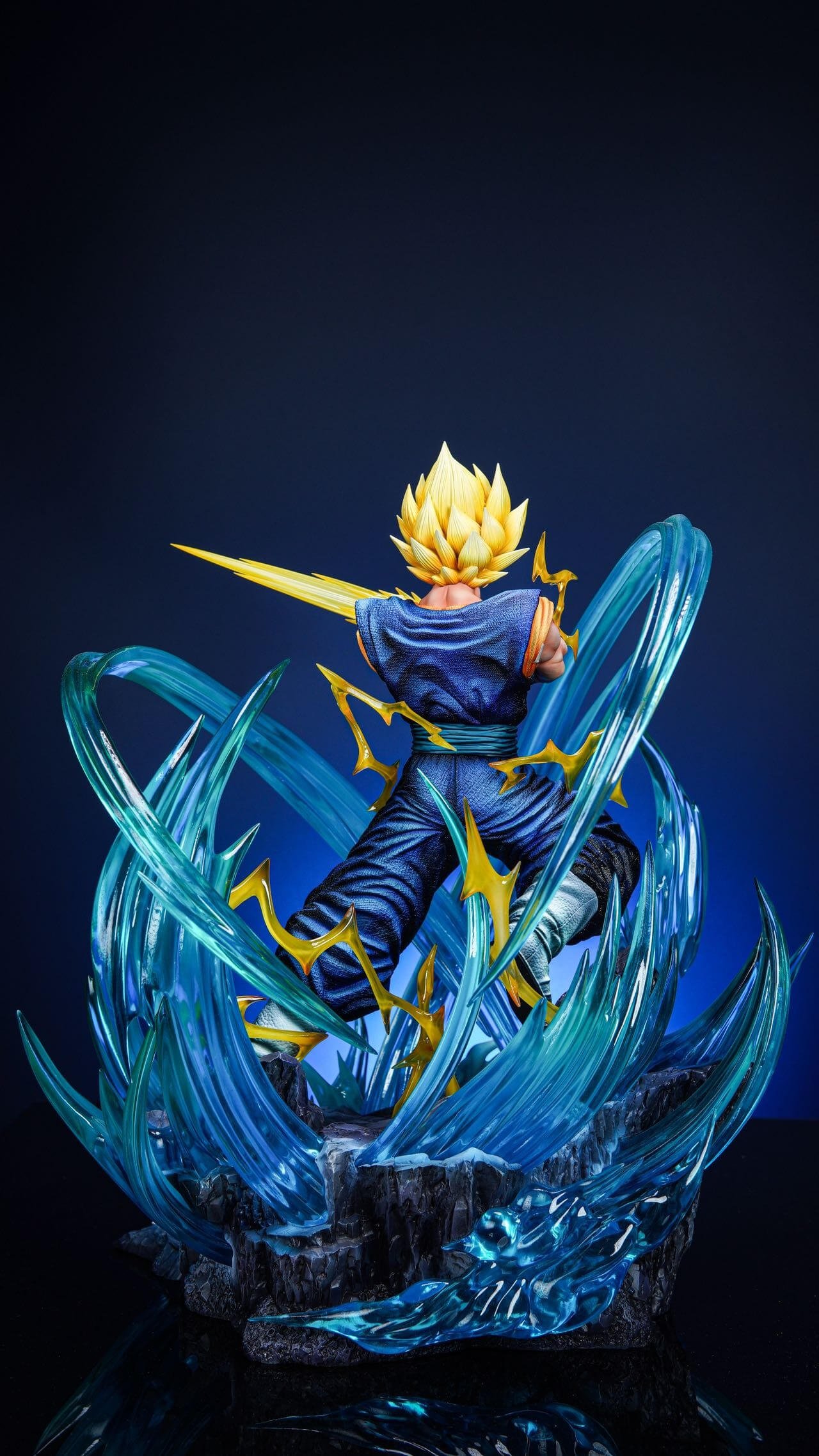 - Vegito figure with Super Saiyan head sculpt, translucent blue energy eruption base, and golden lightning effect parts