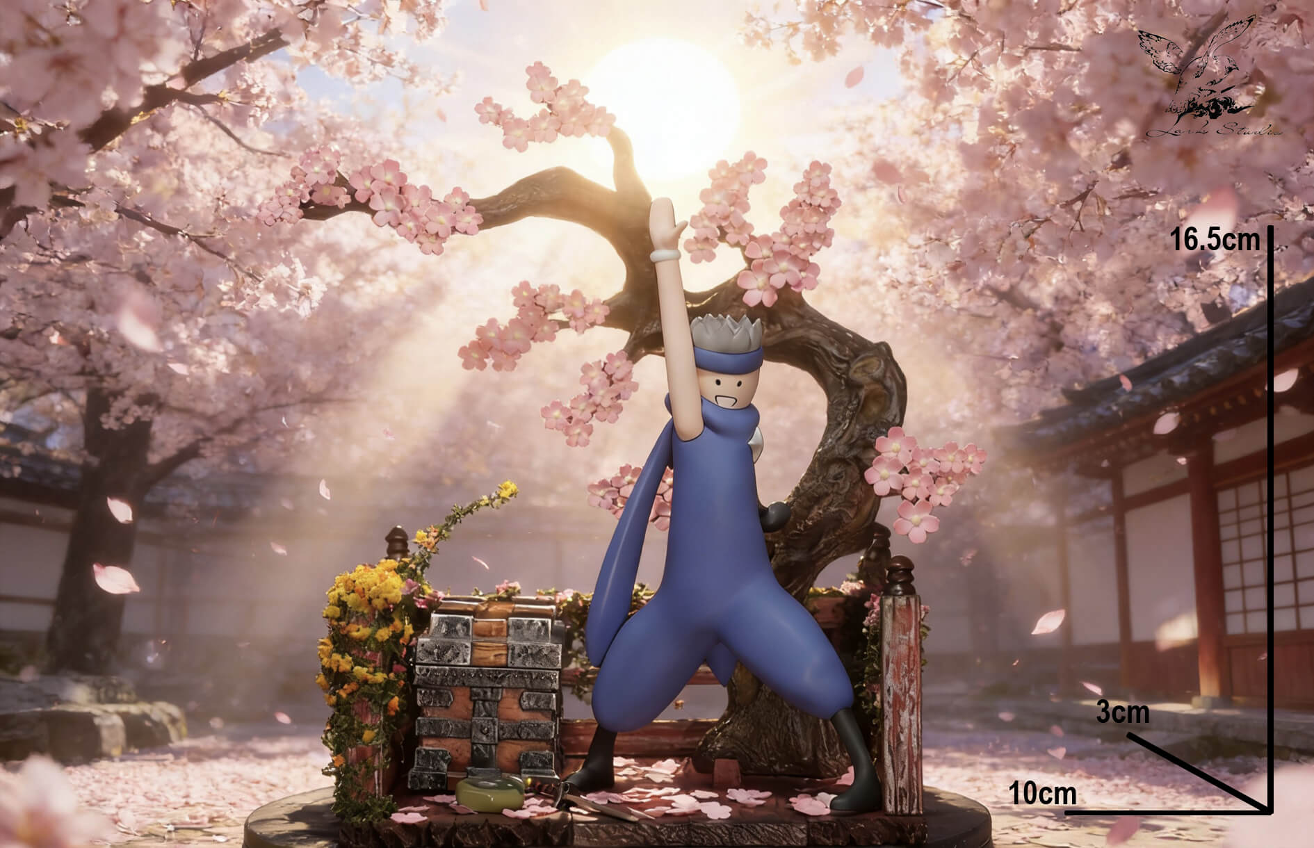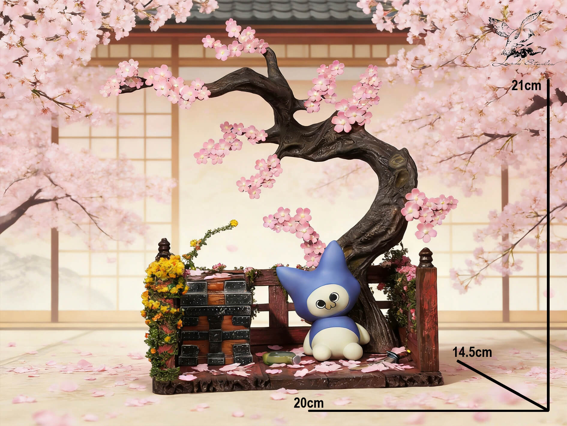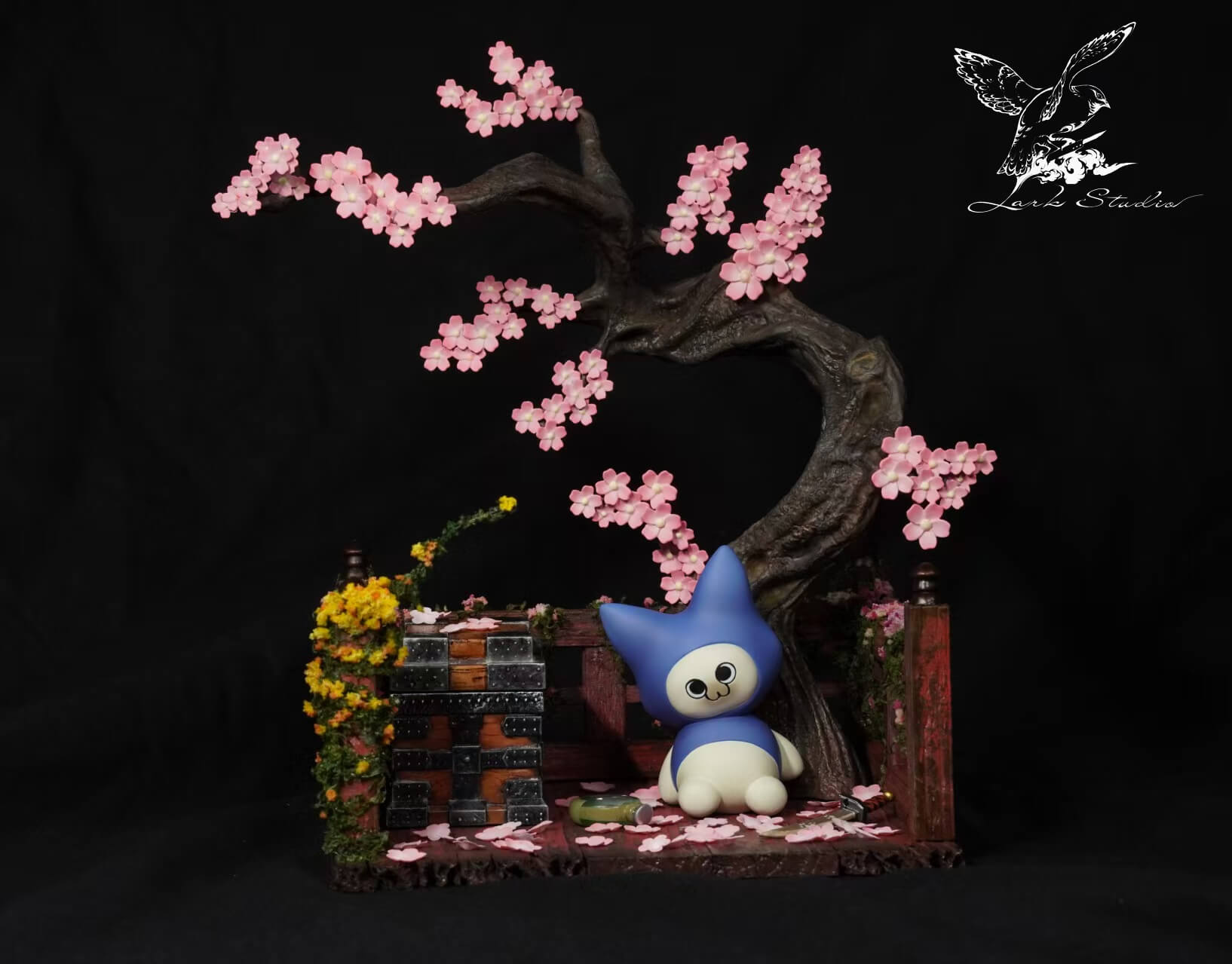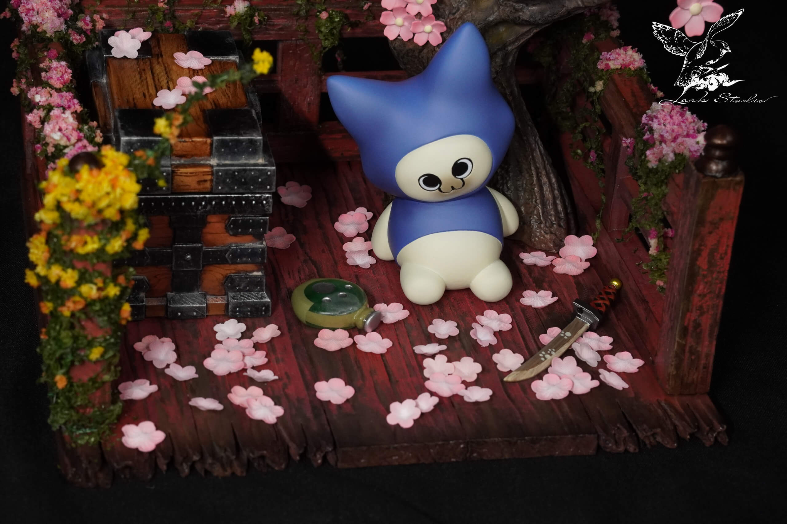 - × 1 scenic diorama base — weathered wooden veranda with railing, scattered cherry blossom petals, cascading yellow flowers, and stacked stone/wooden crates