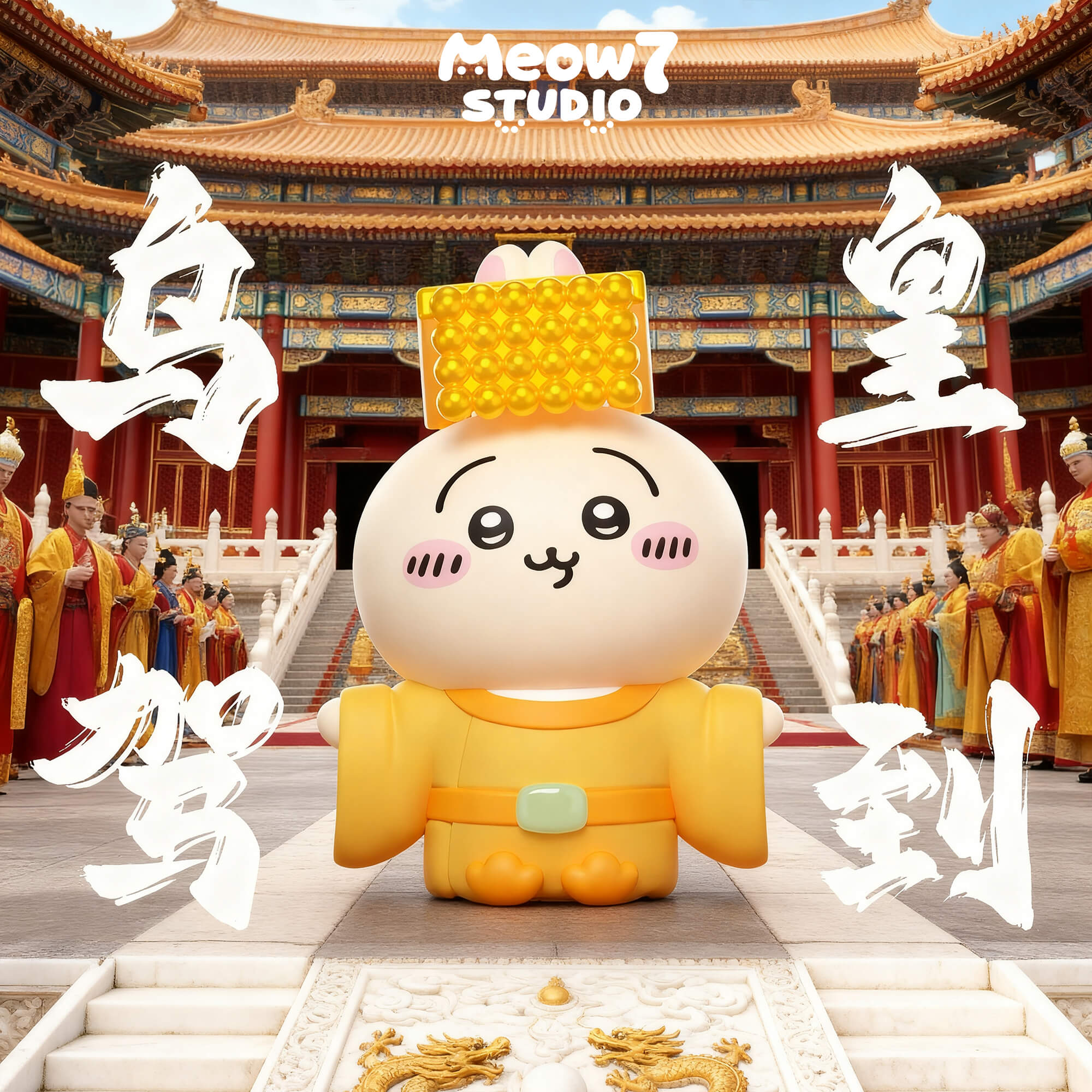 - Emperor Usagi is presented in imperial yellow robes with a beaded crown.
