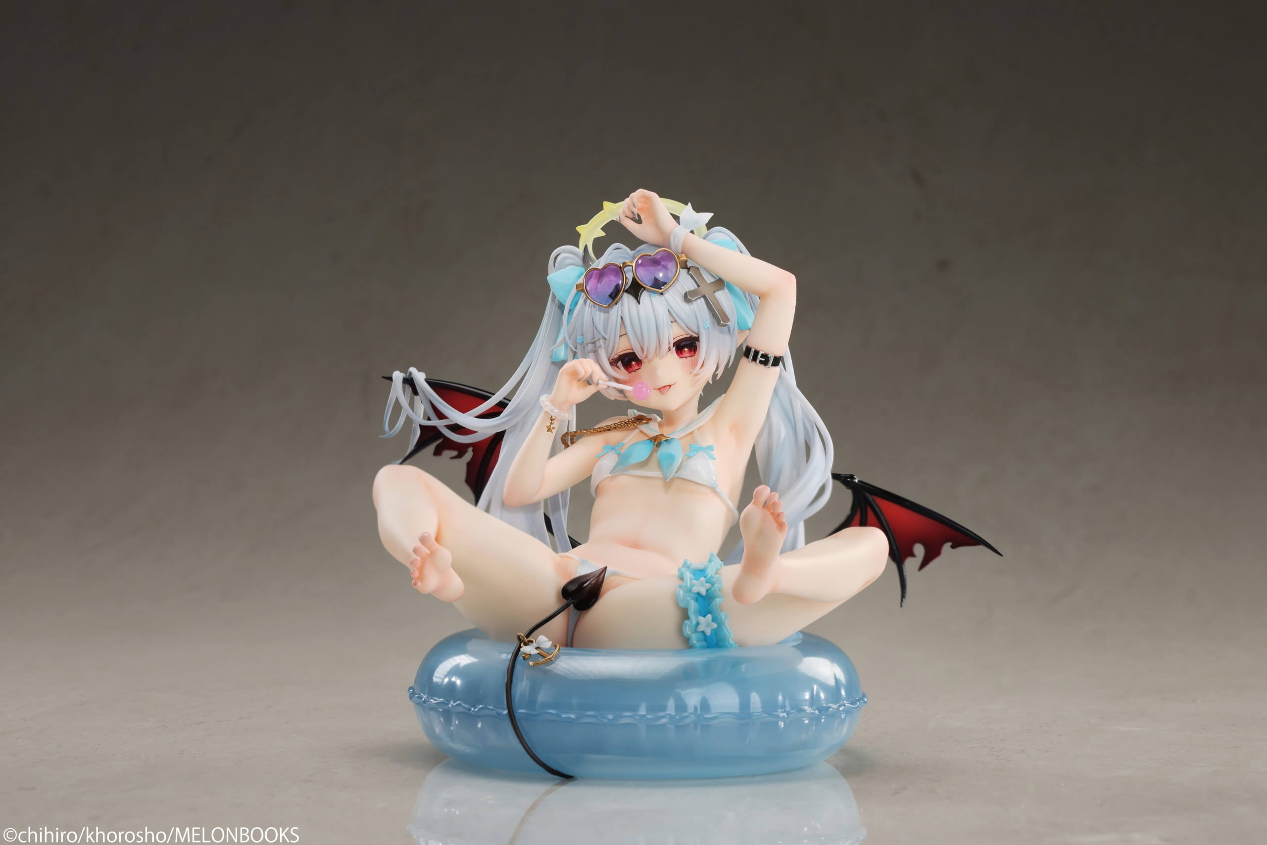 - Main figure seated in a translucent inflatable swim ring, rendered with a glossy, air-filled surface texture