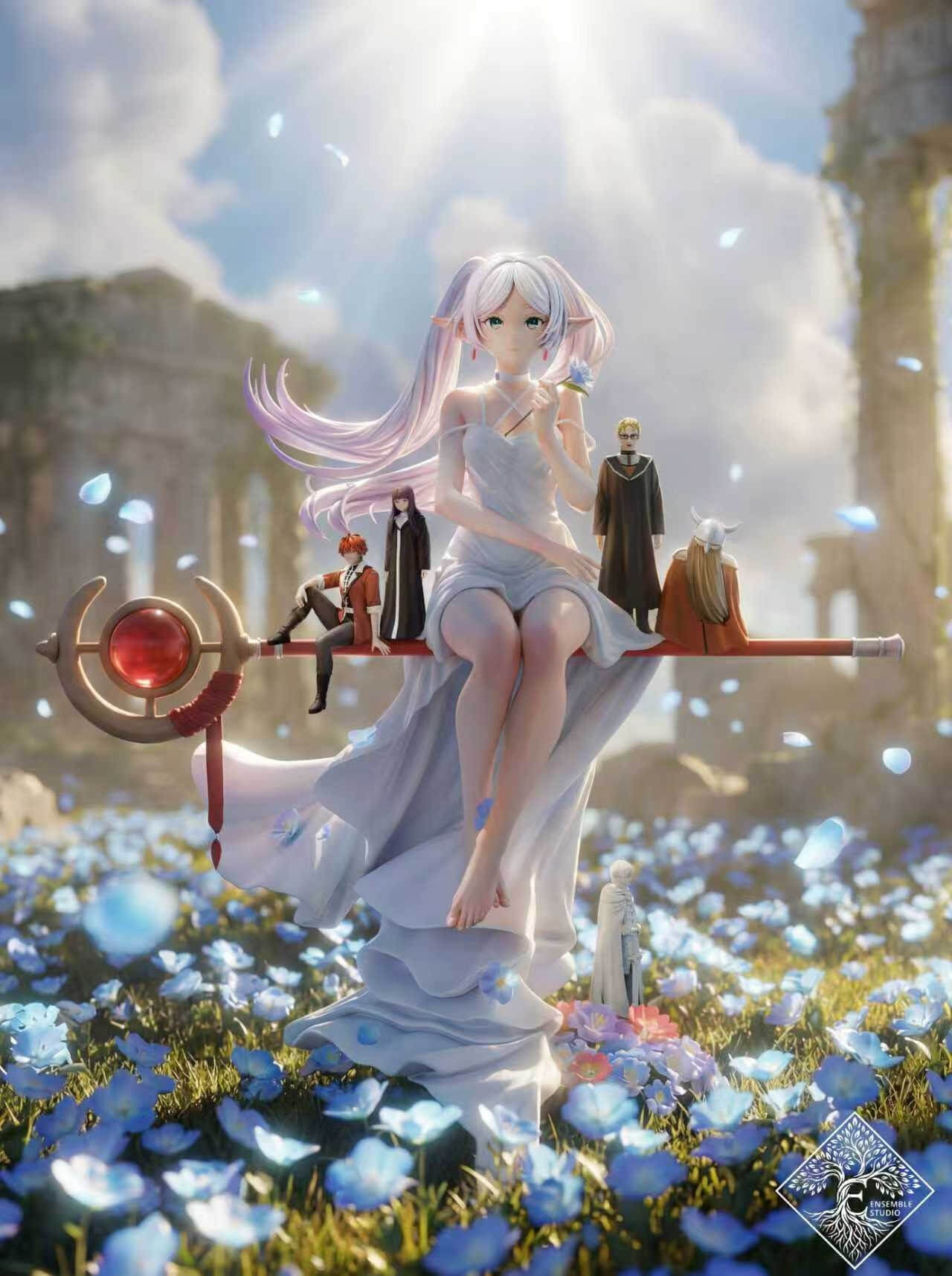 - ร 1 Frieren (1/6 scale) โ seated in a flowing white dress, delicately holding a blue flower, her signature staff resting across her lap