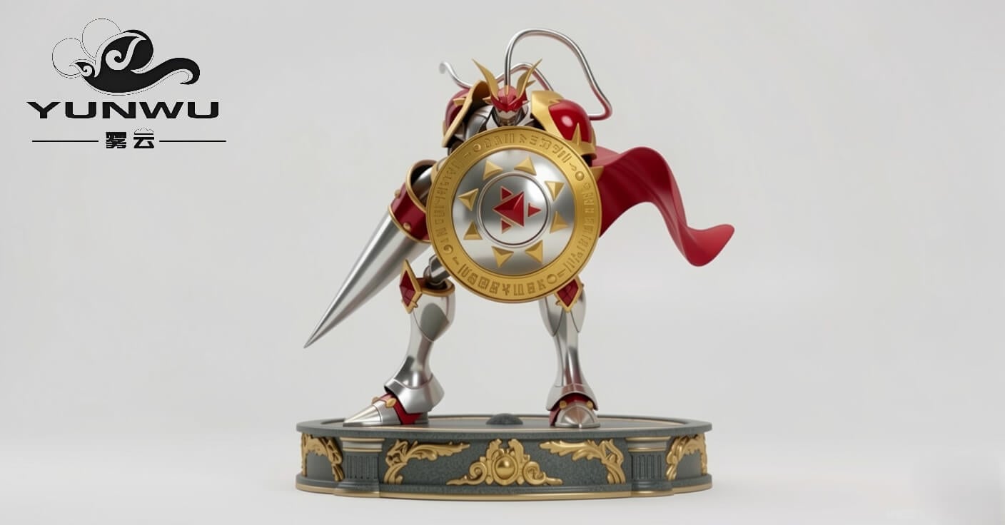 - Gallantmon sculpted in a low, combat-ready stance — lance extended forward, Aegis shield raised and angled, cape caught mid-billow behind him