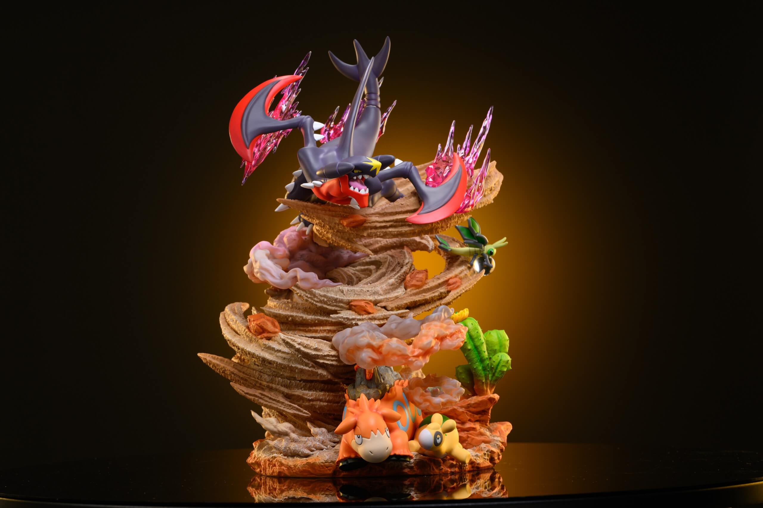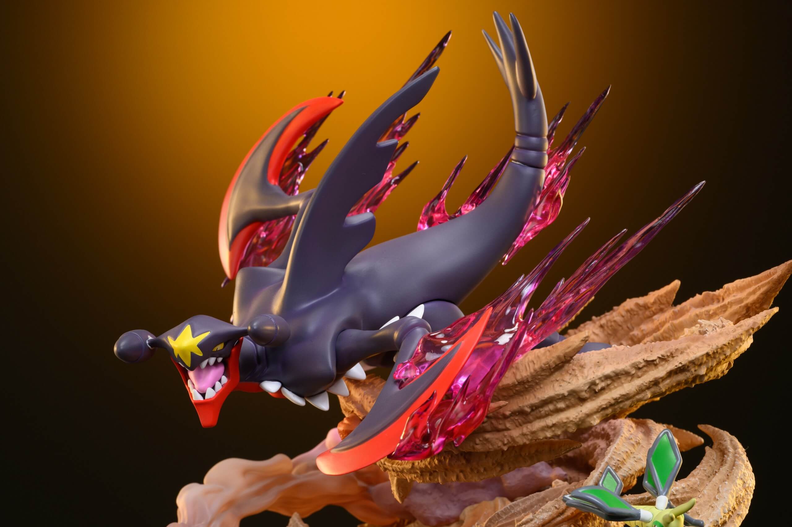 - Features Garchomp launching through a sand-tornado base with translucent magenta energy effects.