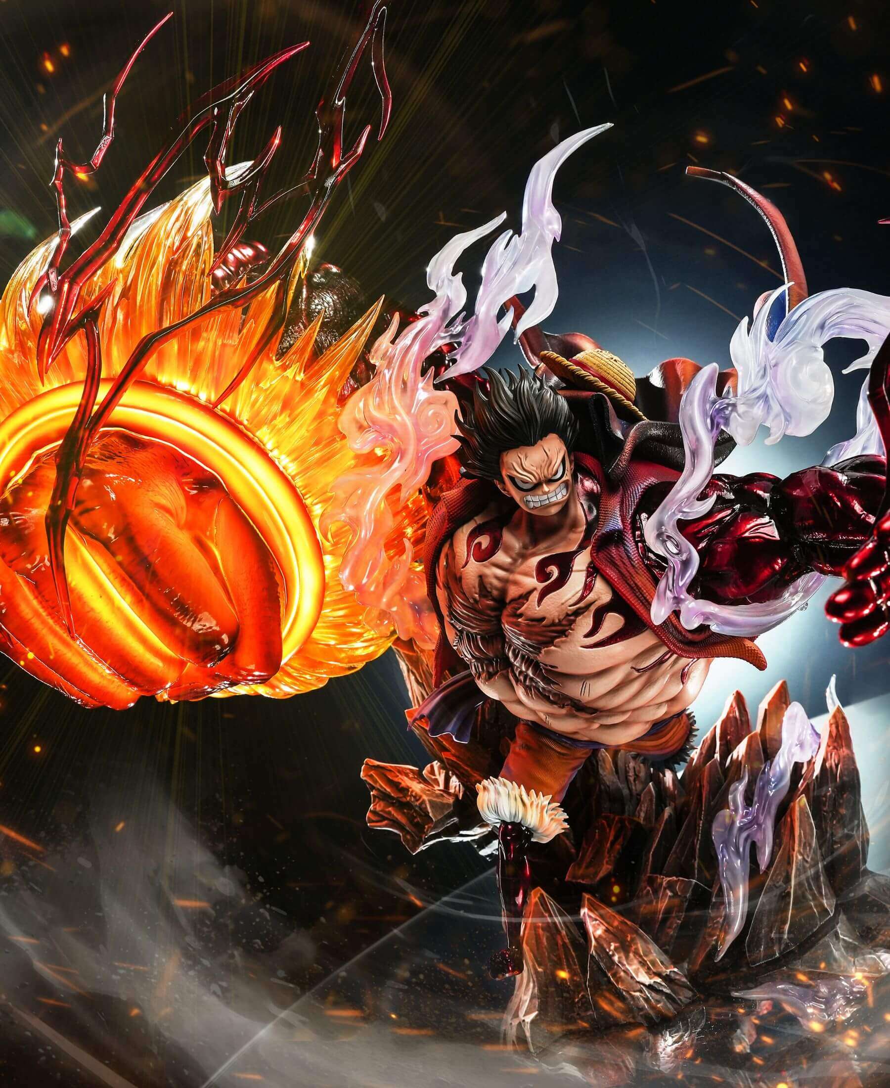 - Statue depicts Luffy mid-attack, enveloped in swirling smoke and fiery fist effects