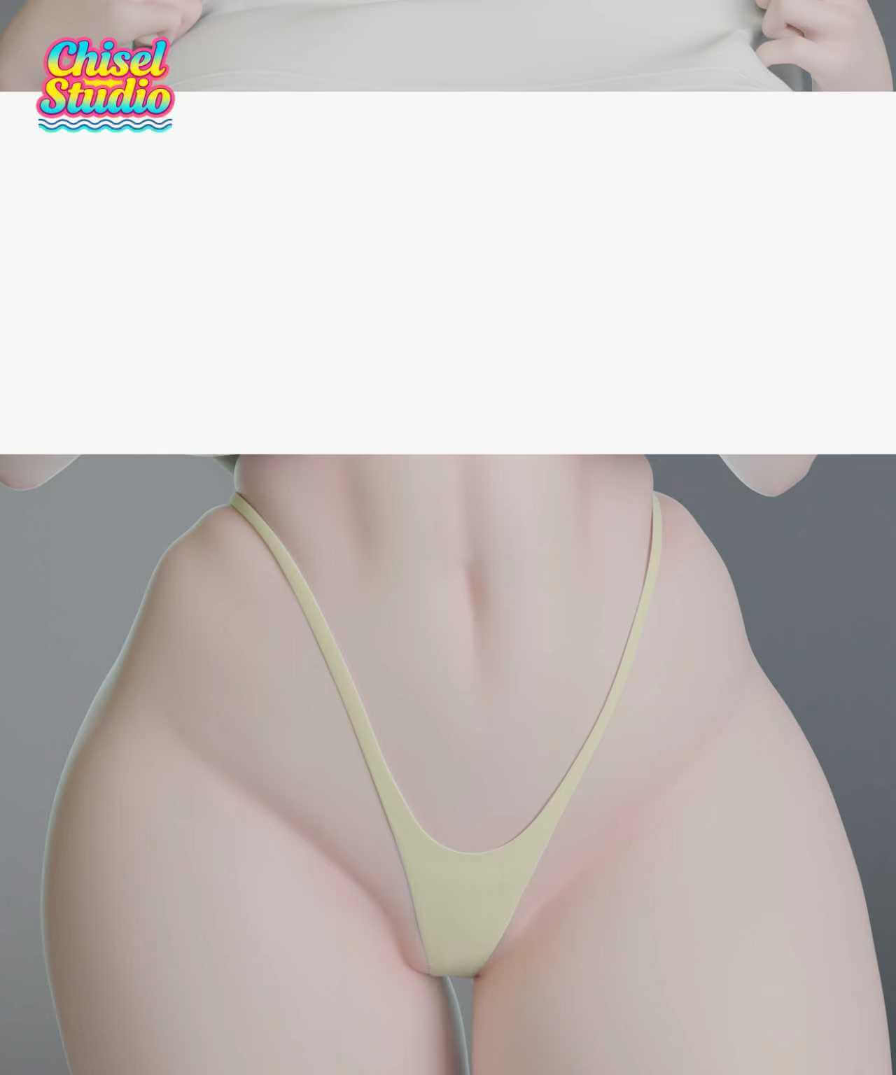 - Single-character display focused on body line, silhouette, and the lifted-shirt gesture that defines the piece from every angle