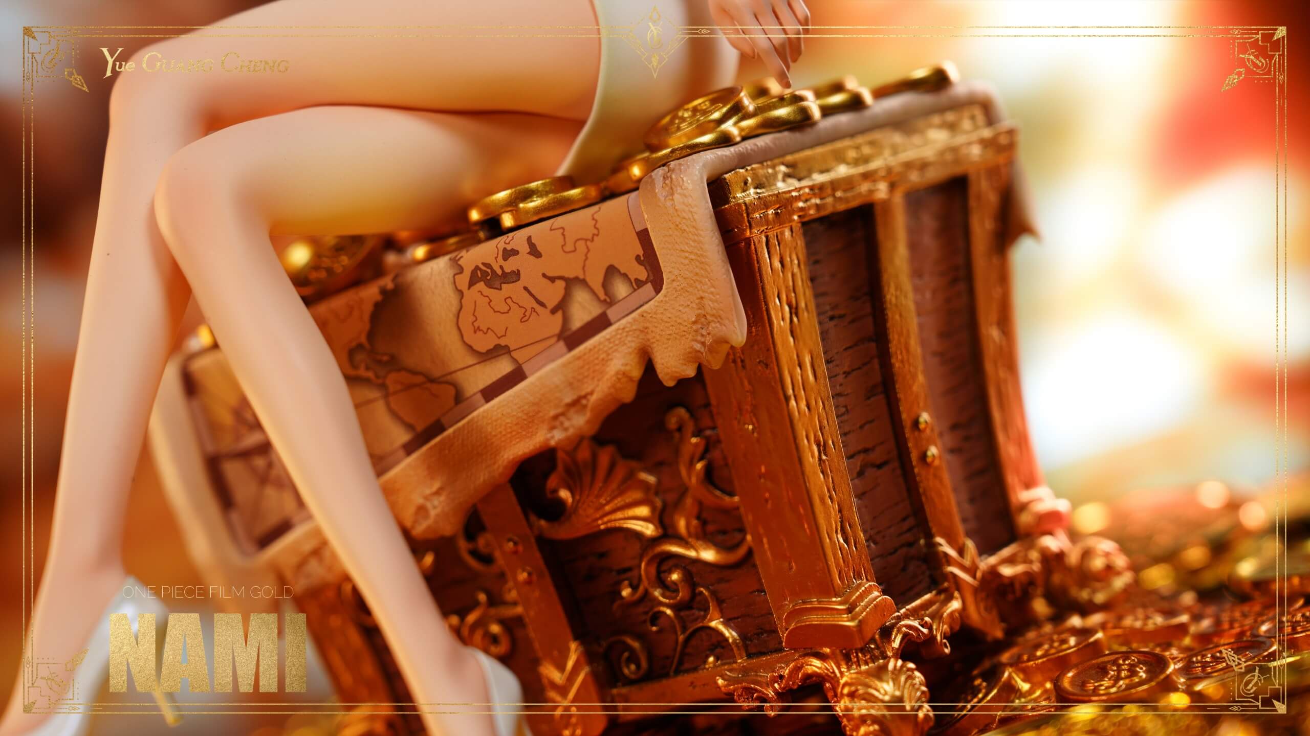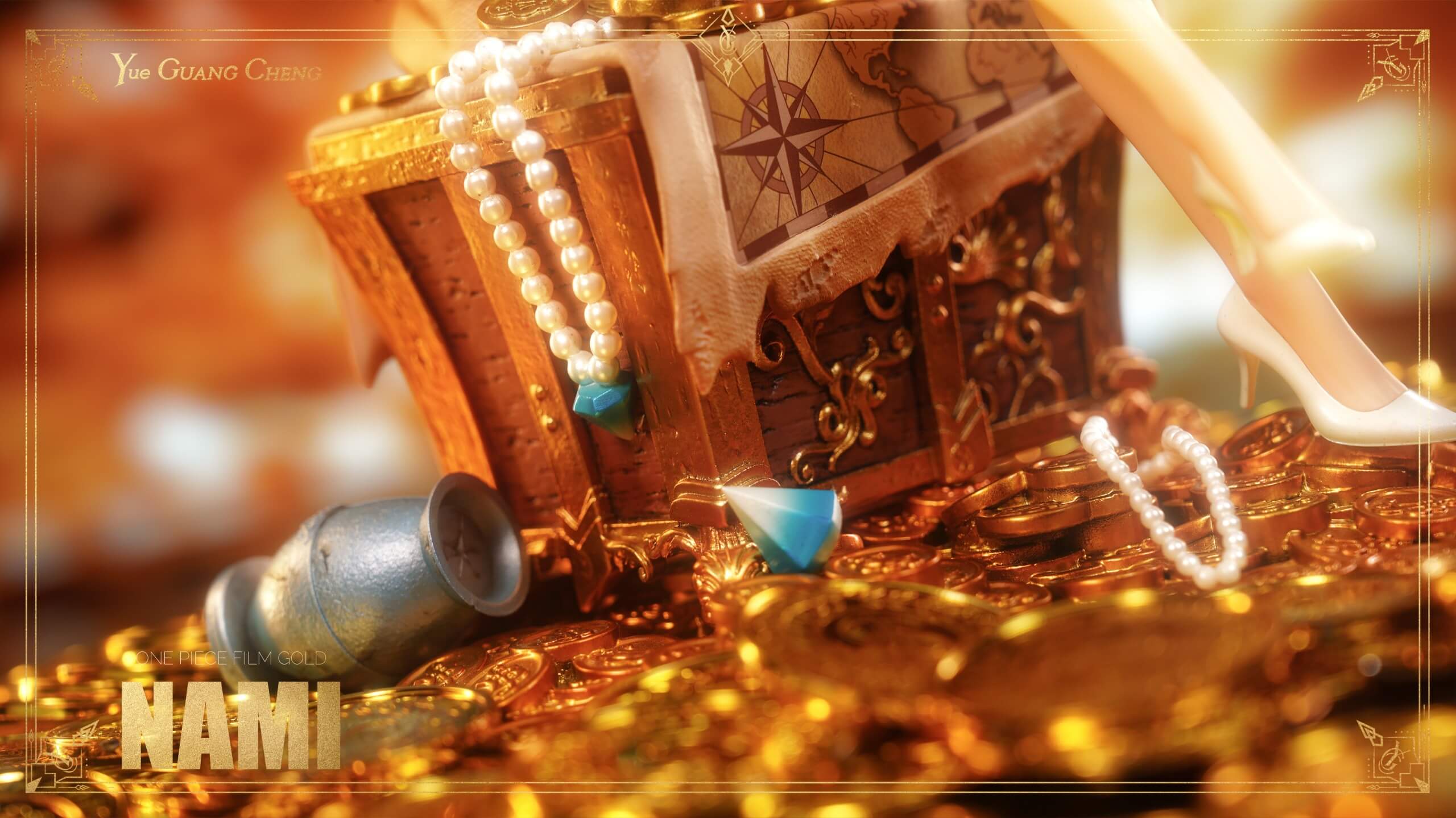 - Ornate treasure-chest base wrapped in vintage map canvas, overflowing with sculpted gold coins, pearls, and gemstones