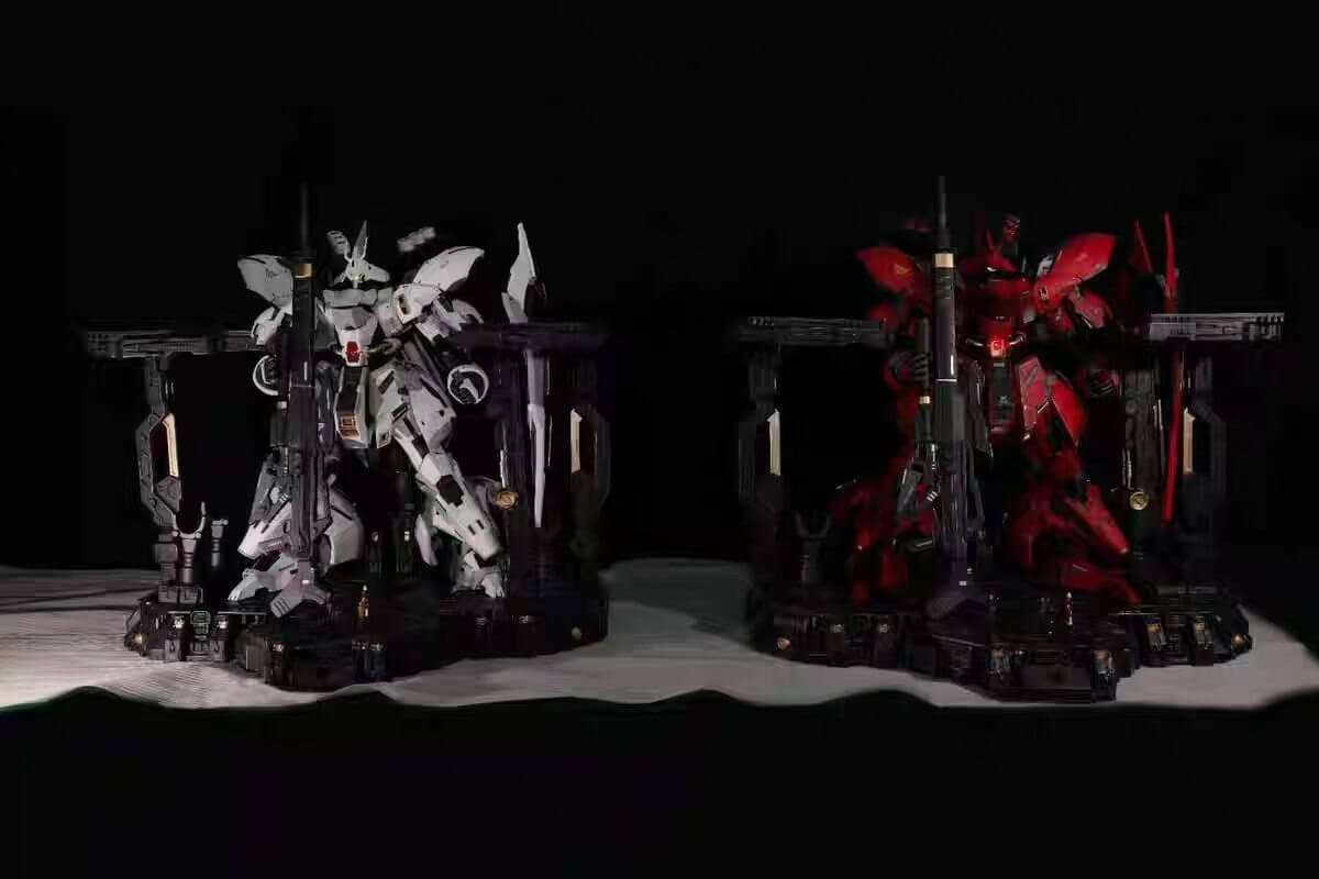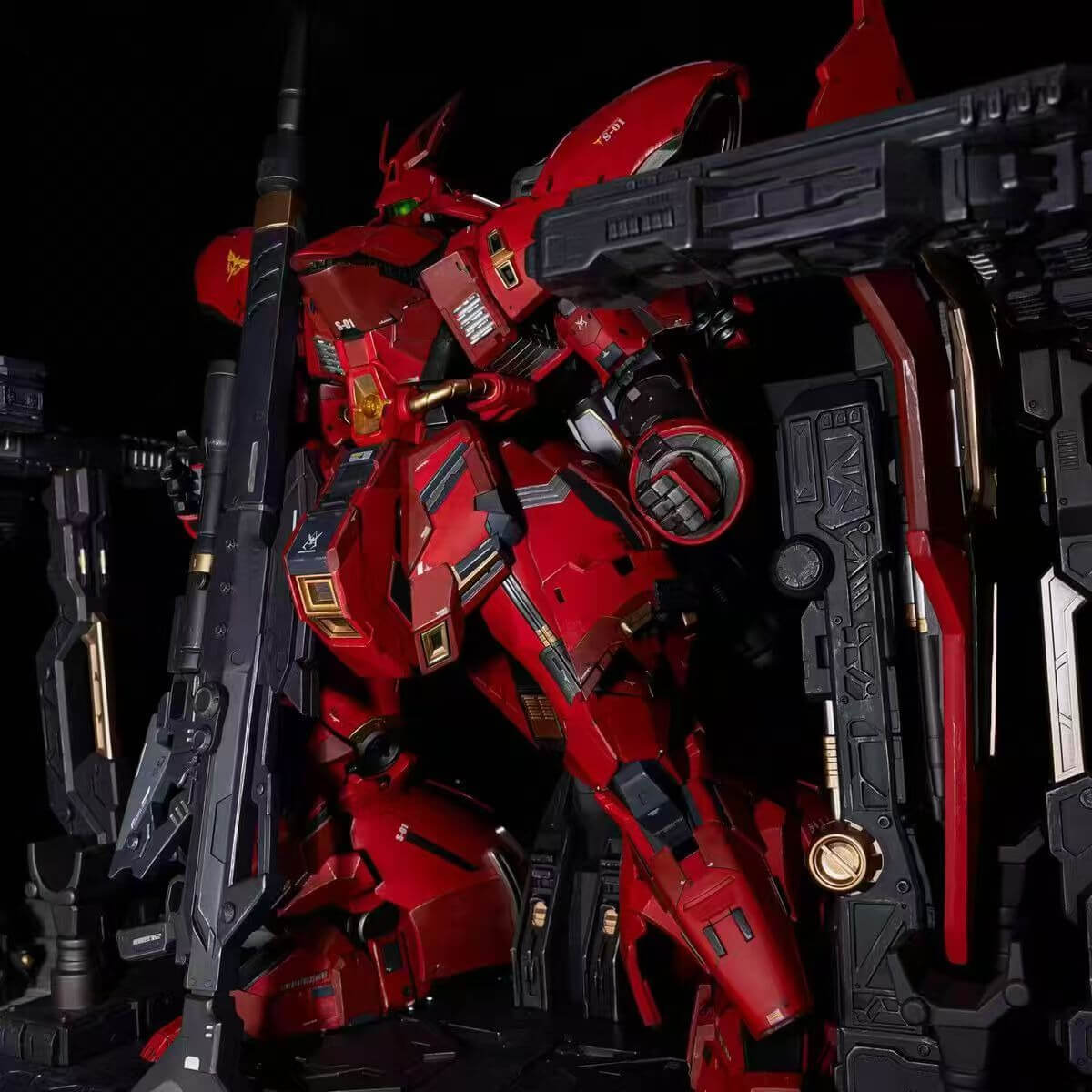 - Full Sazabi mobile suit sculpt in signature crimson red with dark grey and gold accent color separation