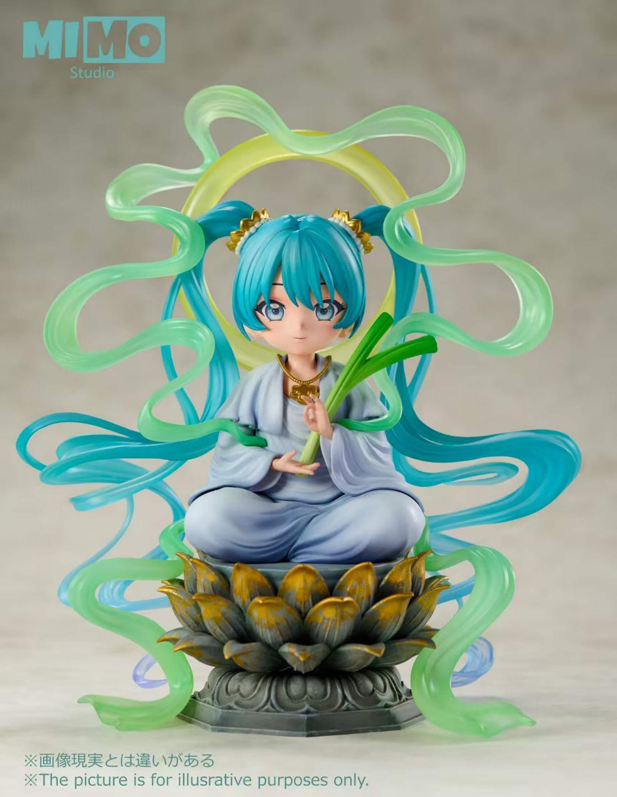 - Features a chibi-style Hatsune Miku seated on a weathered golden-bronze lotus throne