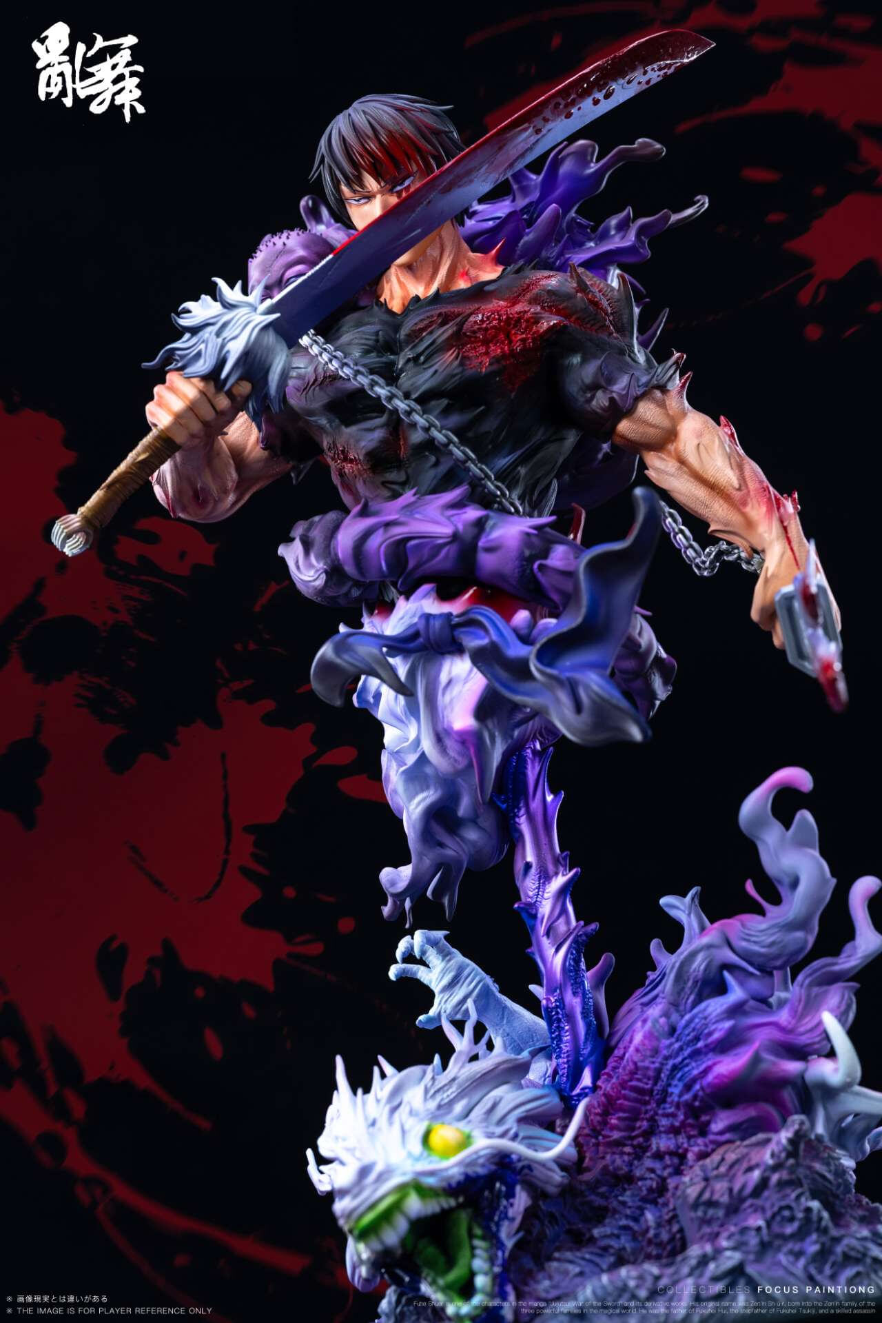 - Toji depicted mid-combat: katana gripped diagonally across the torso, chain weapon coiled in the opposing hand