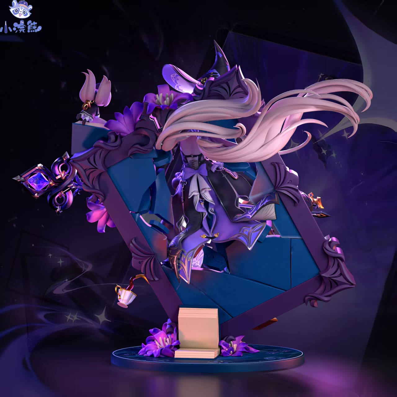 - Sculpted base incorporating stacked books, scattered arcane objects, and floral elements — the full scene reads as a single cohesive tableau rather than a figure on a platform