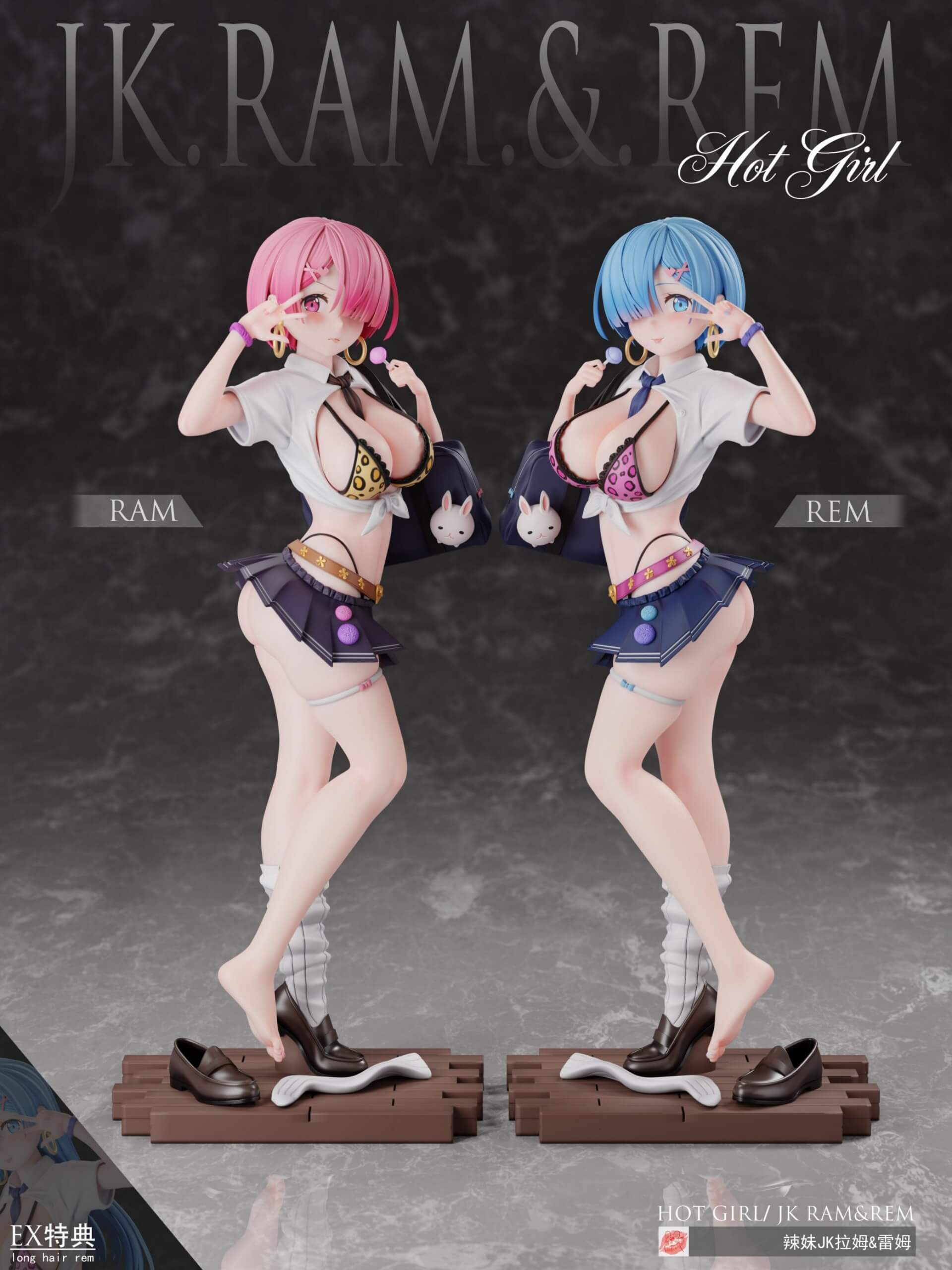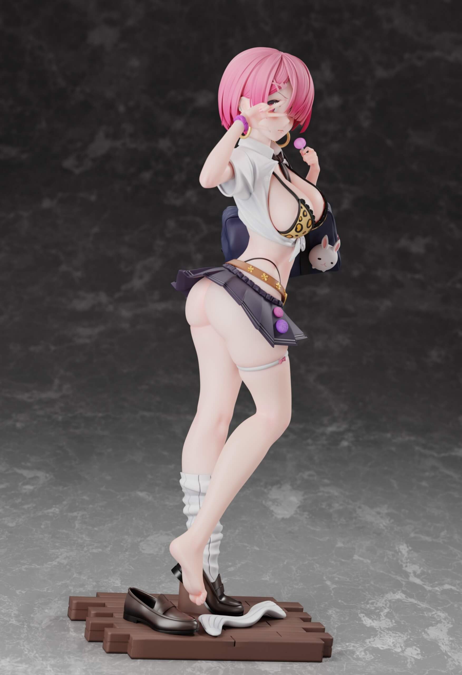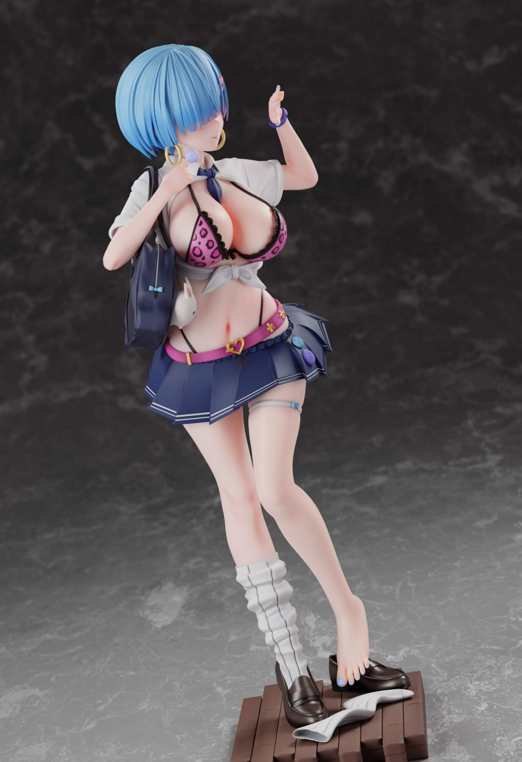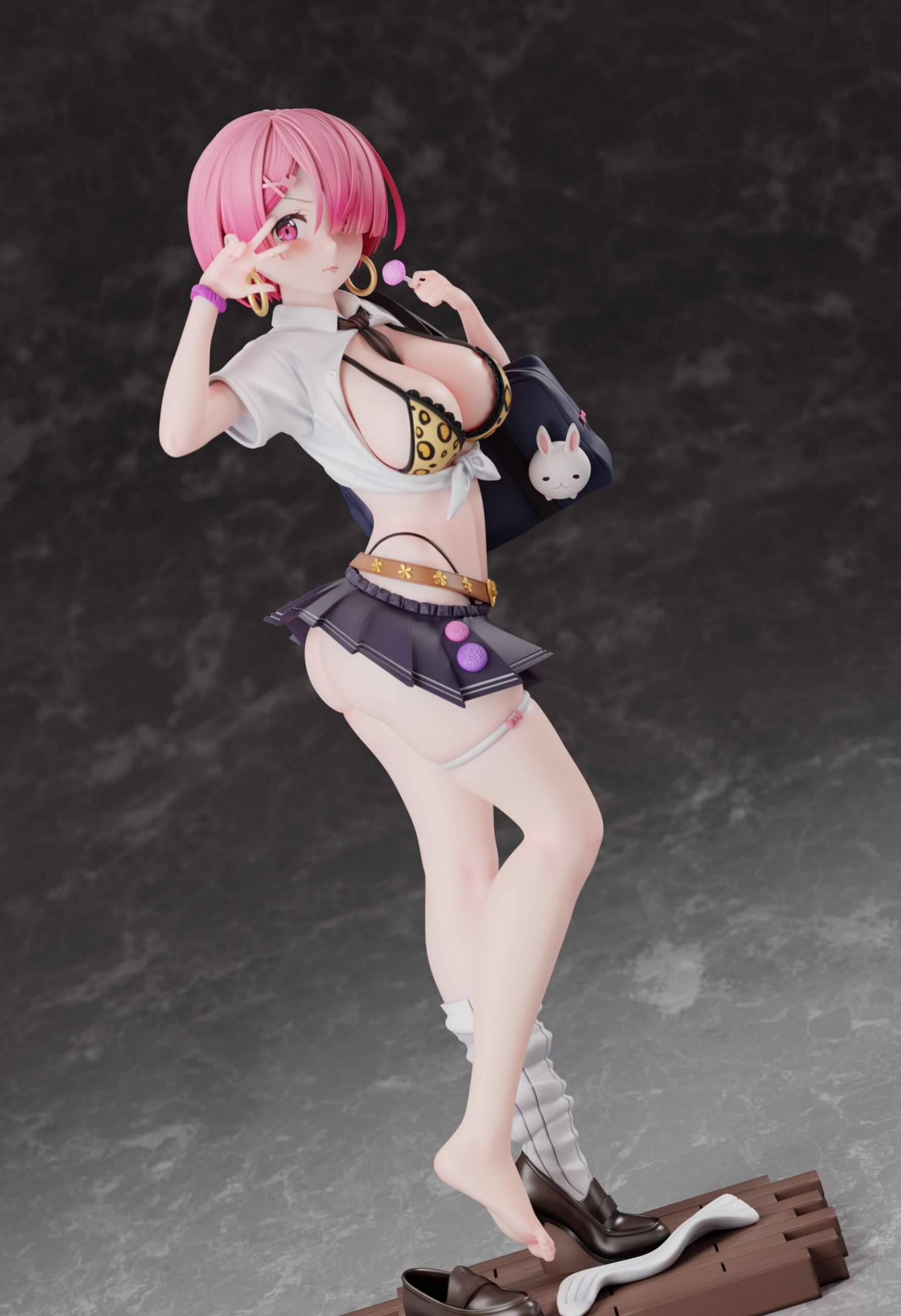 - Each figure is depicted in a gyaru-style school uniform with a tied shirt, leopard-print bikini top, and micro-pleated skirt.
