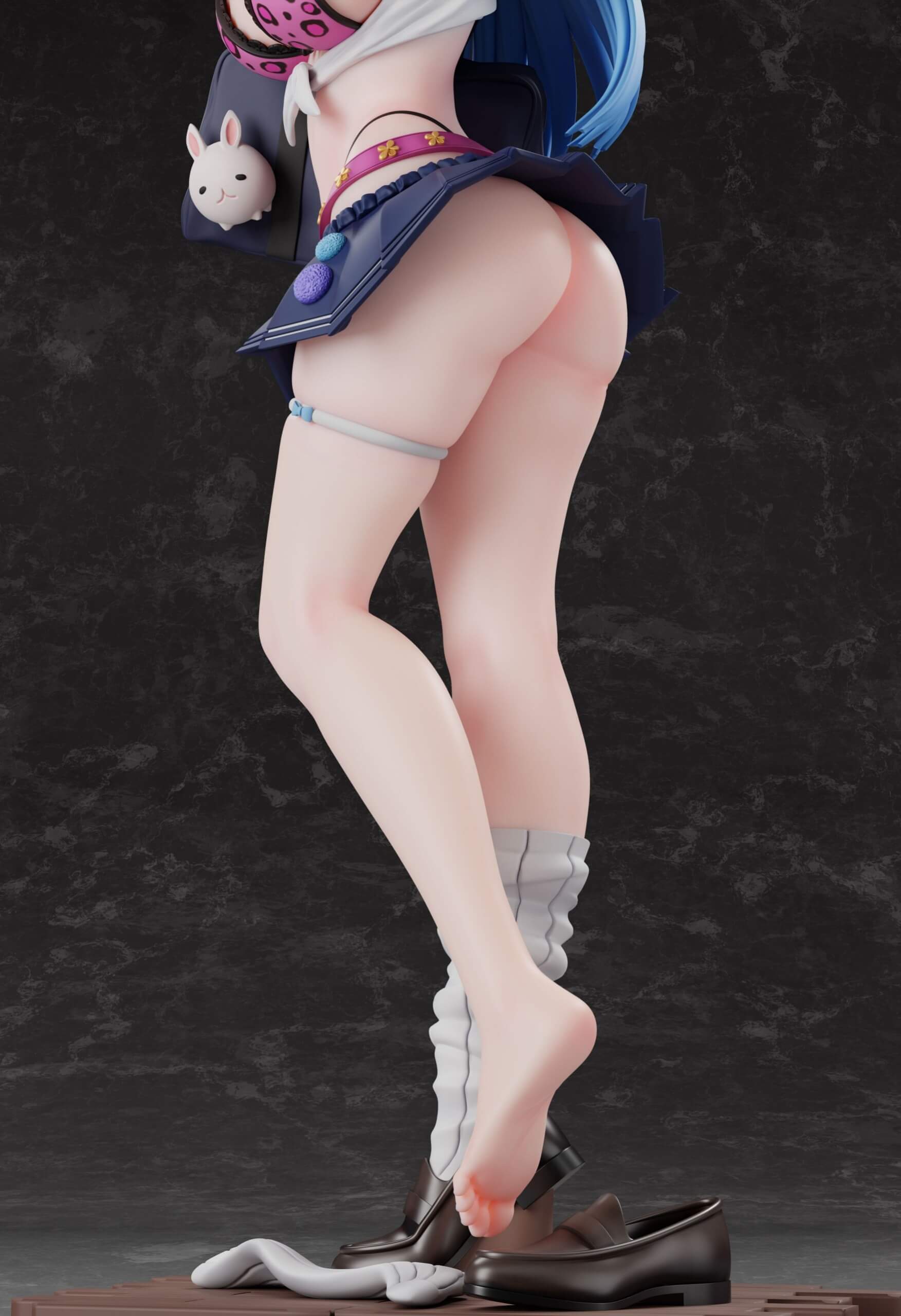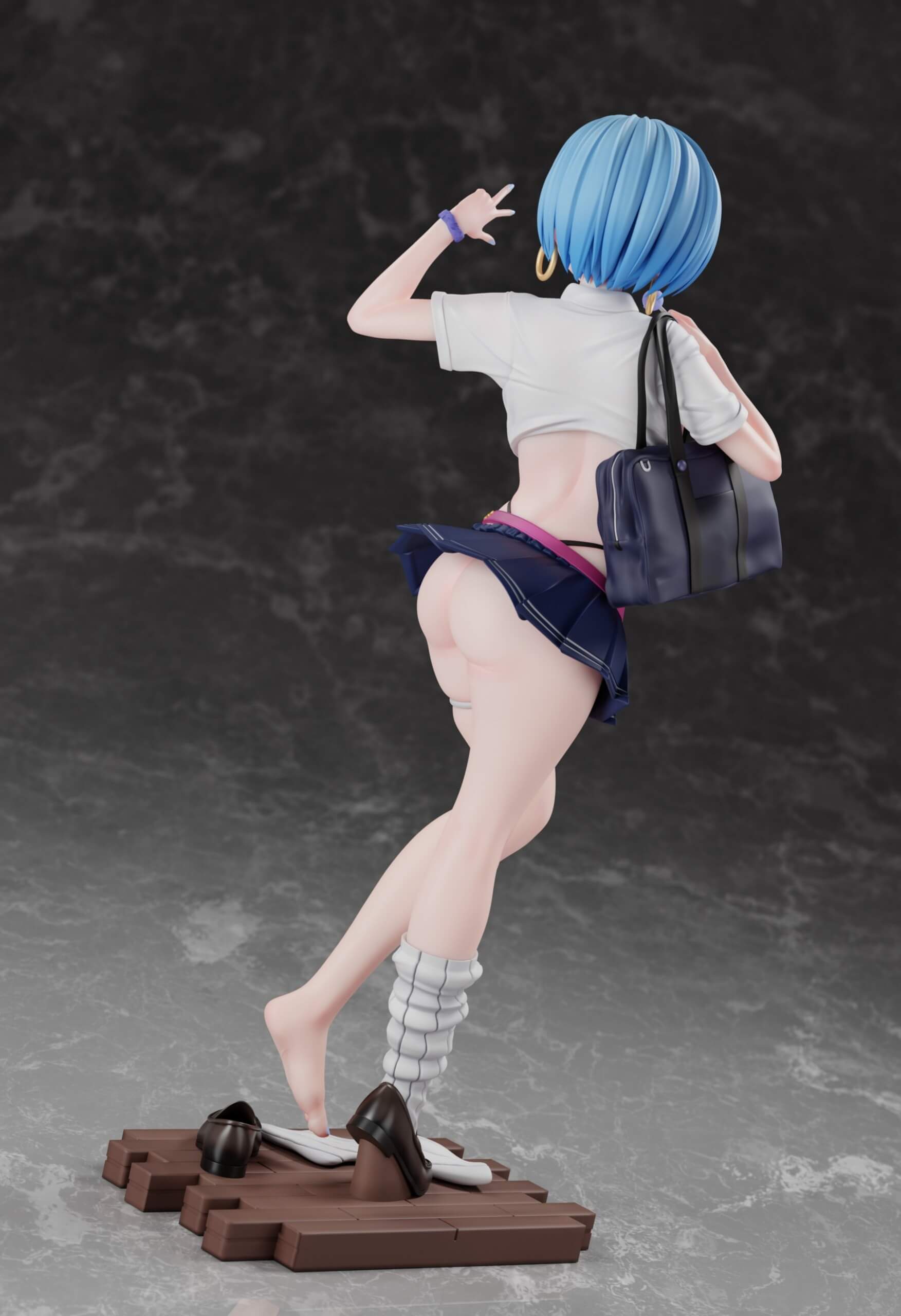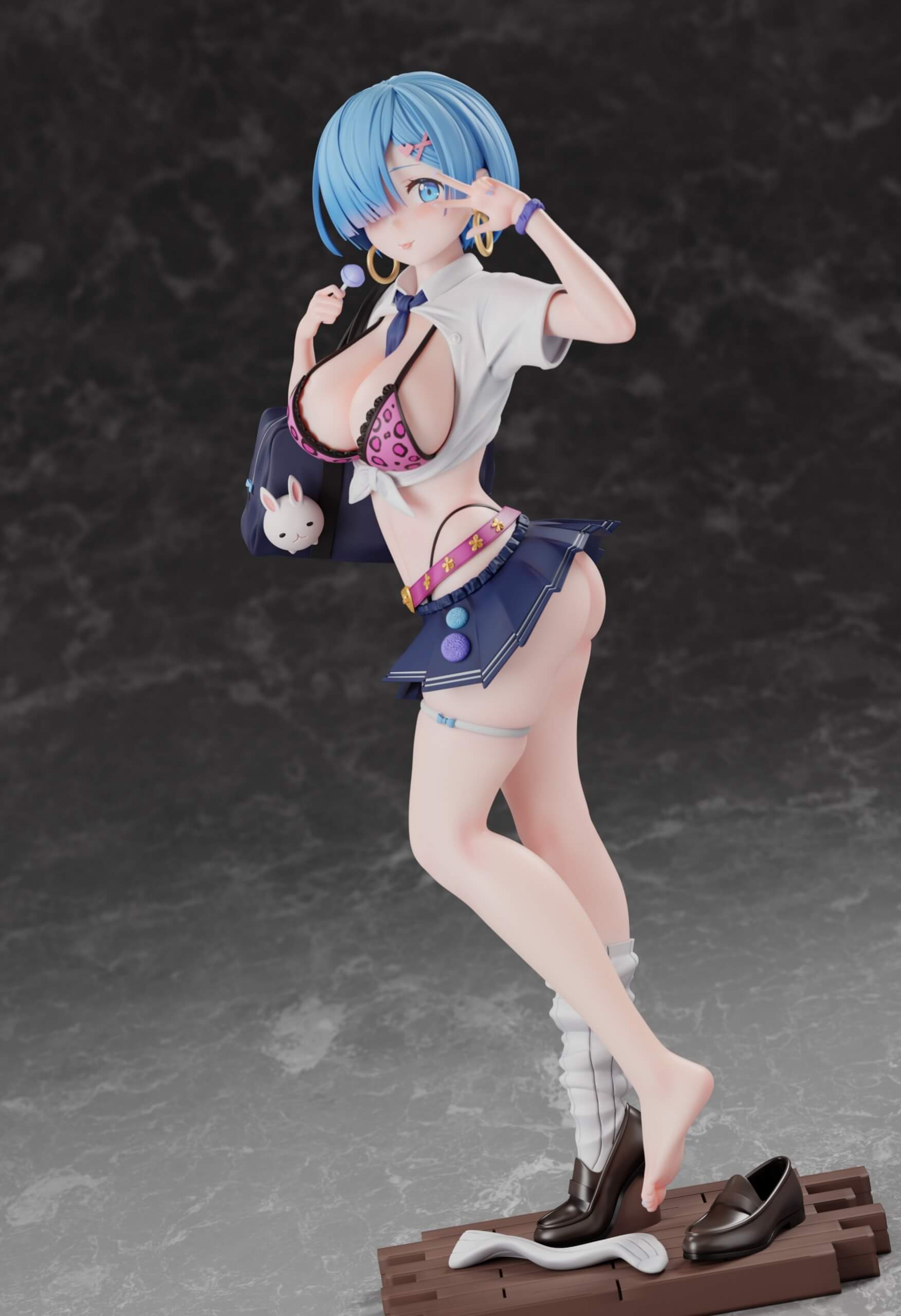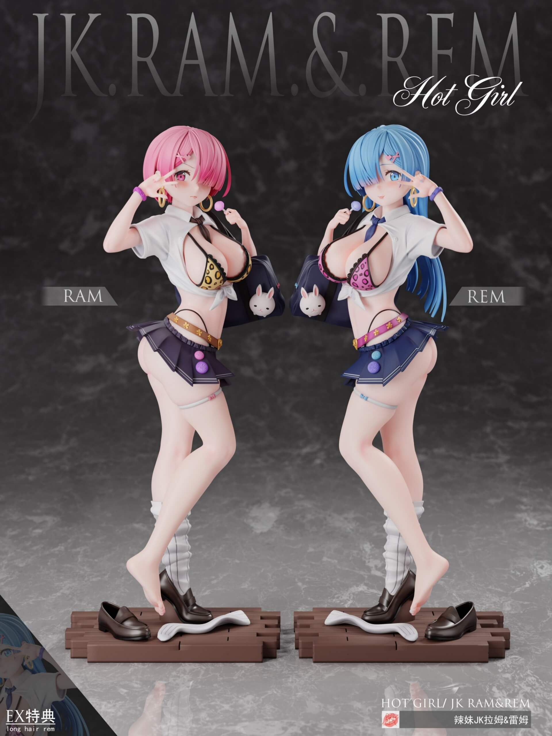 - Each figure is depicted in a gyaru-style school uniform with a tied shirt, leopard-print bikini top, and micro-pleated skirt.