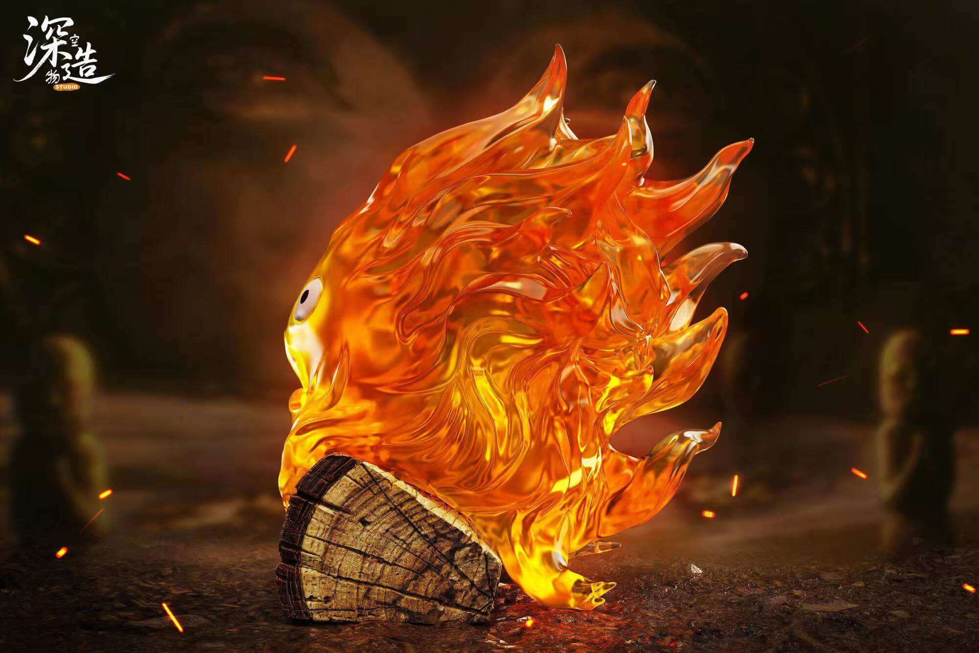 - Fully sculpted, translucent Calcifer perched on a charred log base, available in two display sizes.