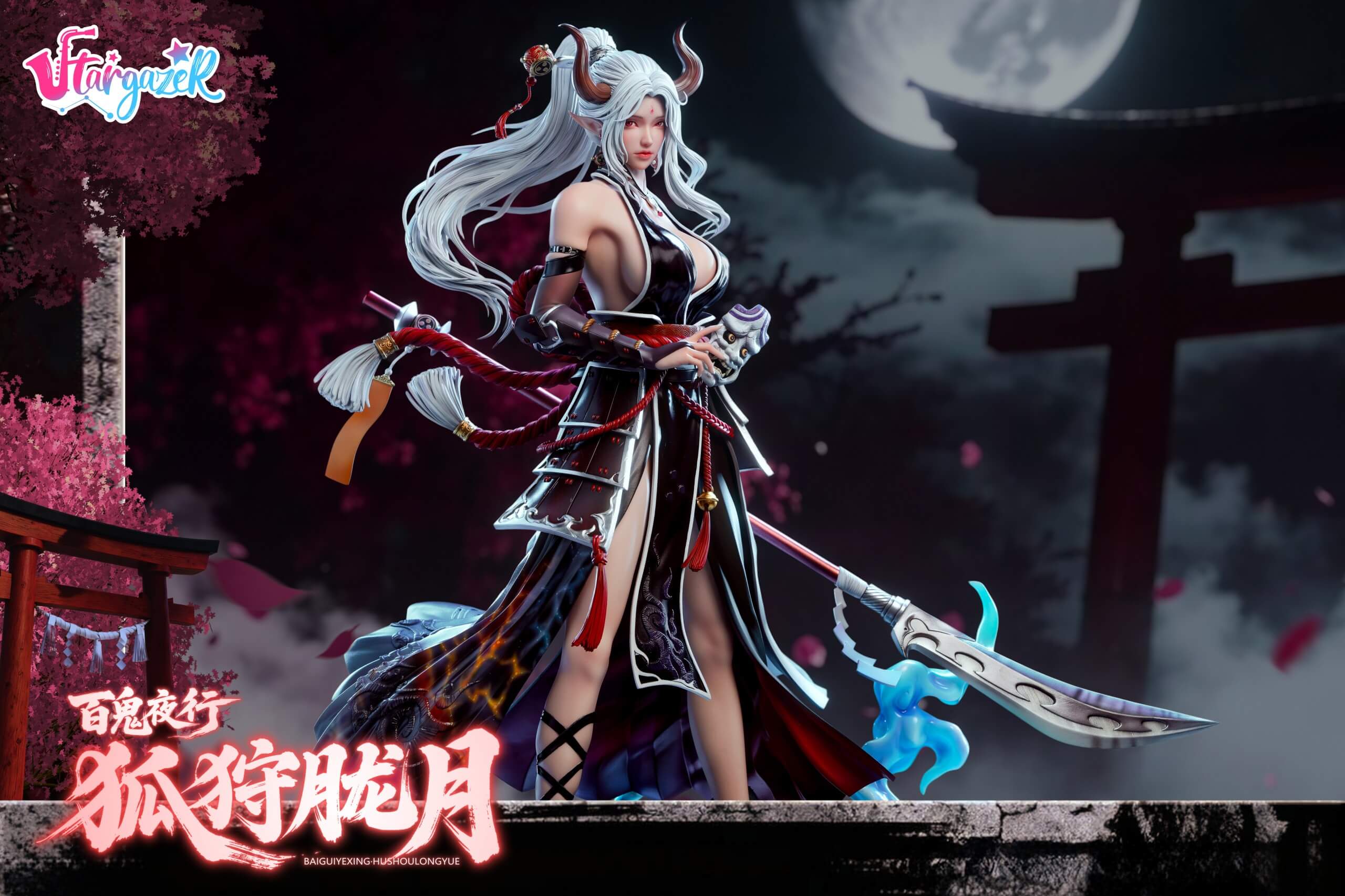 - Detailed head sculpt with flowing silver hair and oni-style horns
