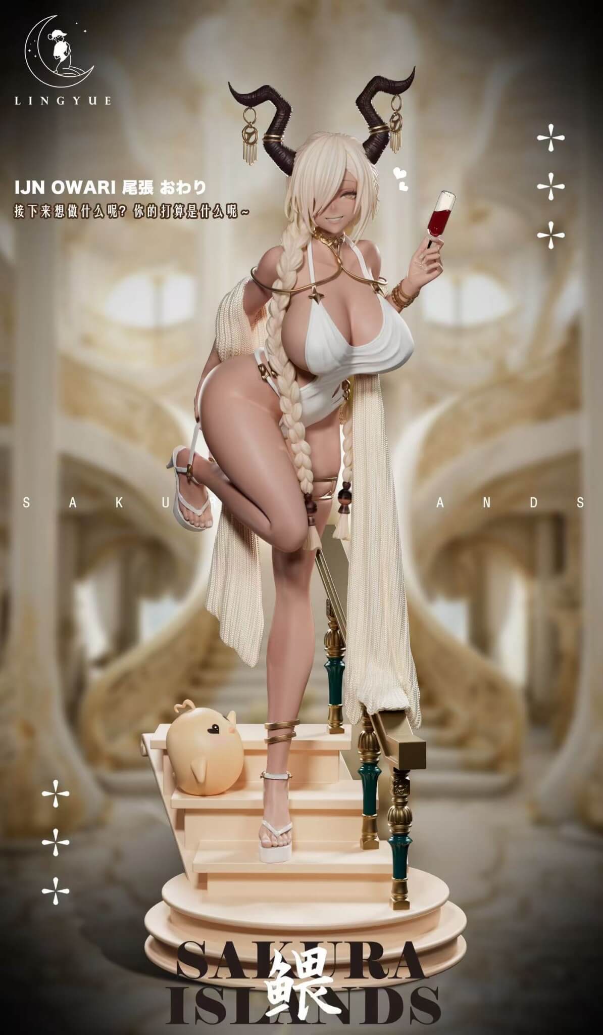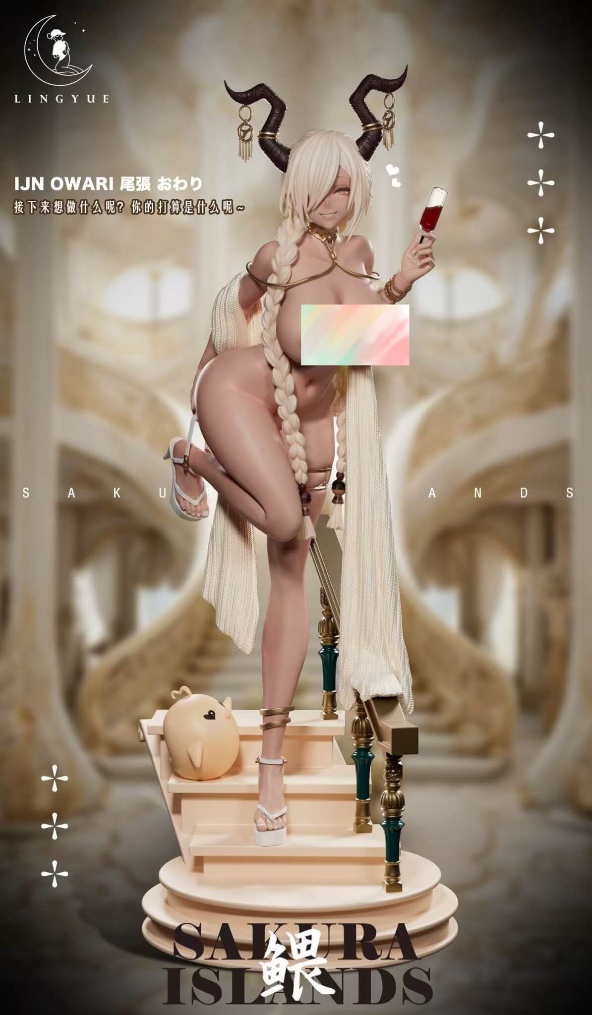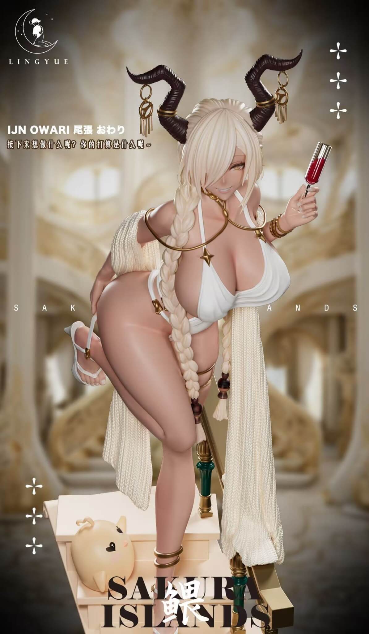 - One (1) Owari main statue with moon-tan skin, braided oni horns, and tied micro-wrap swimsuit