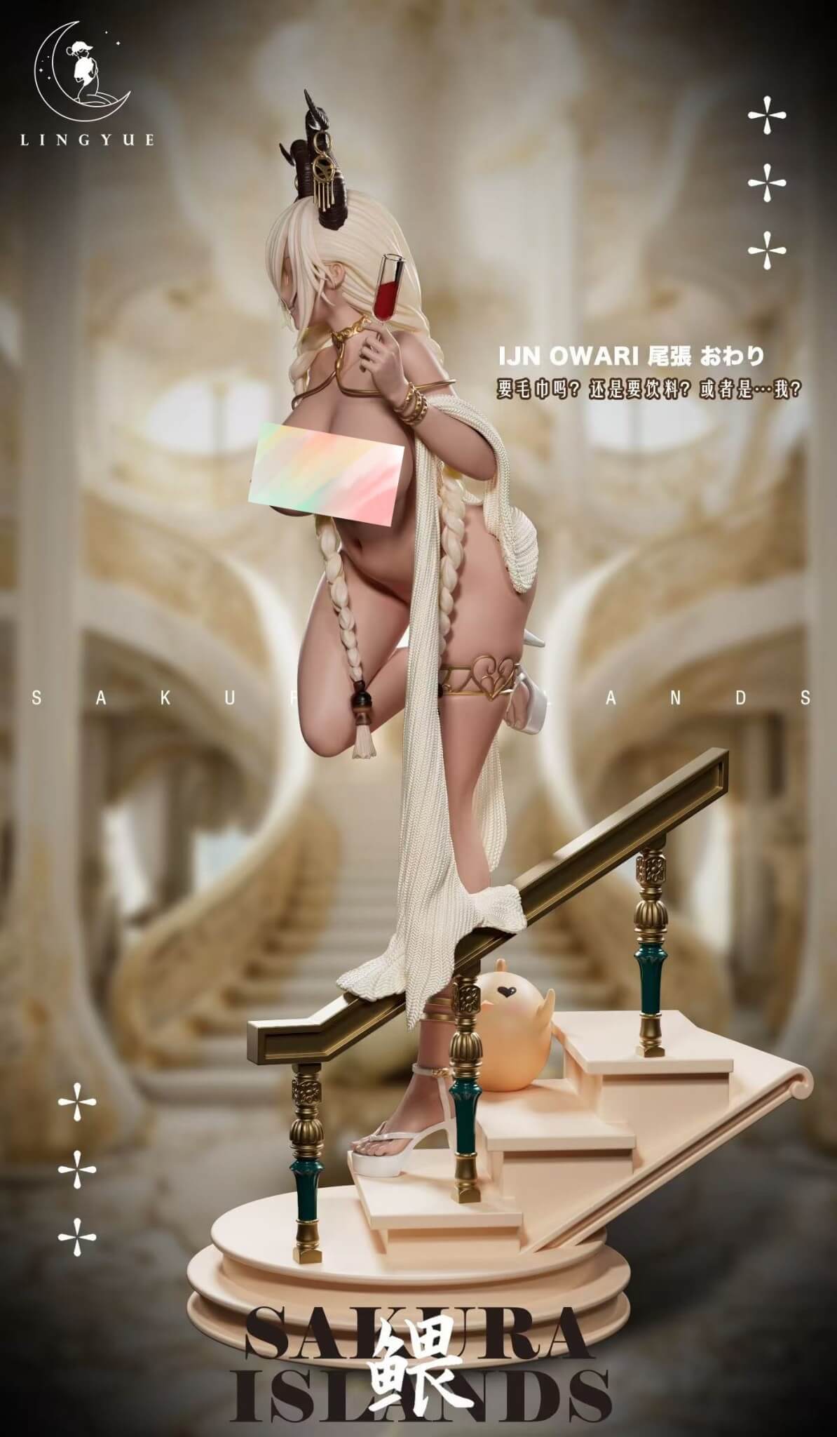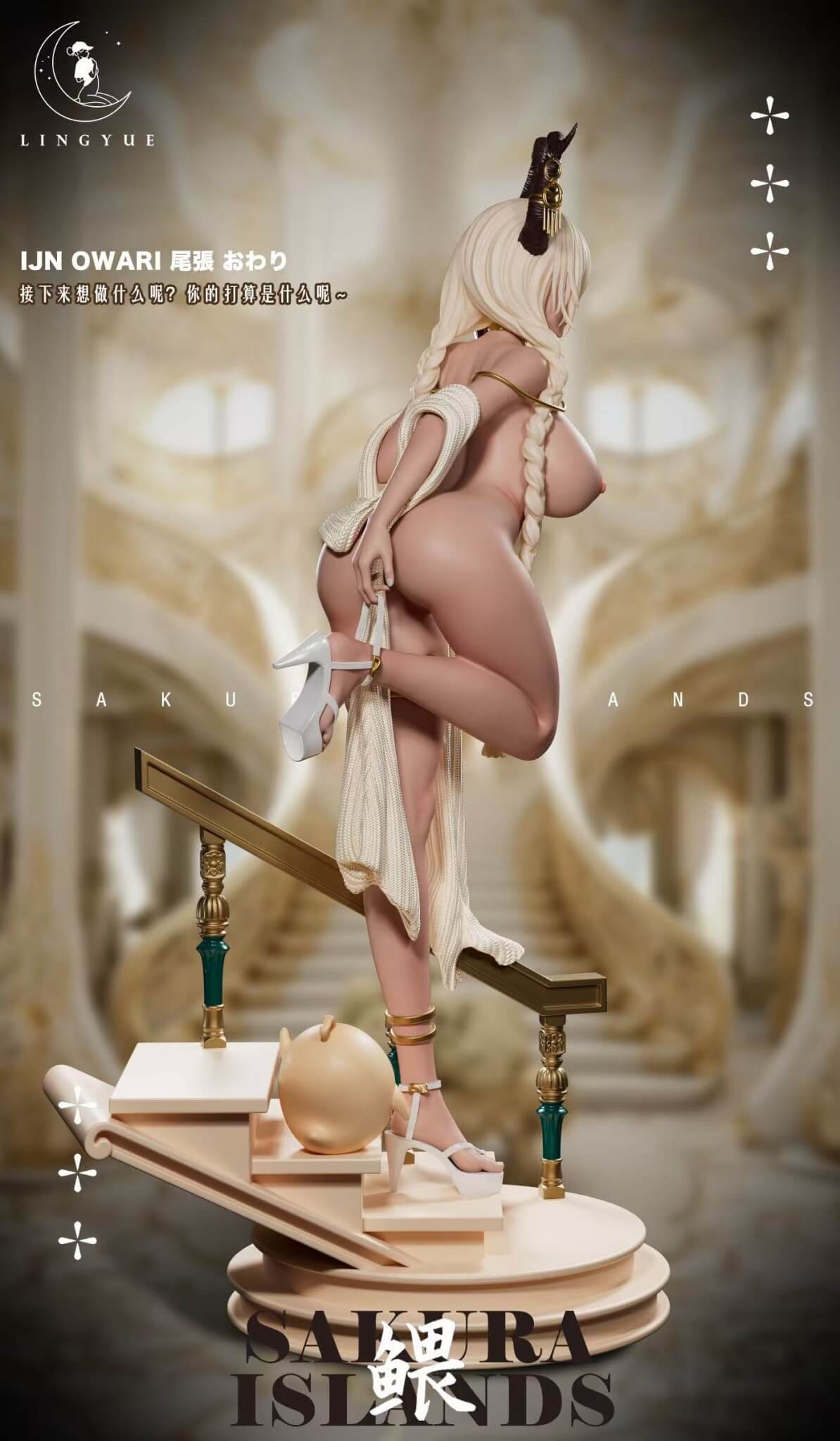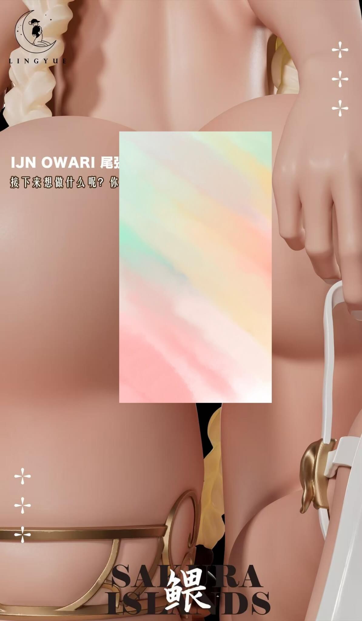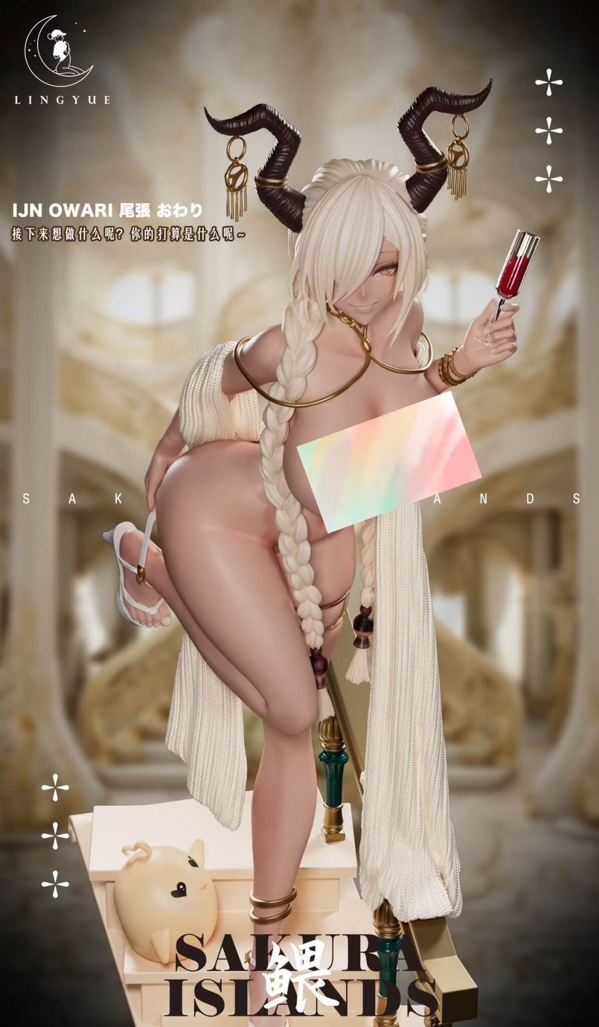 - One (1) Owari main statue with moon-tan skin, braided oni horns, and tied micro-wrap swimsuit