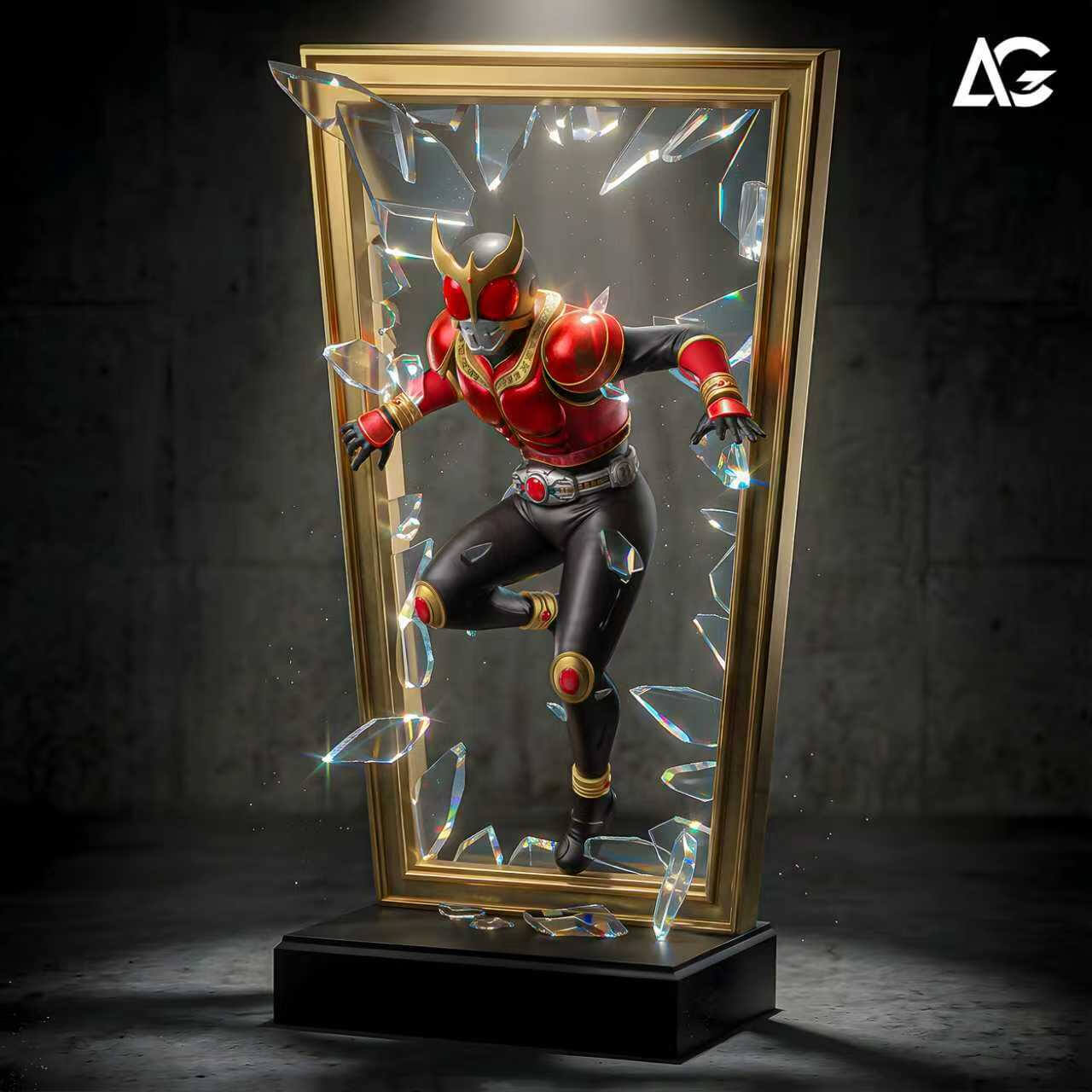 - Gold-framed shattered glass backdrop โ clear resin shards suspended at multiple depths, catching and scattering light from every angle