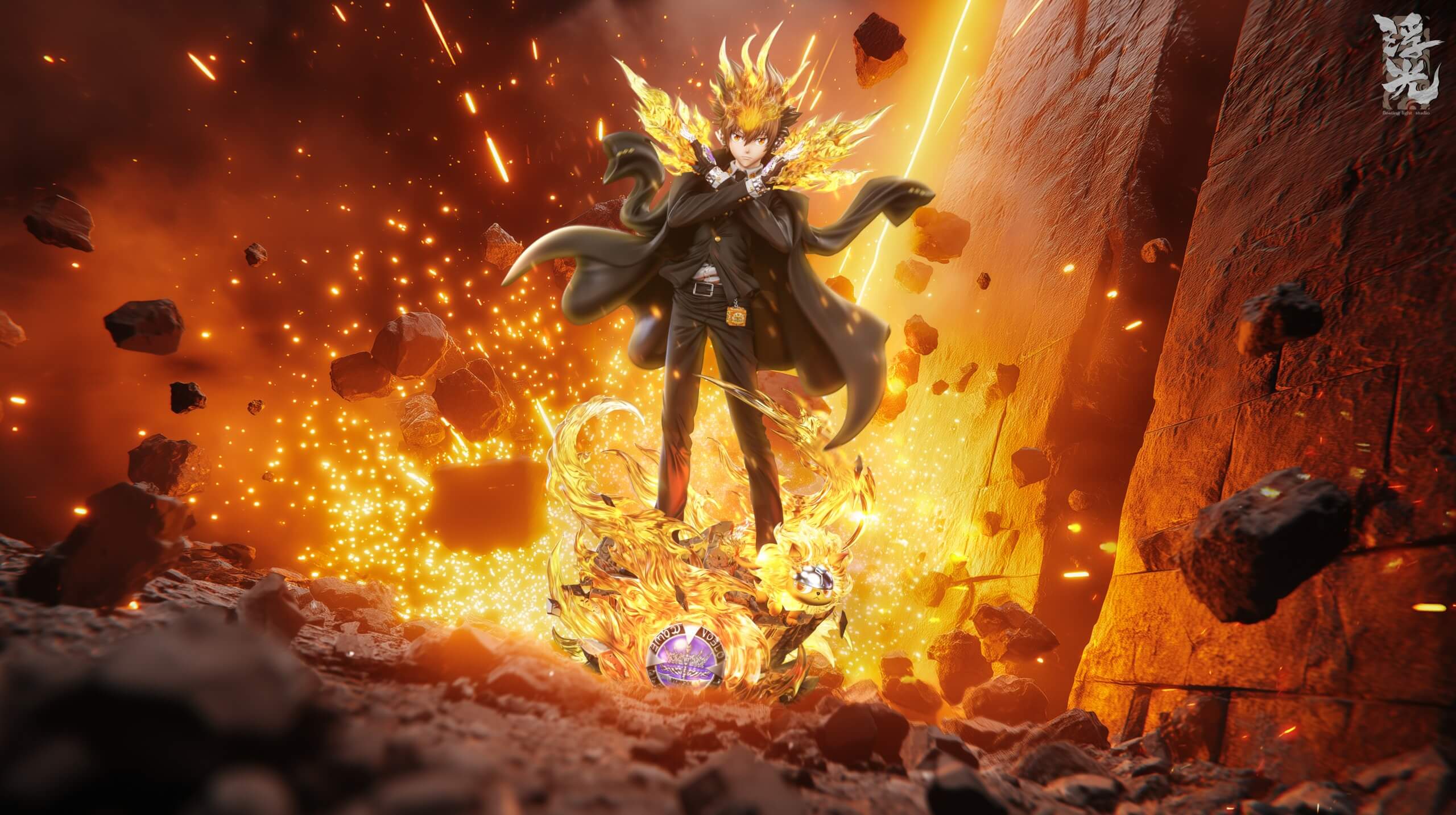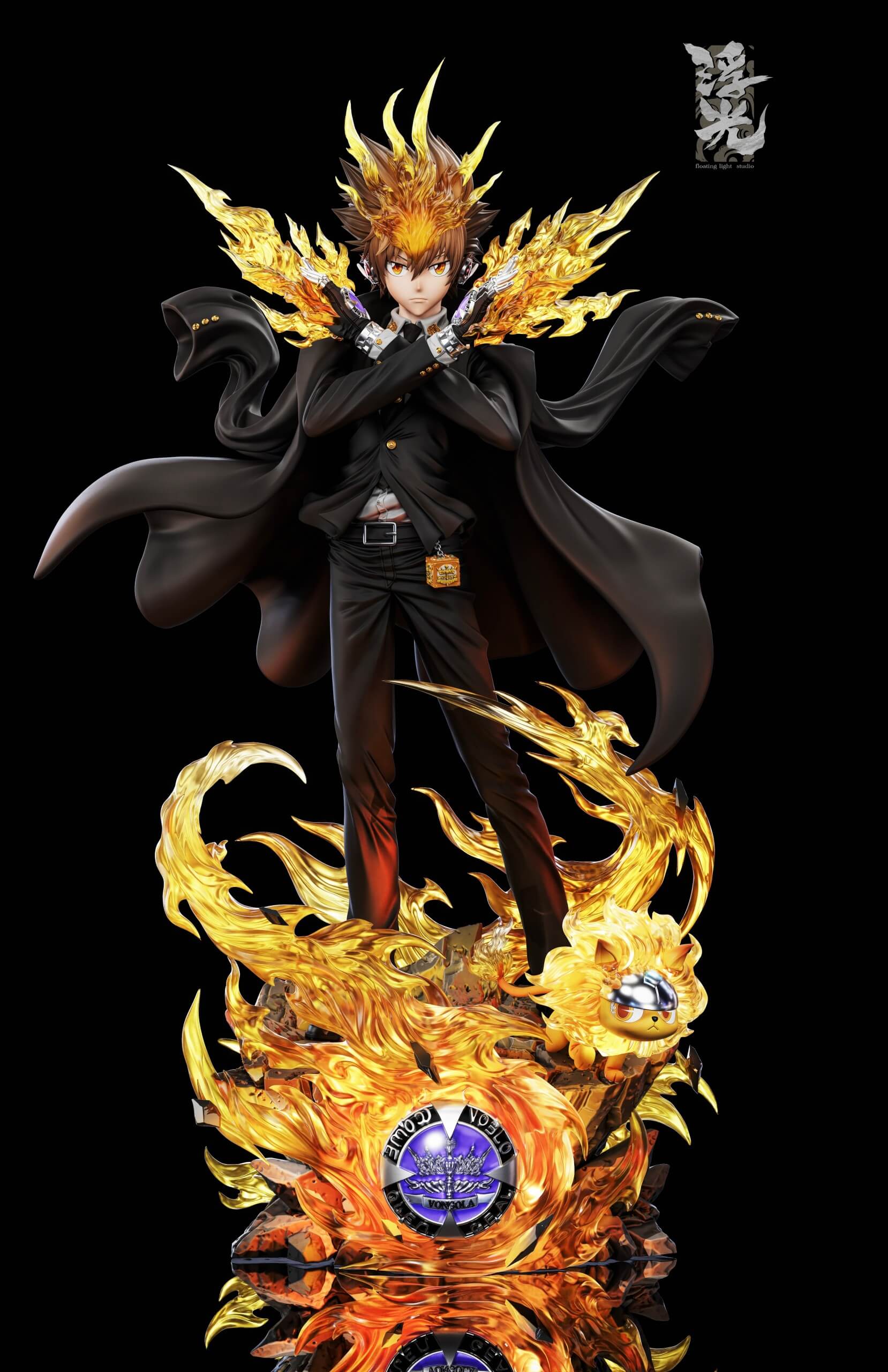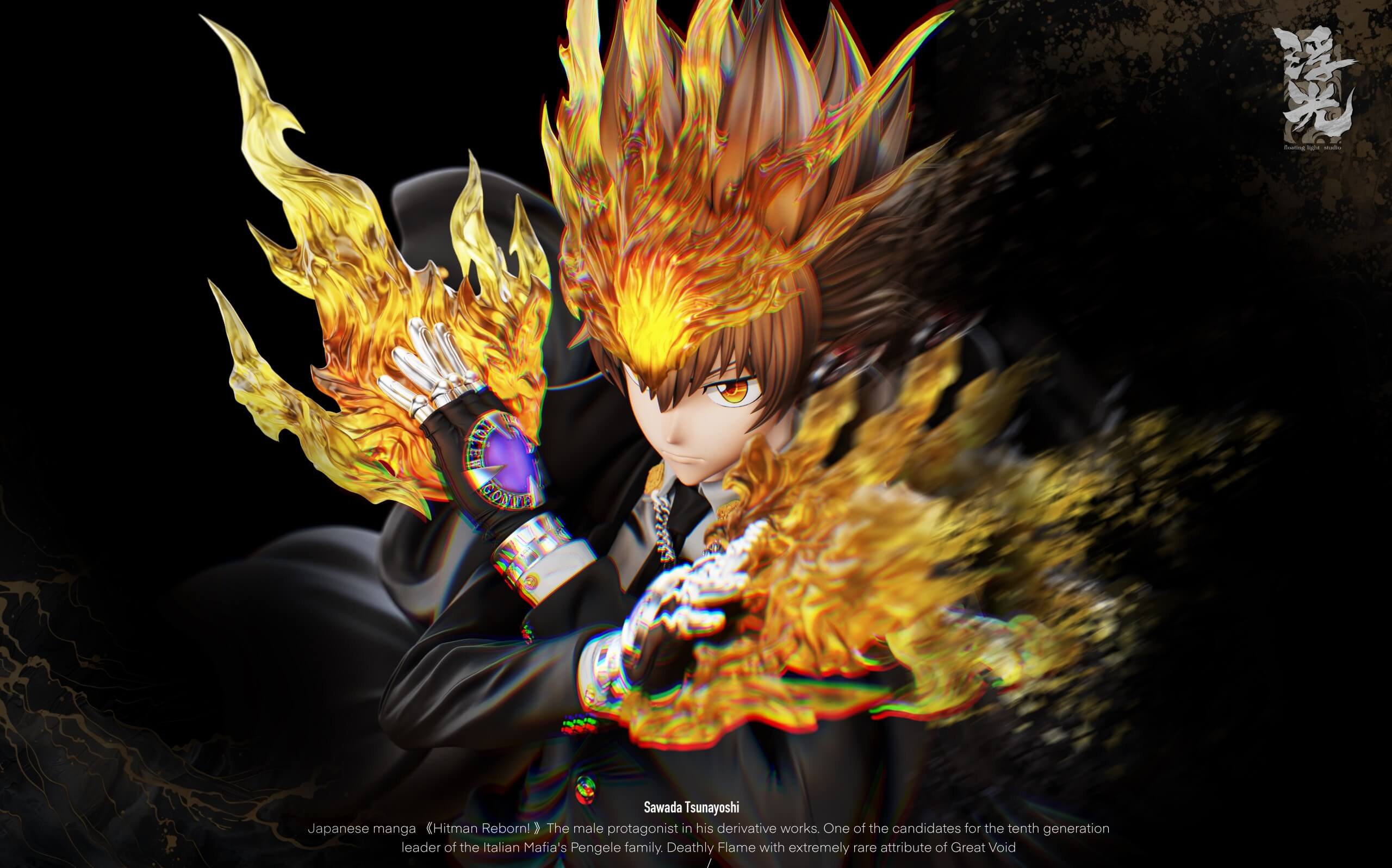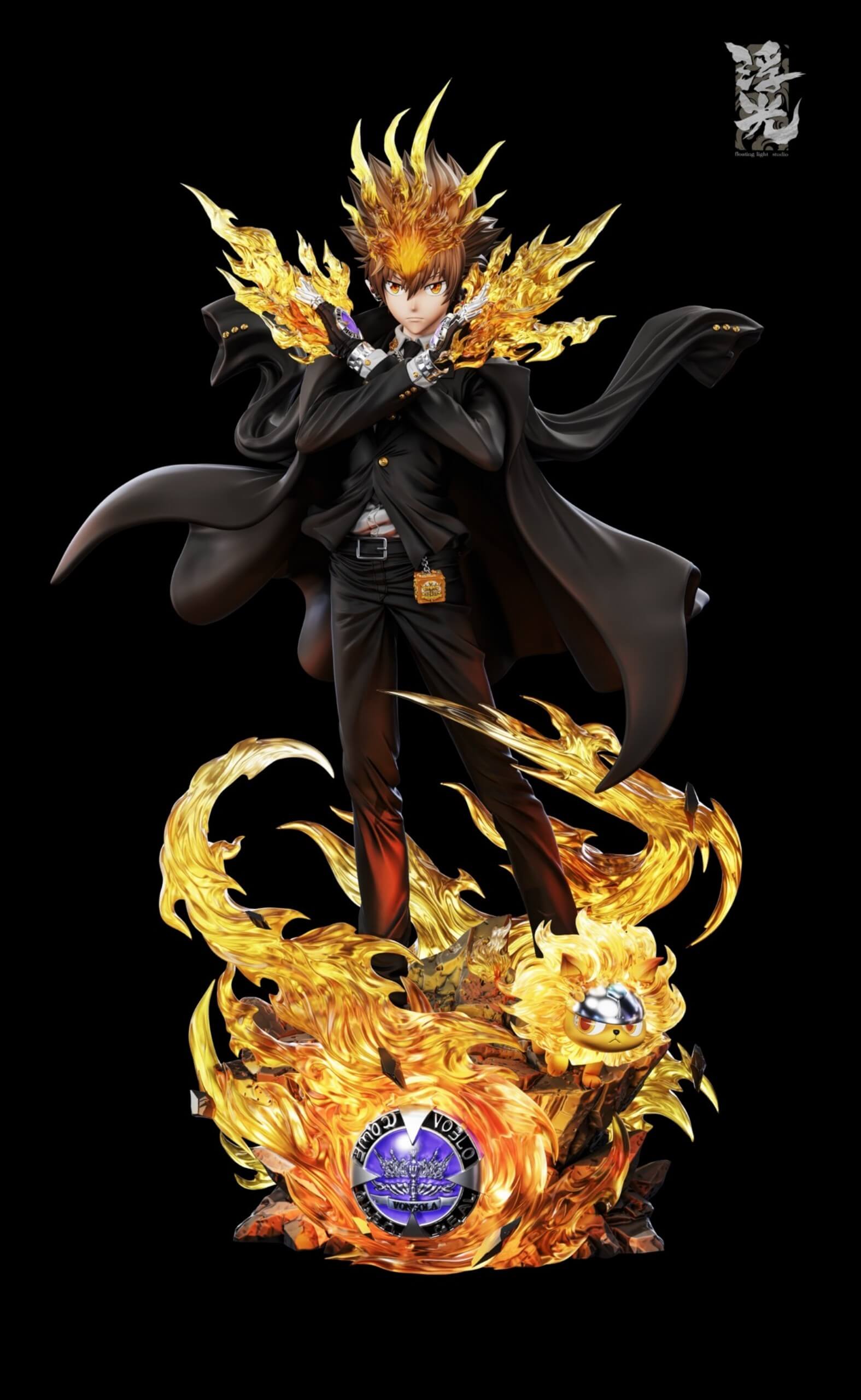 - Fully sculpted Tsunayoshi Sawada figure enveloped in translucent orange Great-Vongola flame effects