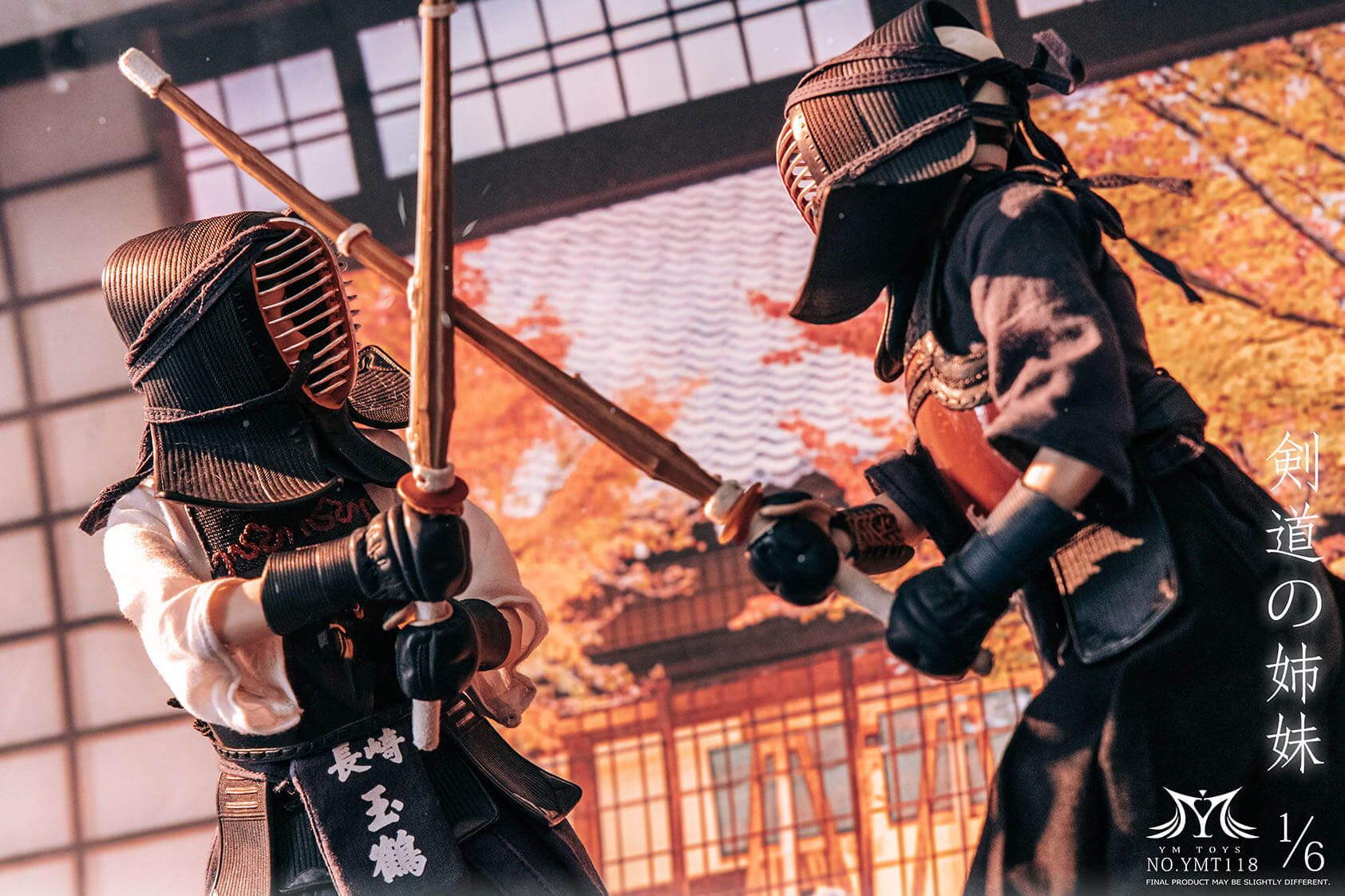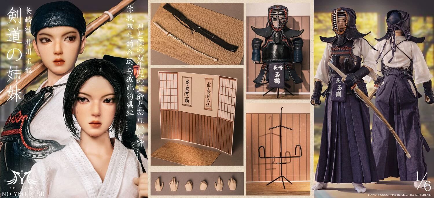 - Tama Tsuru (YMT118B): Features a white top with dark hakama, deep black chest armor with red edging, and a waist banner displaying “长崎 玉鹤” (Nagasaki / Tama Tsuru).