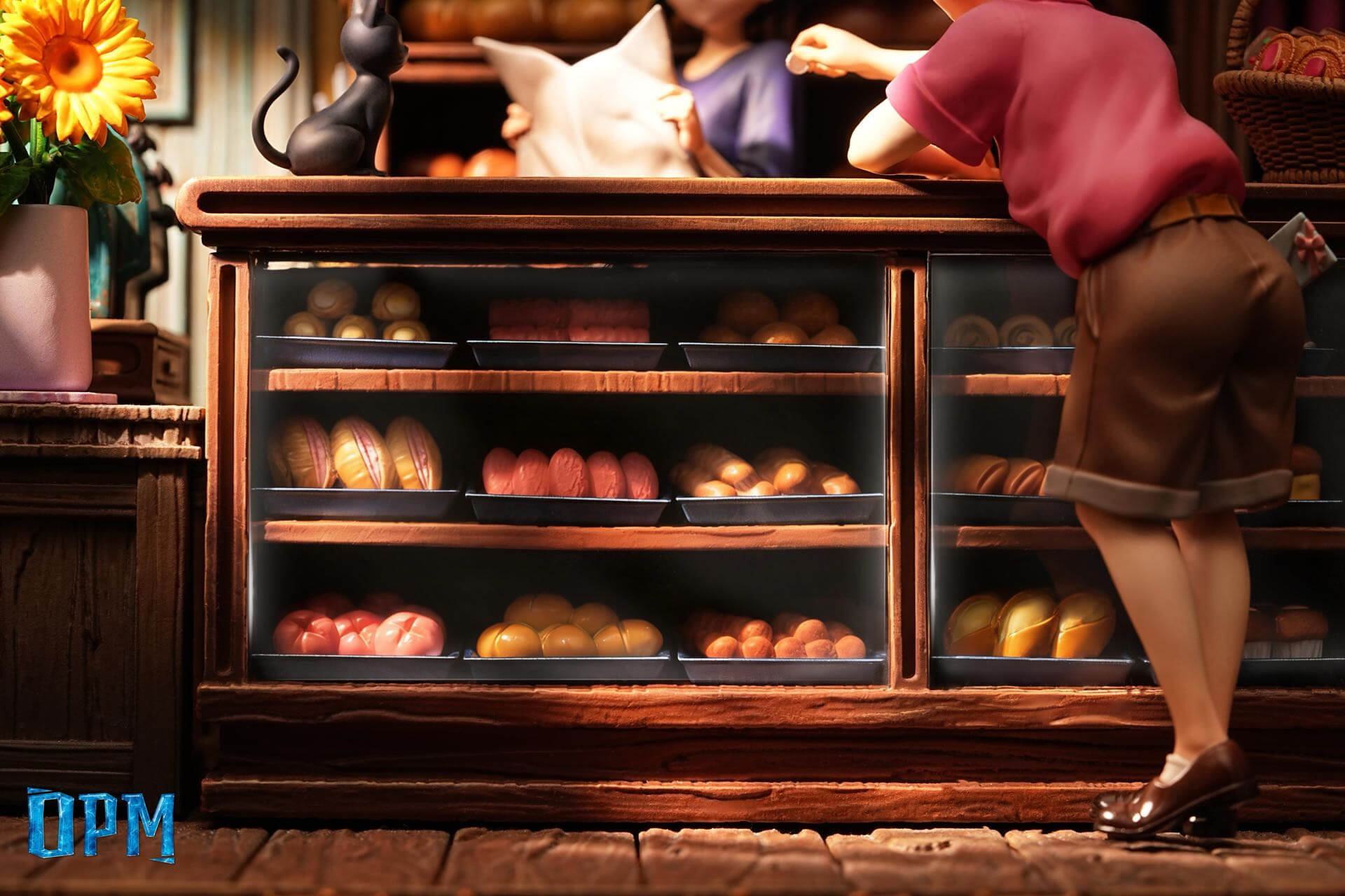 - Full bakery diorama base — floor-to-ceiling shelving packed with individually sculpted and painted loaves, pastries, jars, and baskets; glass-front display case with transparent panels revealing tiered trays of breads; vintage teal cash register; sunflower arrangement; wall shelving with bottled goods; wooden plank flooring and wallpapered walls; side door and greenery visible at frame edges