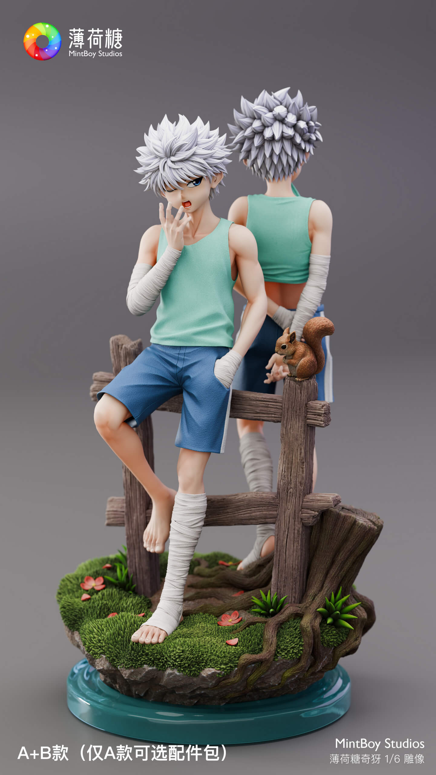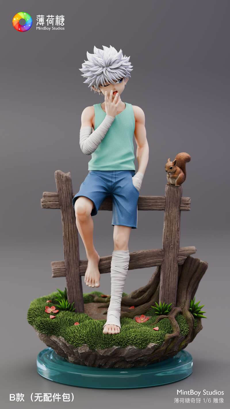 - Killua in standing pose — teal tank top lifted to expose bandaged torso, shorts, and wrapped lower leg